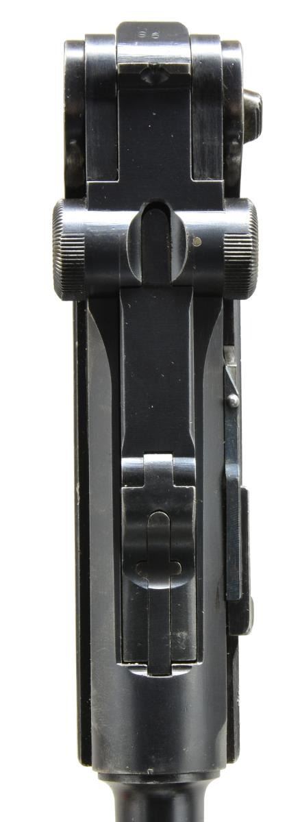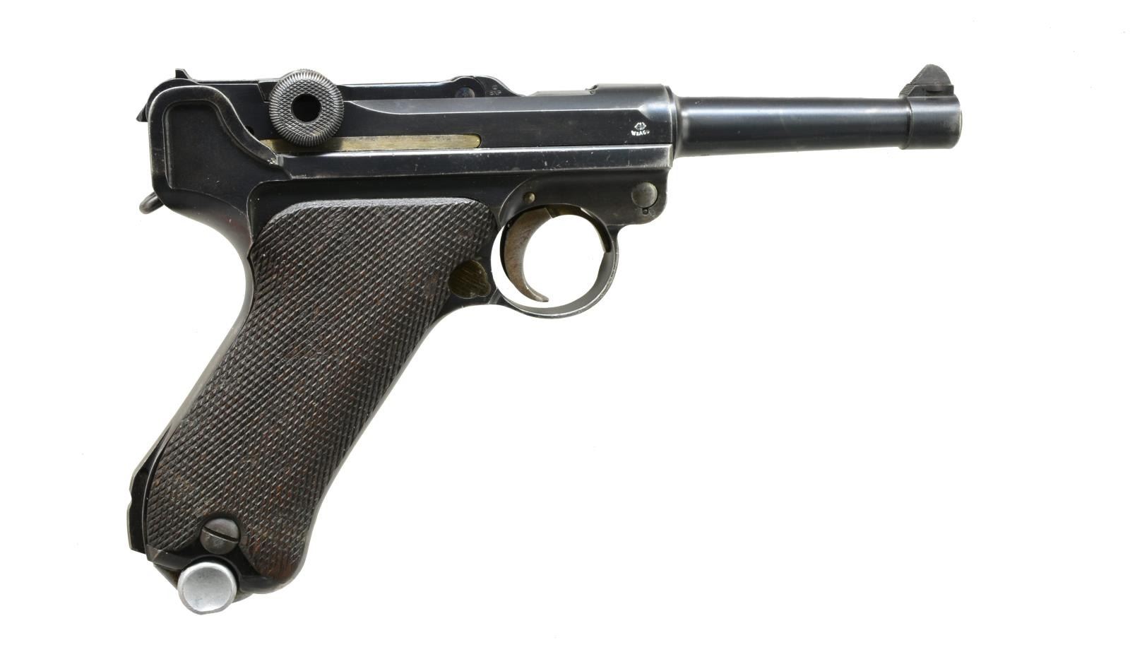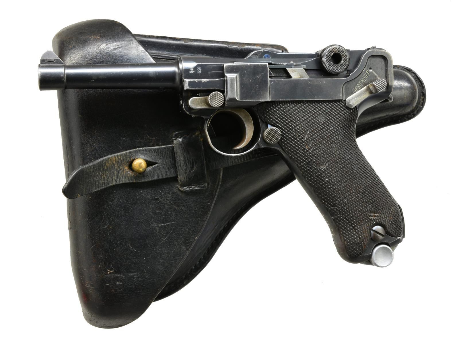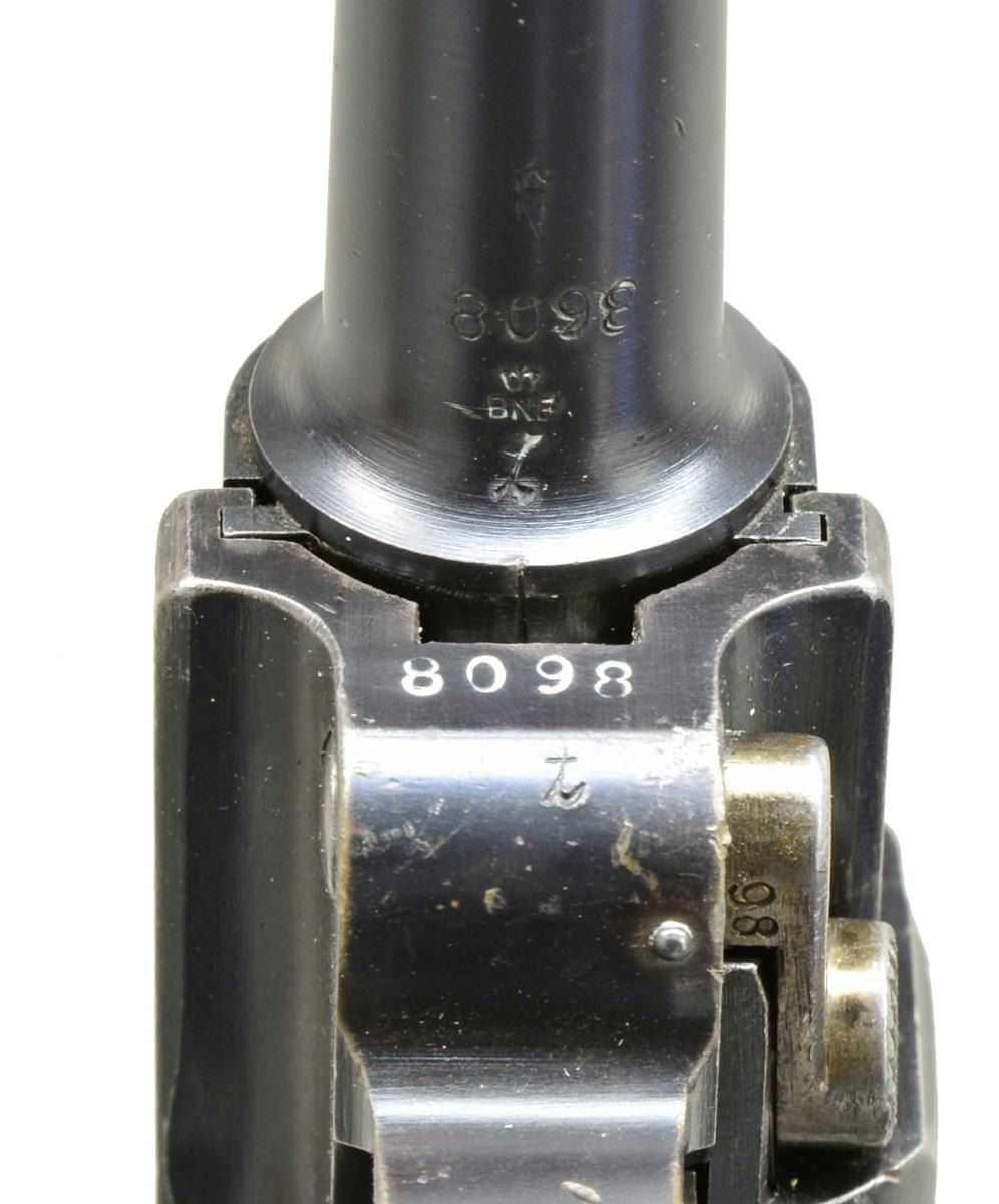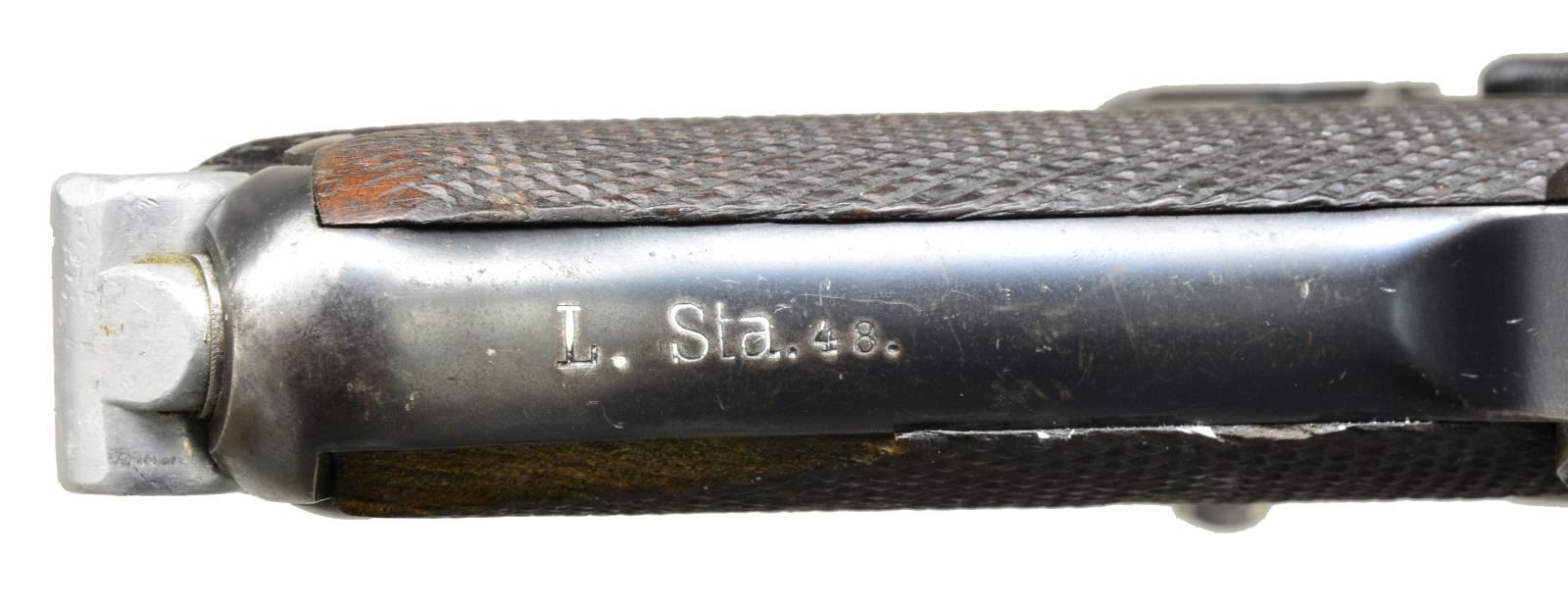SEMI-AUTO PISTOL. Cal. 9mm Luger. S# 8098t. Bbl. 4”. Unmarked Mauser rework (blank chamber & toggle) of original 1929 era DWM Mauser Military model, which was mfg. by Mauser from mostly existing DWM parts. 1933 Era rework having "Sneak" aspect of unmarked toggles & chamber. Prussian front strap marking "L.Sta.48." indicating Landgajerei (Prussian state police) Stade (Administrative district) & 48th firearm. Fitted w/ rework sear safety but no mag. safety. "GESICHERT" in upper safe position & extractor marked "GELADEN". Numbered parts done in commercial positions. Full matching number on bbl. along w/ German crown N & British crown BNP proofs. Matching numbered trigger, rear toggle, takedown lever & side plate. Extractor numbered "26". Balance of components not numbered including gas grooved firing pin. Right front of receiver has appropriate WaA66 proof; left side w/ crown N & crown BNP proofs (both proofs also on breech block). Checkered walnut grips; much darker left. MAGS: fair to good tin plated 8 rd. w/ aluminum base numbered “8098”plus “1”. UNATTACHED ACCESSORIES: very good black flap holster w/ stud & strap retention. Between belt loops marked “OTTO SINDEL“ over “BERLIN” over “1933” over sunburst. Top of holster at rear is crossed out unit marking above lg. “1258”. CONDITION: good plus appearance w/ light high point wear & occasional light impact marks plus slight dent at left front of trigger guard. Gray faded straw colors for trigger & safety lever; others more vivid. Very good appearing toggle assembly & bbl. Beginning patina appearance on back strap & spot of finish loss at bottom of front strap. Good right grip w/ diamond top hand wear & light marks; left w/ marks & lg. chip at bottom front. Very good bore w/ extremely faint frosting in grooves. (20-3234/NW). CURIO. $1,500-2,000.