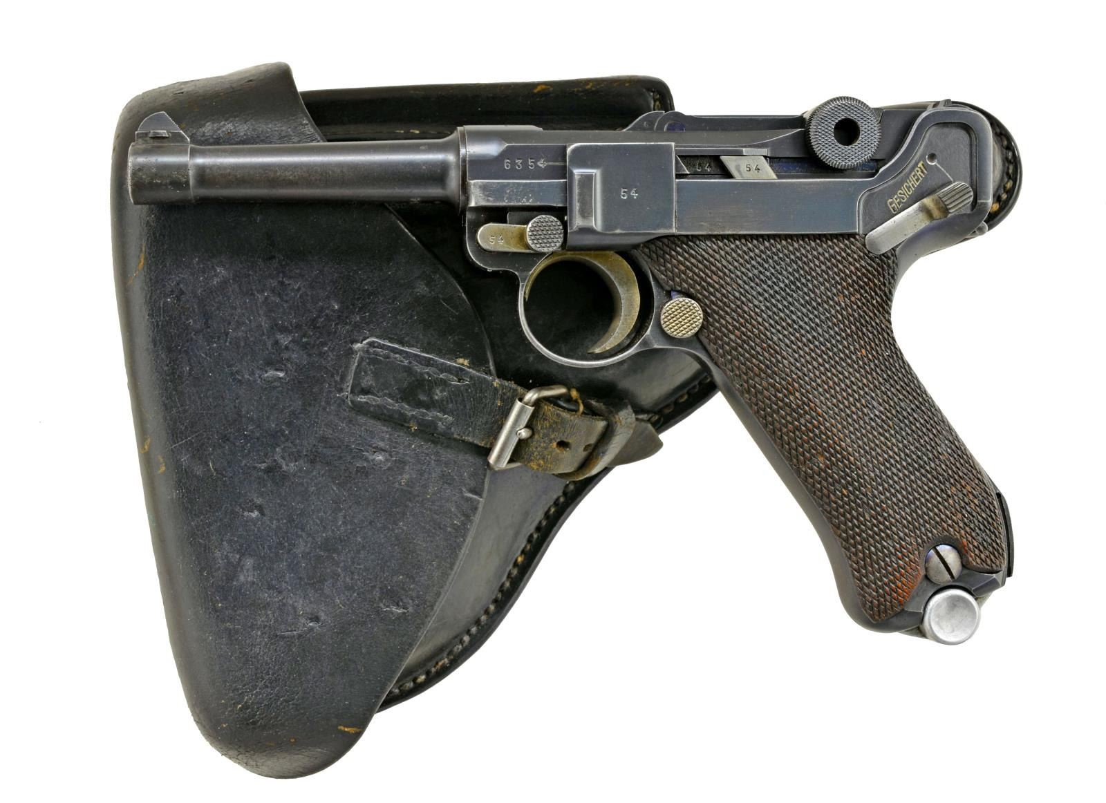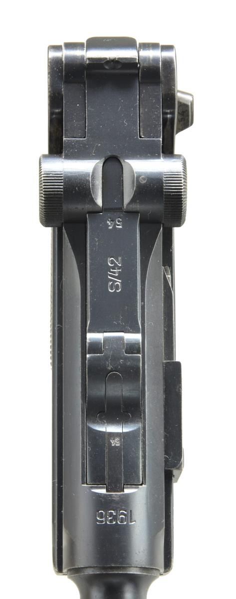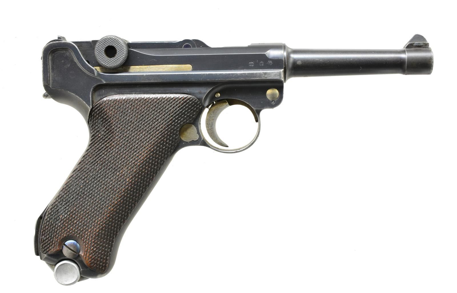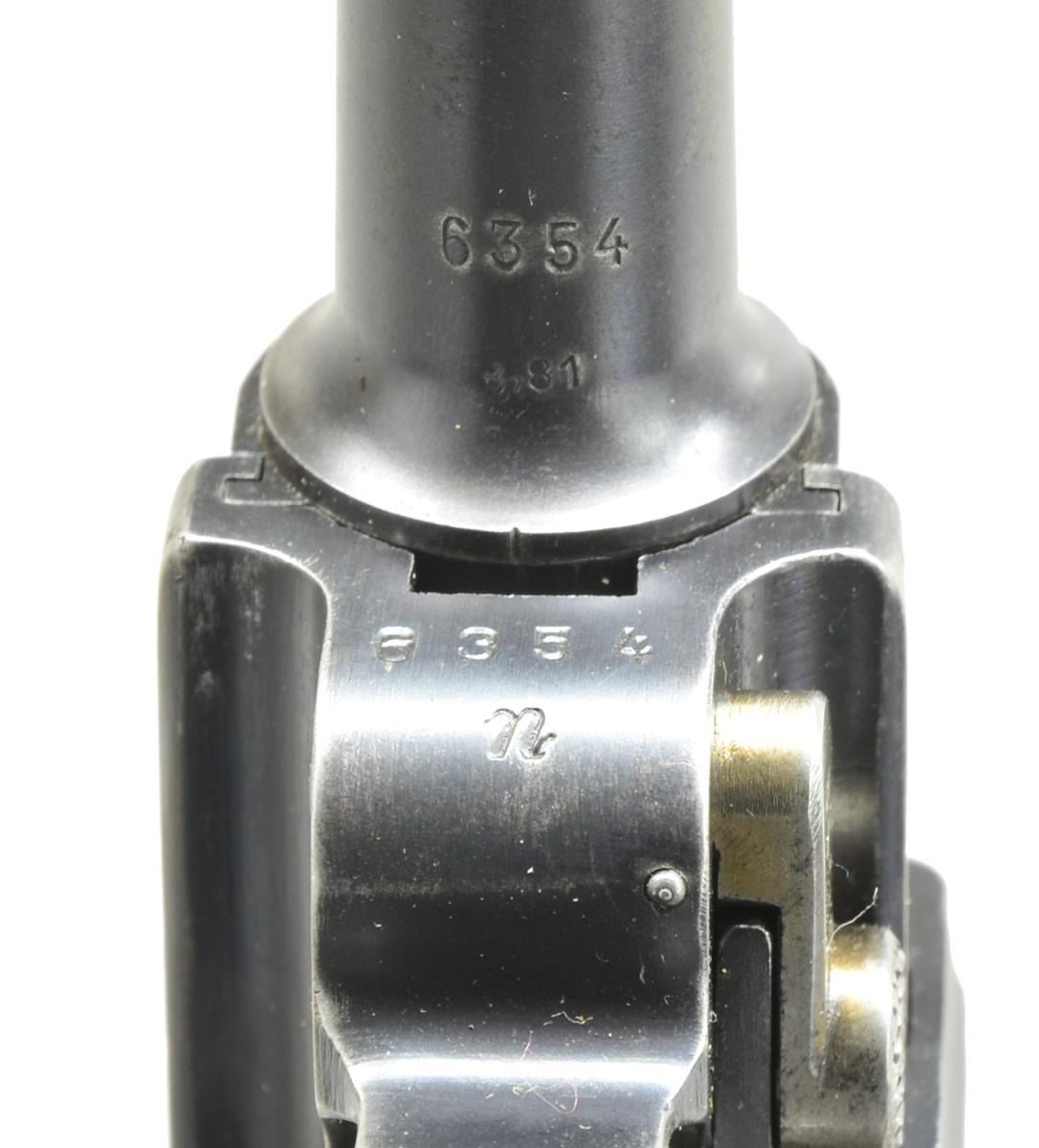 Cal. 9mm Luger. S# 6354n. Bbl. 4" w/ fin style front sight blade. Chamber dated 1936 w/in correct S# range of 5000f-4500p; approx. 89,500 units. Blued finish w/ strawed sm. parts plus appropriate internal areas in the white. Matching numbers on all metal parts including rear toggle pivot. Dark unmarked checkered walnut grips. MAGS: appropriate blued 8 rd. w/ aluminum base marked 7209n, plus eagle 63. 2 sm. protruding dents in body; lower left near front & lower right near rear (function not affected). UNATTACHED ACCESSORIES: good to very good black holster w/ buckle & strap retention. Marks on front of flap where metal insignias once attached. Back below belt loops has knife scratched "Hacker IX"; top back between loops has "RYFFEL&DORNS" over "HANOVER" over "1936" (3 obviously restamped) over "WaA12. CONDITION: overall very good appearance w/ light pitting around muzzle along w/ occasional spots of peppery oxidation. Good to very good straw colors w/ slight staining on trigger & safety lever faded almost to gray. Light pitting on frame under grips. Bright spot w/ light pitting at bottom of front strap. Finish loss on heads of grip screws & high points of stock lug. Good plus grips w/ hand wear & occasional damaged diamond tops. Good to very good bore w/ hint of wear & very light frosting in grooves. (20-3190/NW). CURIO. $1,500-2,200.