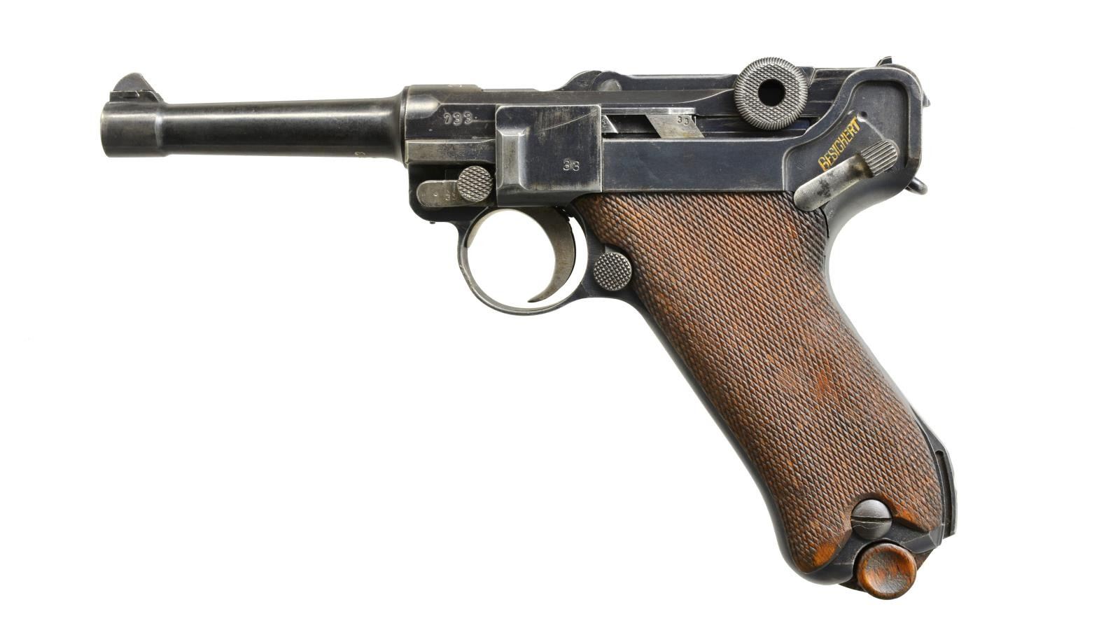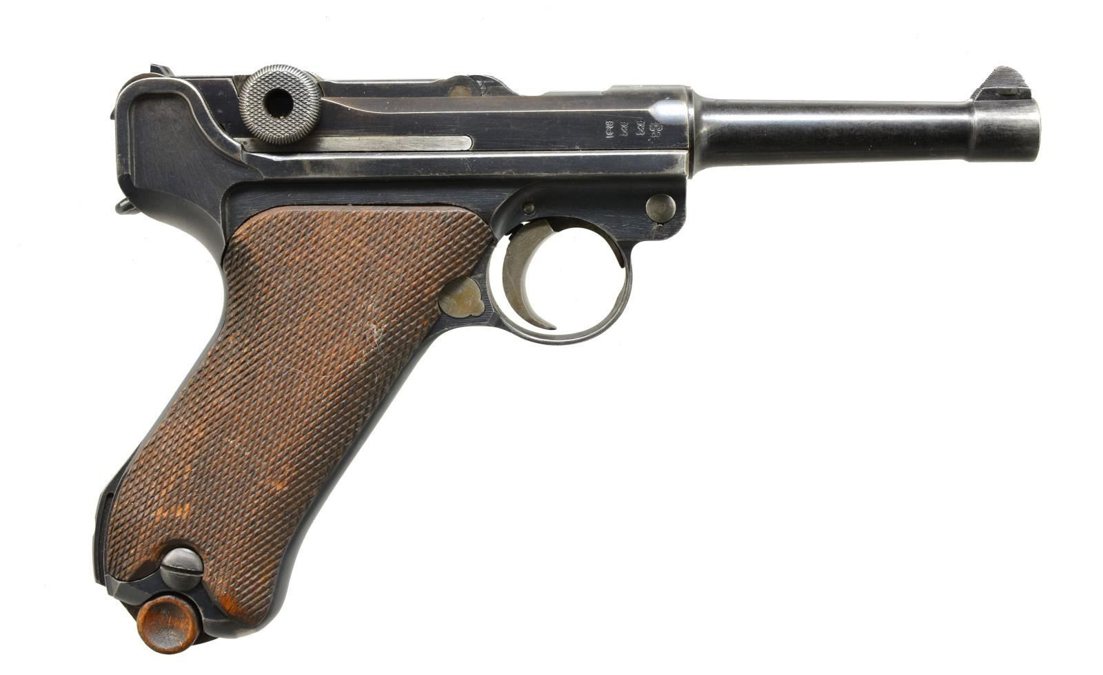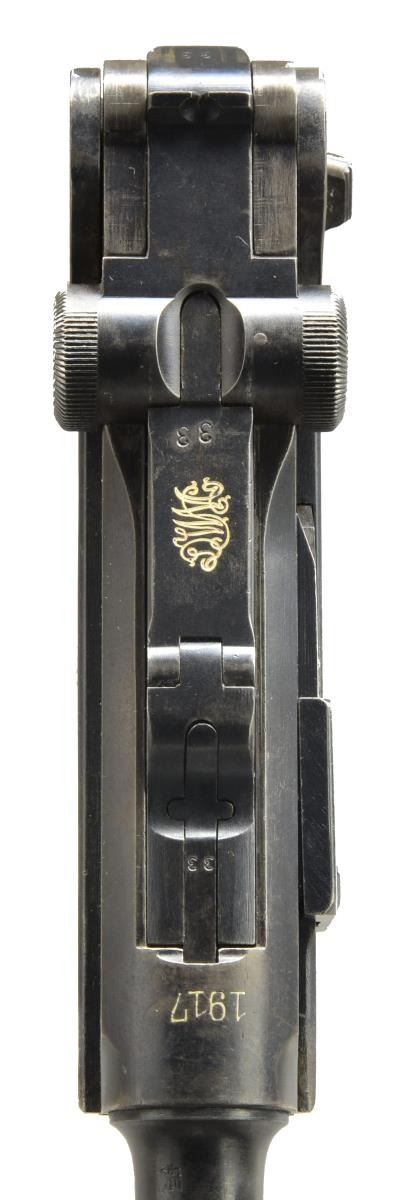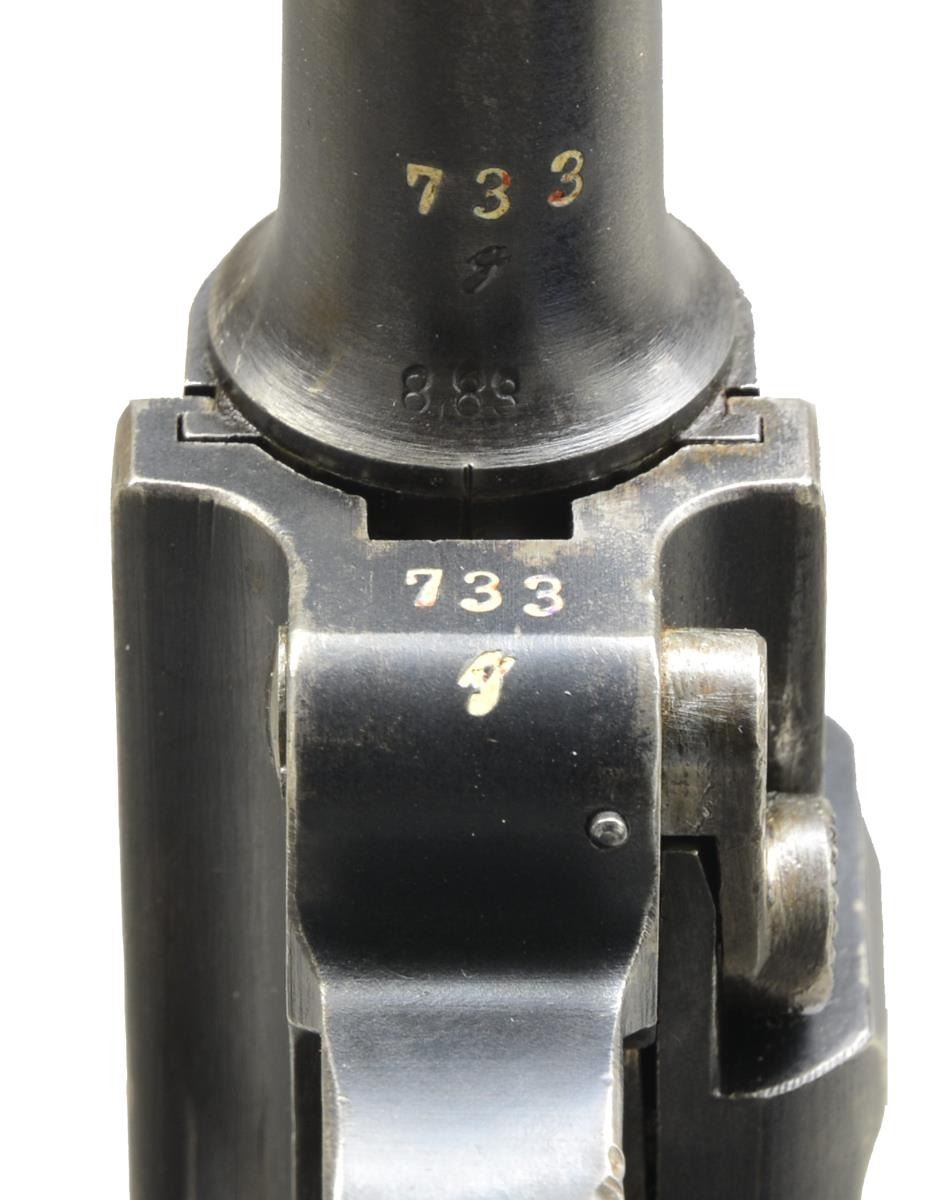 Cal. 9mm Luger. S# 733g. Bbl. 4". Mfg. 1917 w/ "1917" over chamber. Approximately 505,000 mfg. 1913-1918; 90,000 in 1917 from S# 211 to 3575n. Appropriate features to include: stock lug, strawed sm. parts plus appropriate interior areas in the white. All parts matching numbered including checkered walnut grips additionally w/ "N" on left & "W" on right. MAGS: fair tin plated 8 rd. w/ cleaned brown patina appearance. Unmarked wood base. CONDITION: good to very good overall appearance w/ slight holster like high point wear. Light metallic marks on takedown lever; minimal straw colors w/ light gray tone. Good grips w/out damage; 2 wear spots on left plus even light hand wear on both. Fair bore w/ noticeable wear & dark pitting in grooves. (20-3272/NW). CURIO. $1,200-1,800.