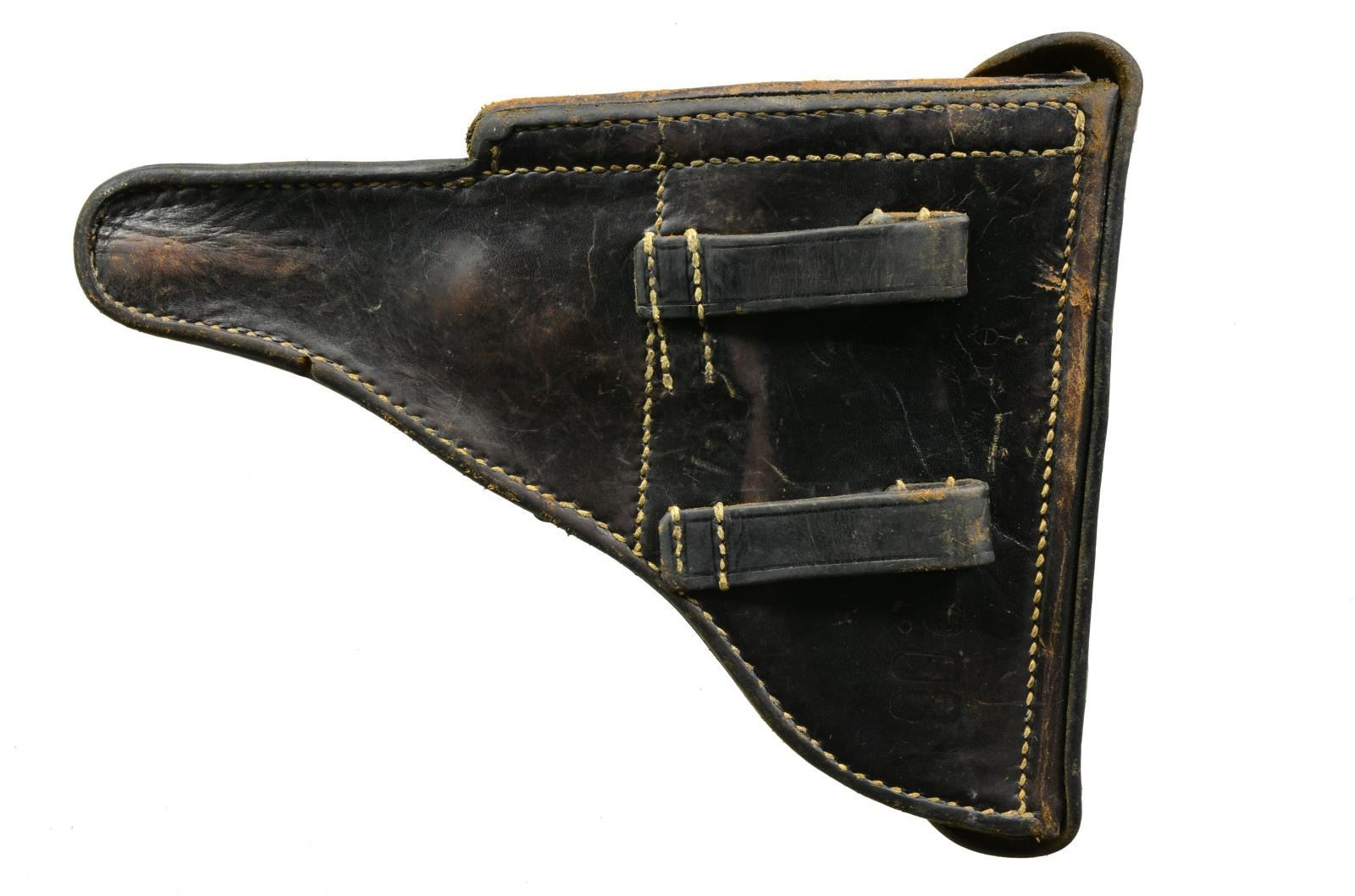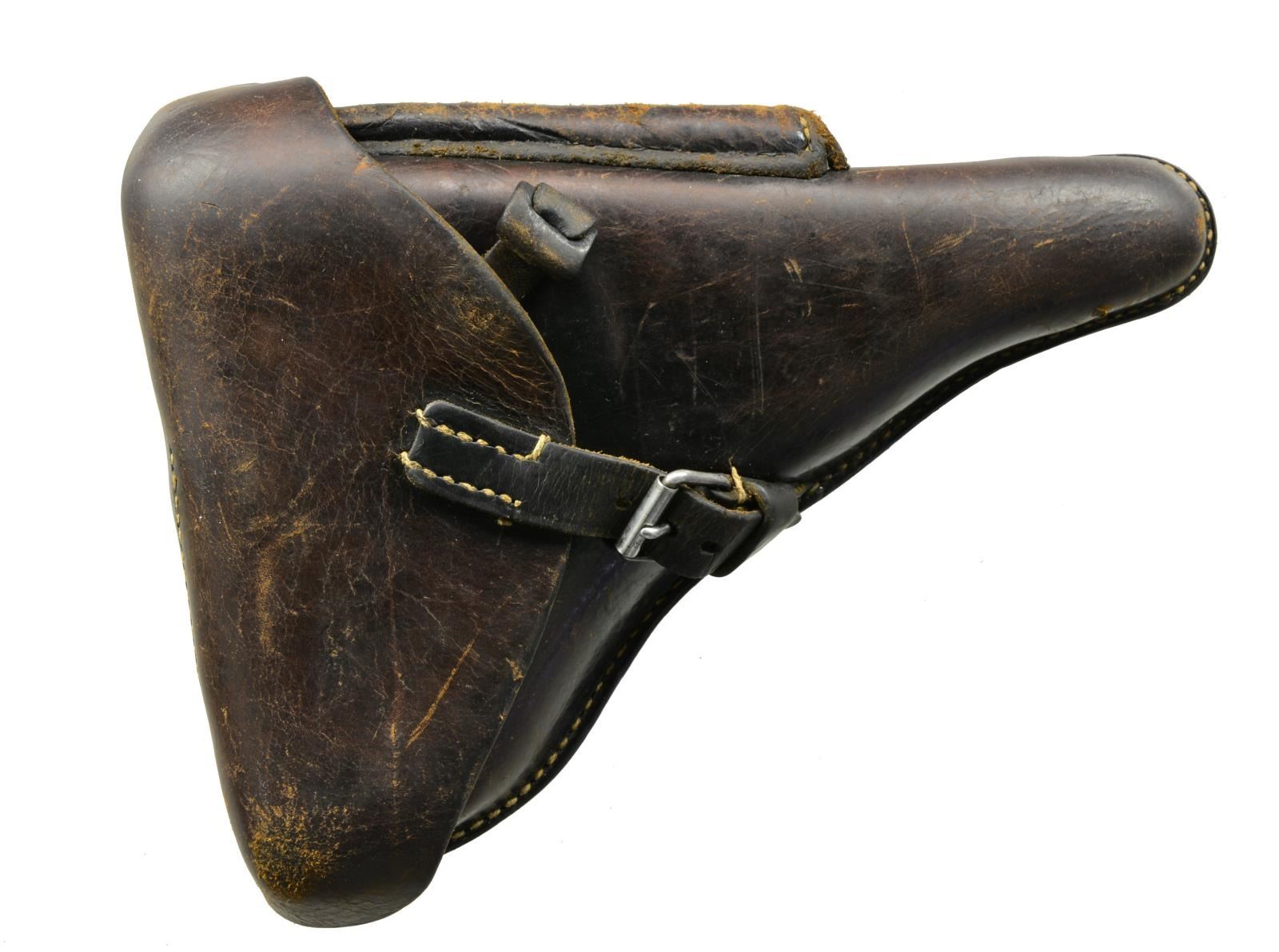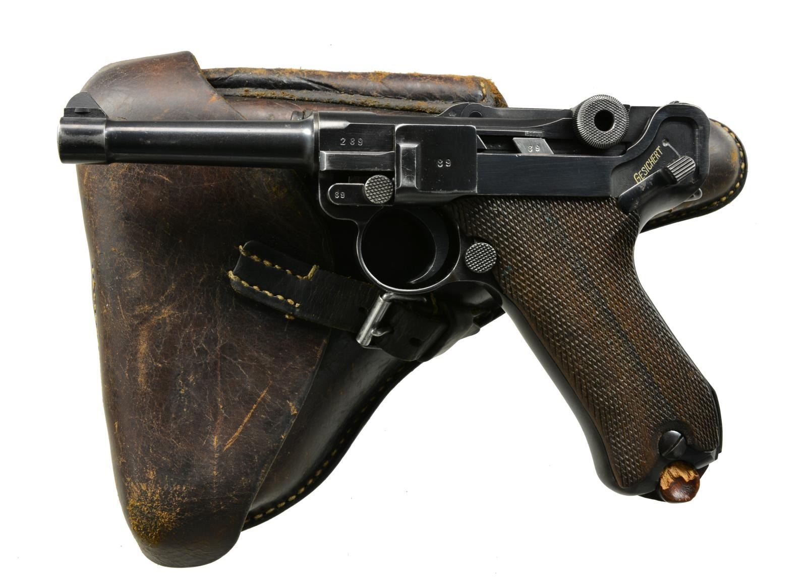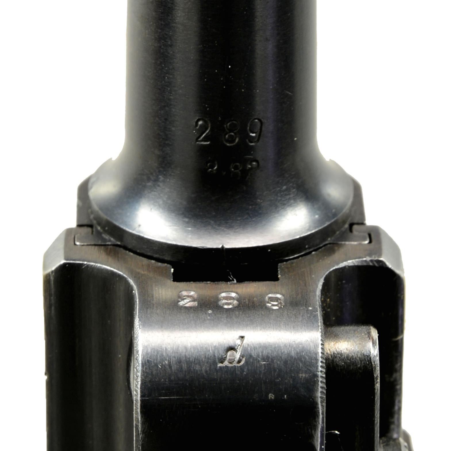 Cal. 9mm Luger. S# 289d. Bbl. 4". All matching numbers including rear toggle pivot & grips. Mfg. for military sales w/ all blue finish. Eagle 83 proofs. MAGS: 1 good tin plated 8 rd. w/ wood base having lg. chip at top of left side plus split behind knobs; crown proof at spine. UNATTACHED ACCESSORIES: good brown oiled holster w/ buckle & strap retention. Back marked "epf / 1941" plus eagle WaA 185 & "P.08". Includes black painted repro. combo tool stamped "DMW". CONDITION: very good general appearance w/ some high point wear likely from holstering. Occasional sm. spot of peppery oxidation. Especially well fitted grips in very good condition w/ some light hand wear to diamond tops. Very good bore w/ faint hint of frosting in corners of grooves. (20-1832/NW). CURIO. $1,000-1,500.