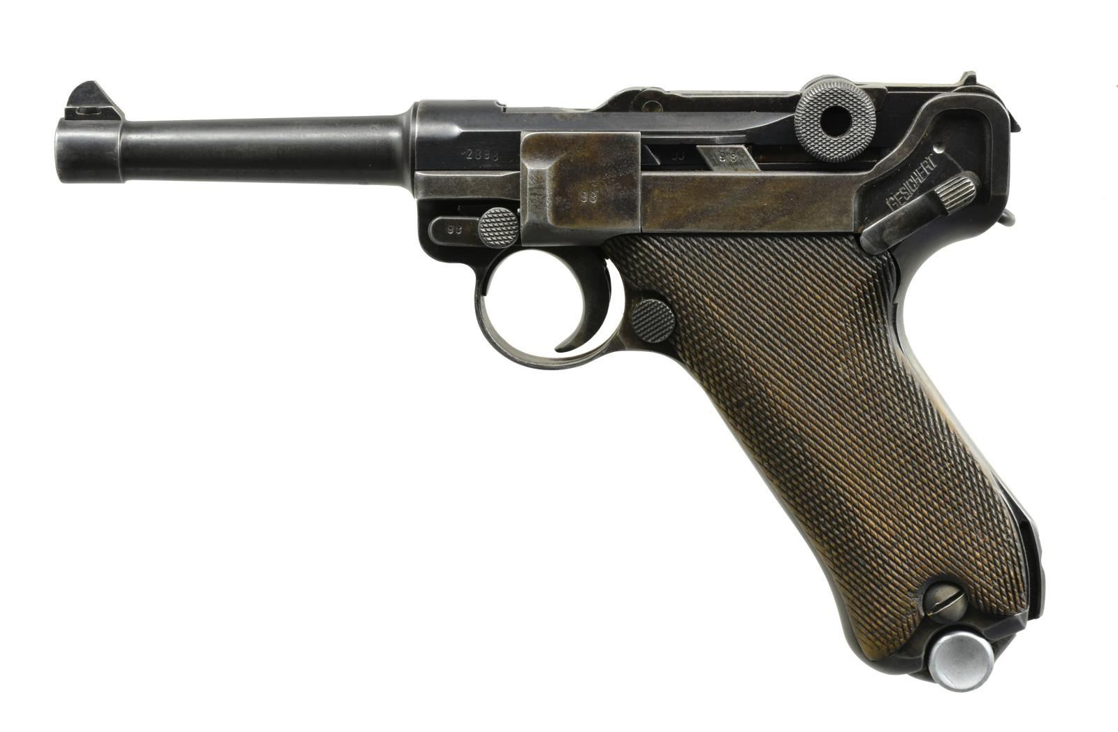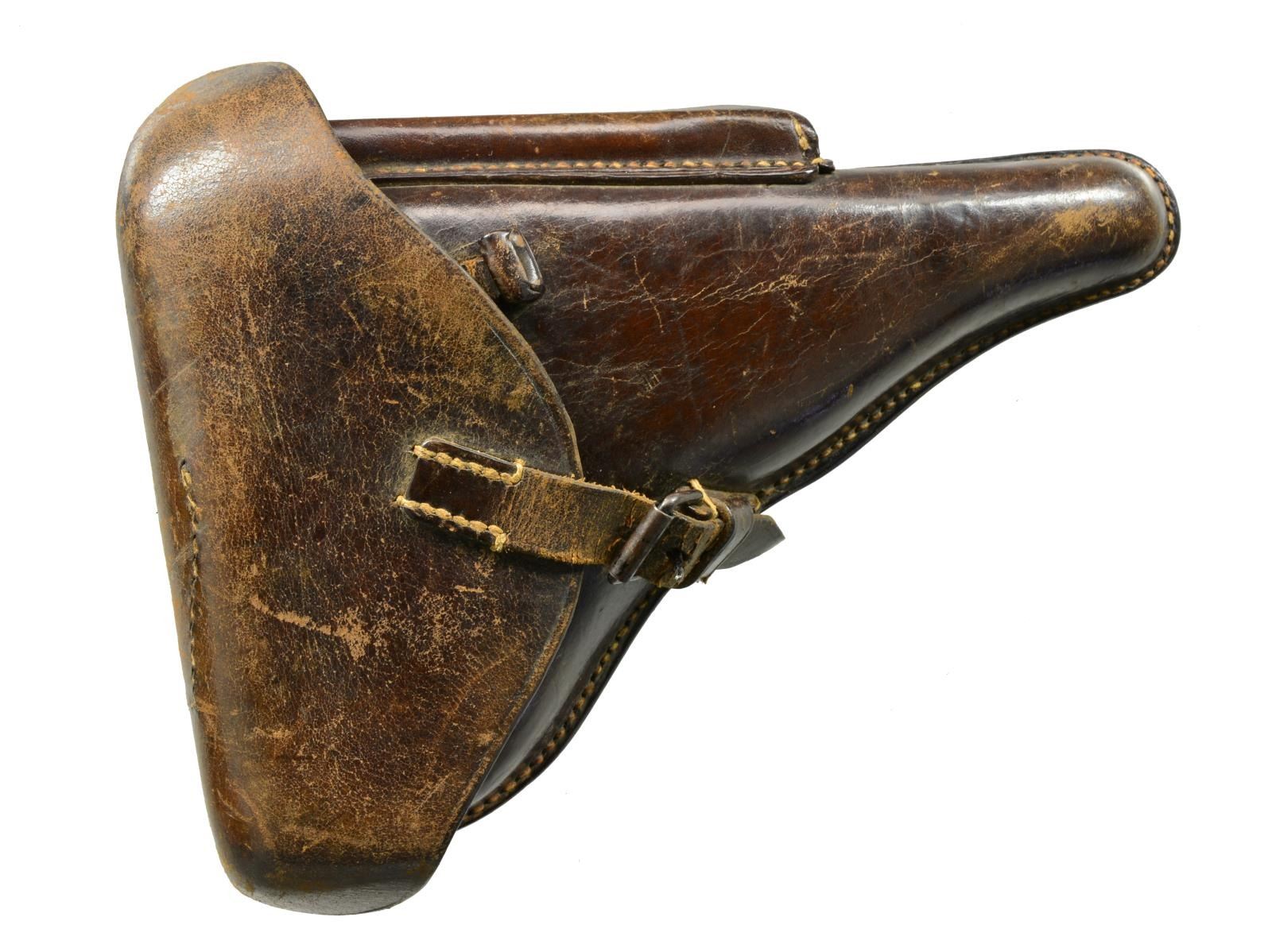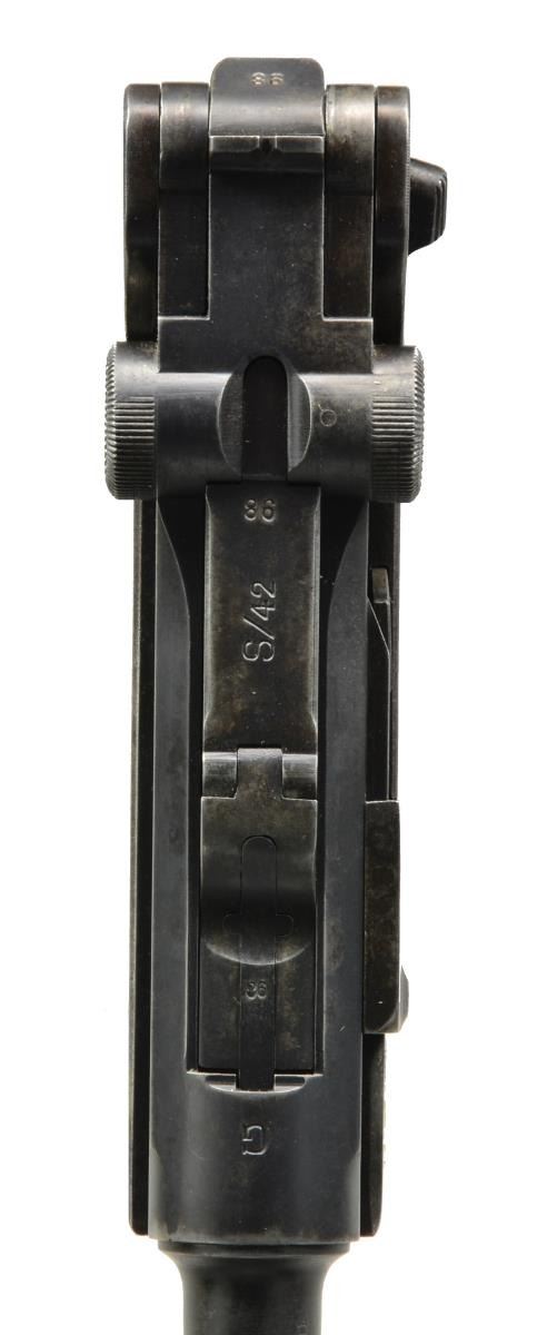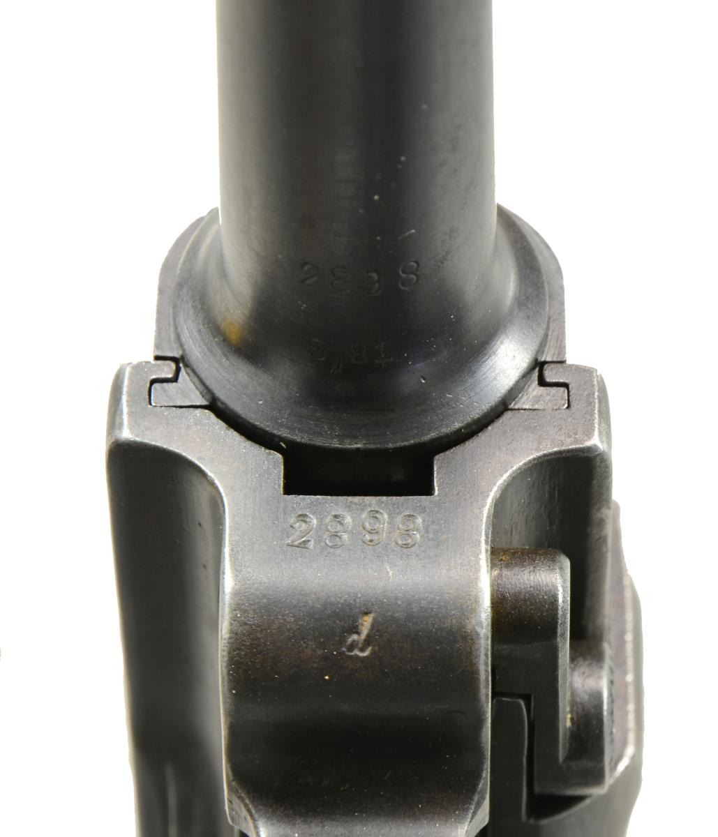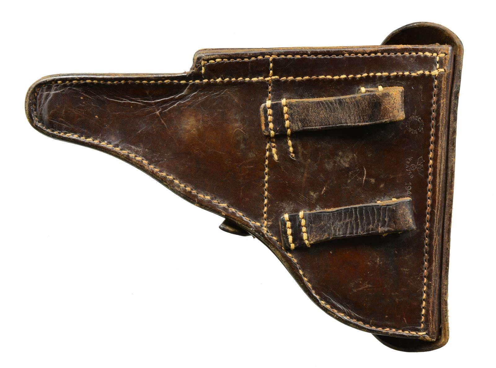 Cal. 9mm Luger. S# 2898d. Bbl. 4". Mfg. 1935 as indicated by "G" over chamber. Scarce early variation w/ I beam & eagle 211 proofs going up to S# 5000d. All metal parts matching including rear toggle pivot, but unnumbered replacement firing pin. Grips numbered "15" & 40". MAGS: 2-8 rd.; 1 original tin plated w/ aluminum base marked "2898 d + eagle 211", 1 blued aftermarket w/ Luger appearing metal follower & button. Cast metal base w/ concentric rings in dimples. UNATTACHED ACCESSORIES: very good C Weiss marked holster dated 1940 w/ eagle WaA 750 stamp. Includes crown S marked loading tool. Very good w/ brown color having typical scuffs on flap, but w/ very good shape. CONDITION: good overall appearance as refinished w/ in the white appearing ejector. Overall patina appearance w/ muzzle wear, high point sideplate wear & thinning to gray in grip area. Good plus bore w/ very faint even frosting. (20-1833/NW). CURIO. $1,000-1,600.