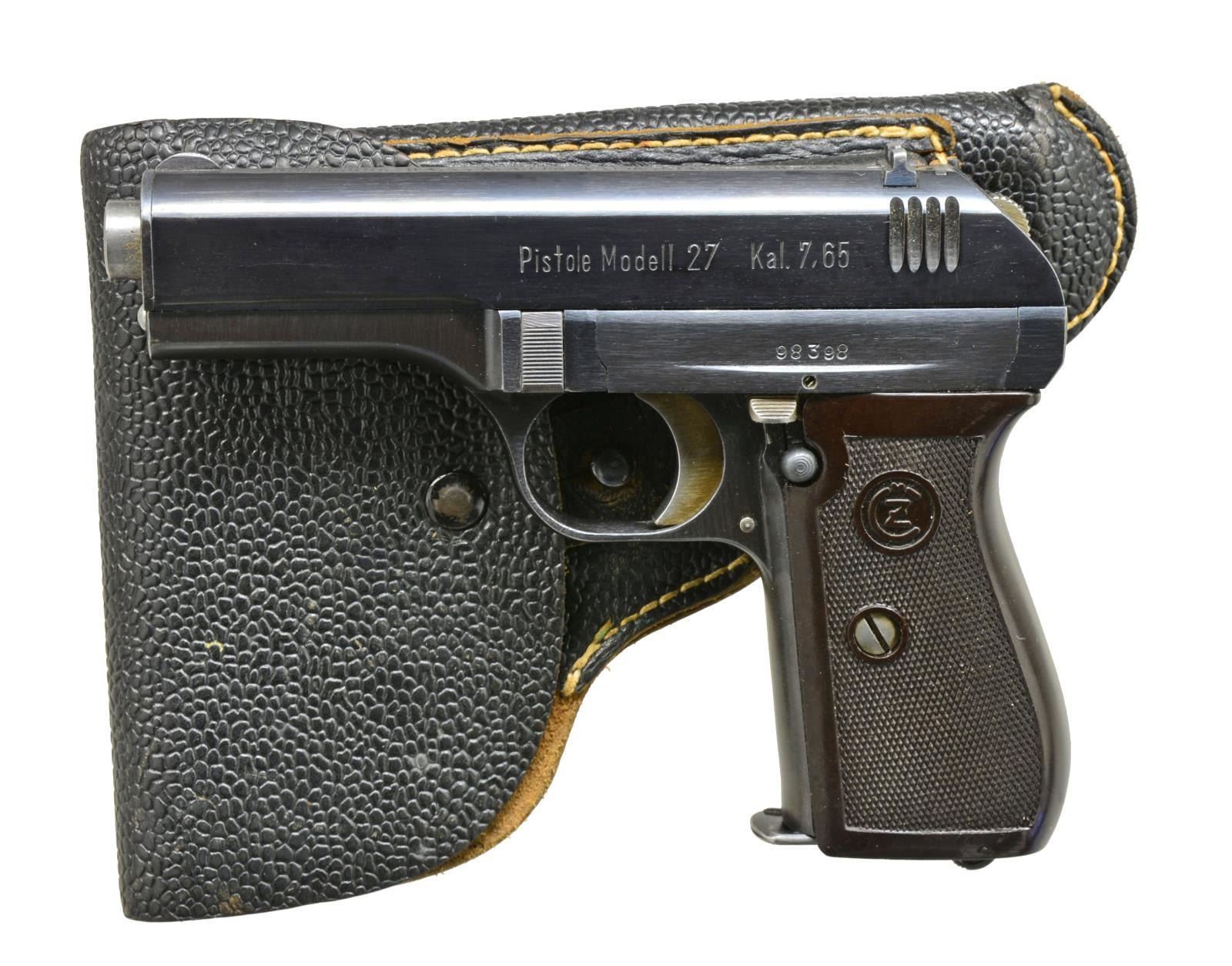VARIATION SEMI AUTO PISTOL & HOLSTER. Cal. 7.65mm. S# 98398. Bbl. 3 3/4”. “WaA76” proofed frame & slide. 4 Groove vertical slide serration w/ high polish blue & strawed sm. parts. “BOHMISCHE WAFFENFABRIK A.G. IN PRAG” marked slide. Matching numbers. The Bohmische slide legend was adopted during 1941 after military production had started for the German forces. 1 Piece brown plastic grips w/ CZ logo. MAGS: 1-8 rd. marked “P.MOD 27” on base plate. UNATTACHED ACCESSORIES: black pebble grain holster w/ single wide belt loop marked "O?250/00y" over "7G11947" (may not be exact). CONDITION: overall very fine w/ minor high edge wear & a few faint handling marks. Crisp markings. Very good grips w/ only a few minor light handling marks. Good strawed parts w/ light wear from use. Near excellent bright bore w/ strong rifling. Very good holster showing light wear. (20-3331/ZAL). CURIO. $400-600.