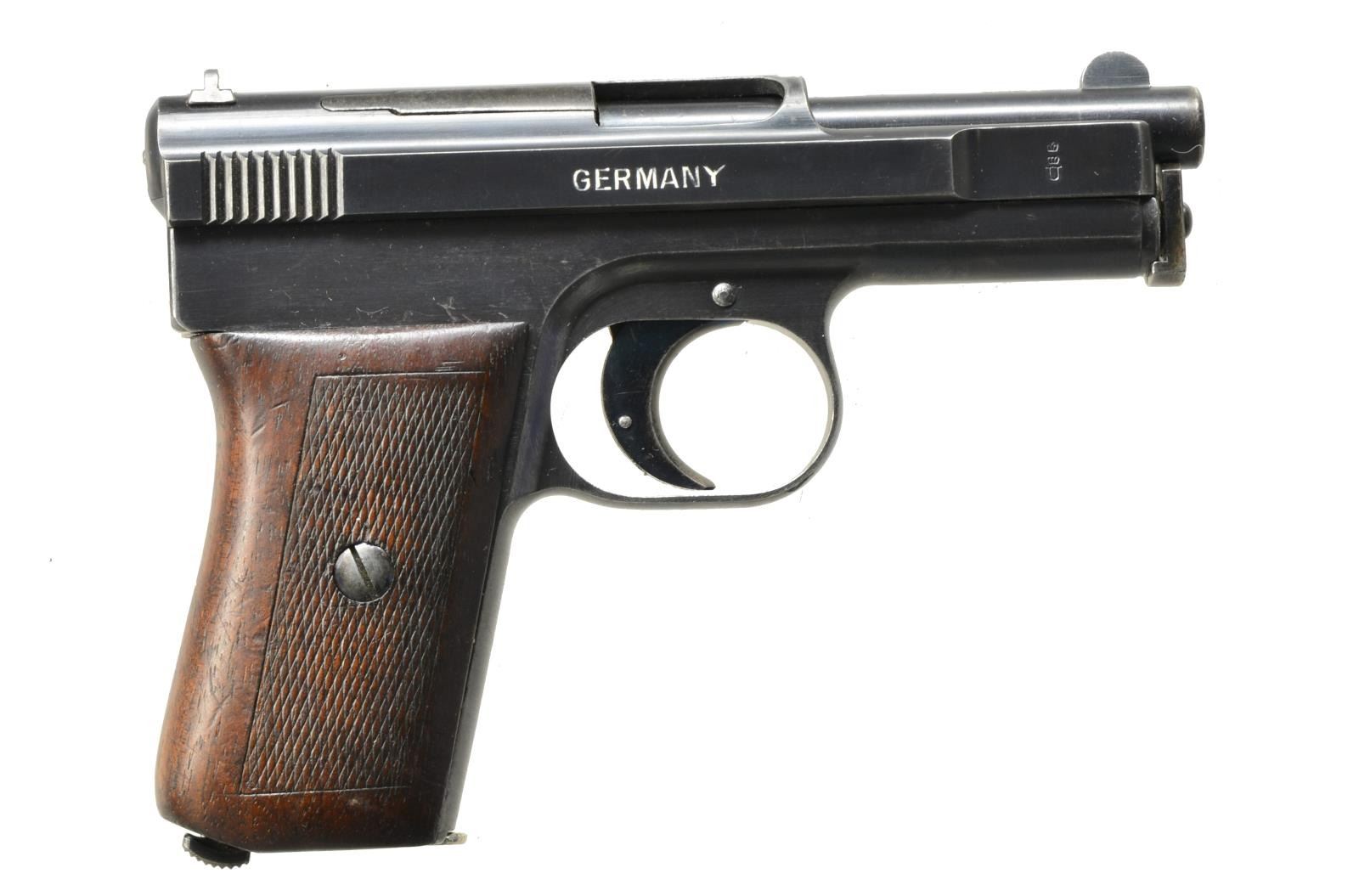 Cal. 6.35mm (25 ACP). S# 49600. Bbl. 3 3/16". Mfg. 1910-1934 w/ matching numbered bbl. retainer, rear of frame, slide & bbl. Checkered walnut grip. Crown U proofed plus "GERMANY" export mark nicely applied to right side of slide. Early variation w/ sidelatch for sideplate. Bbl. latch released w/ button on face of latch. MAGS: very good plated 9 rd. w/ sm. star on bottom front of floorplate. CONDITION: very good plus overall appearance w/ very slight high point wear plus occasional pinprick oxidation. Light to moderate hand wear on grip. Very good Nitre blued trigger. Very good bore. (20-3352/NW). CURIO. $550-800.
