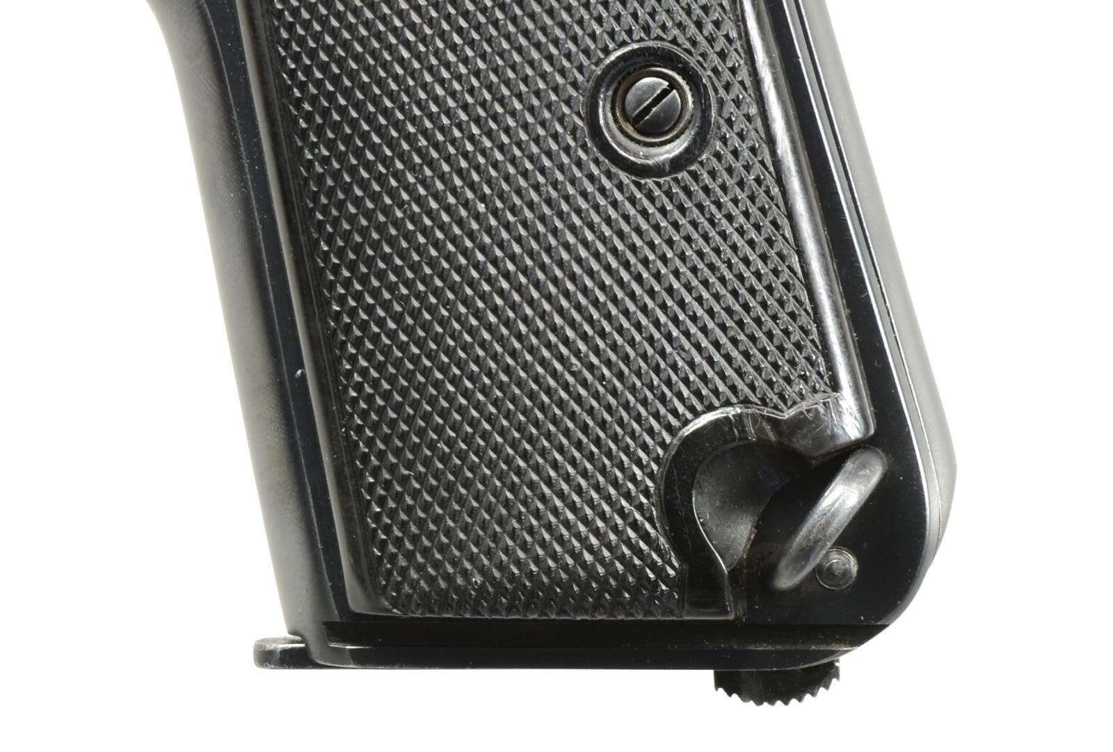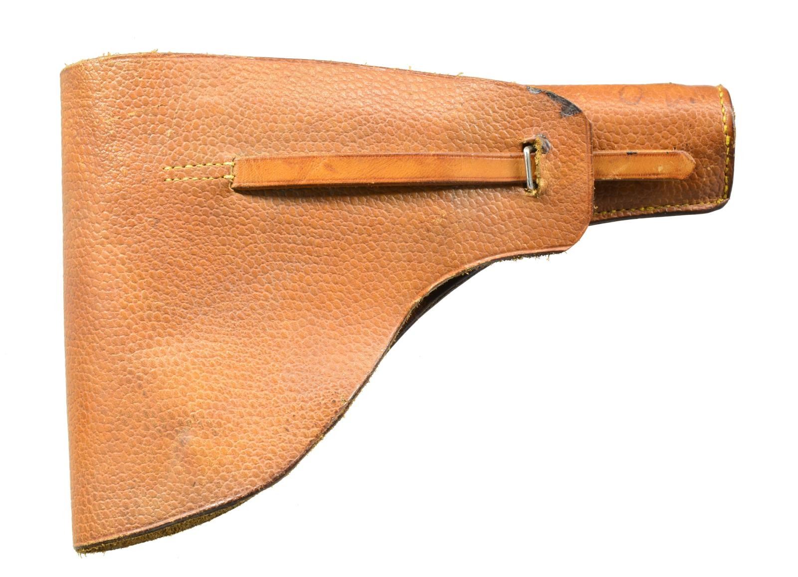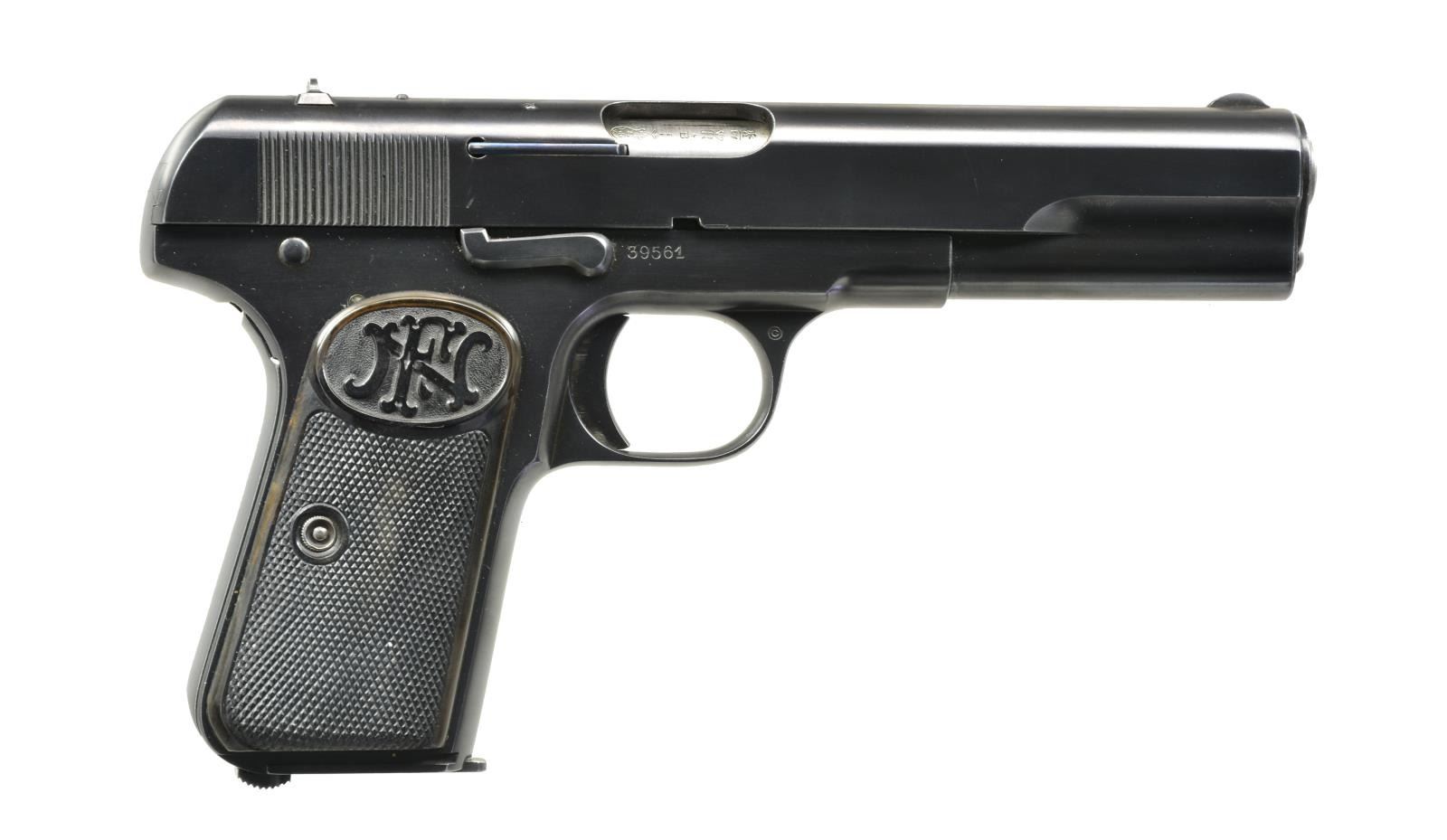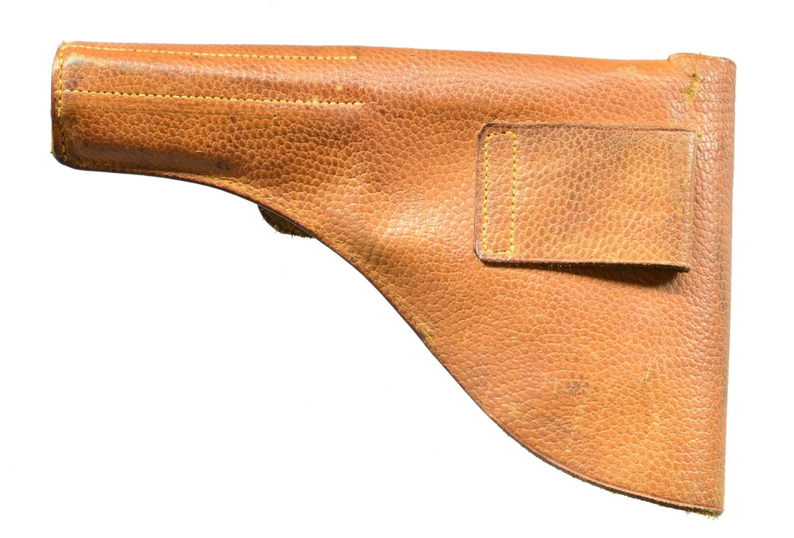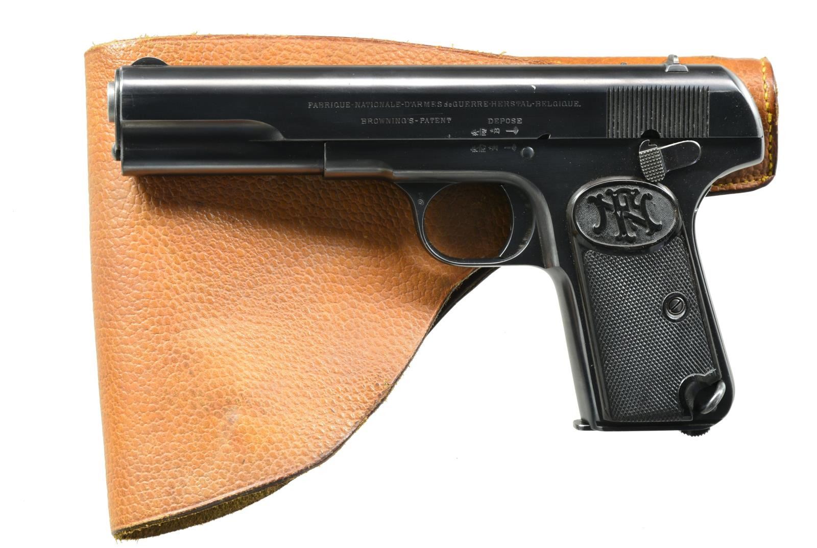 Cal. 9mm Browning Long. S# 39561. Bbl. 5". 58,400 Mfg. 1903-1927. Variations used by numerous European militaries. Blued w/ checkered FN logo hard rubber grips. Matching numbered slide & bbl. Numerous Belgian proofs throughout. Fixed lanyard loop at lower left rear of butt plus bottom of butt slotted for shoulder stock. MAGS: 2 very good 7 rd. UNATTACHED ACCESSORIES: unmarked brown pebble grained leather holster appearing to be nonmilitary private purchase in very good condition. Single wide belt loop on back w/ narrow strap & staple to retain flap. Single mag. pouch under flap plus interior provision to retain included cleaning rod. Vaguely similar to Swedish holster for Husqvarna Model 1907 but less robust & 1 mag. pouch instead of 2. CONDITION: 1 sm. mark on top of slide & very faint beginning thinning on front of slide, top of rear sight & rear corners of slide. Left rear corner of slide has sm. line of peppery oxidation. Occasional very faint marks on left grip. All remaining aspects of pistol near excellent including bore. (20-2157/NW). CURIO. $1,700-2,200.