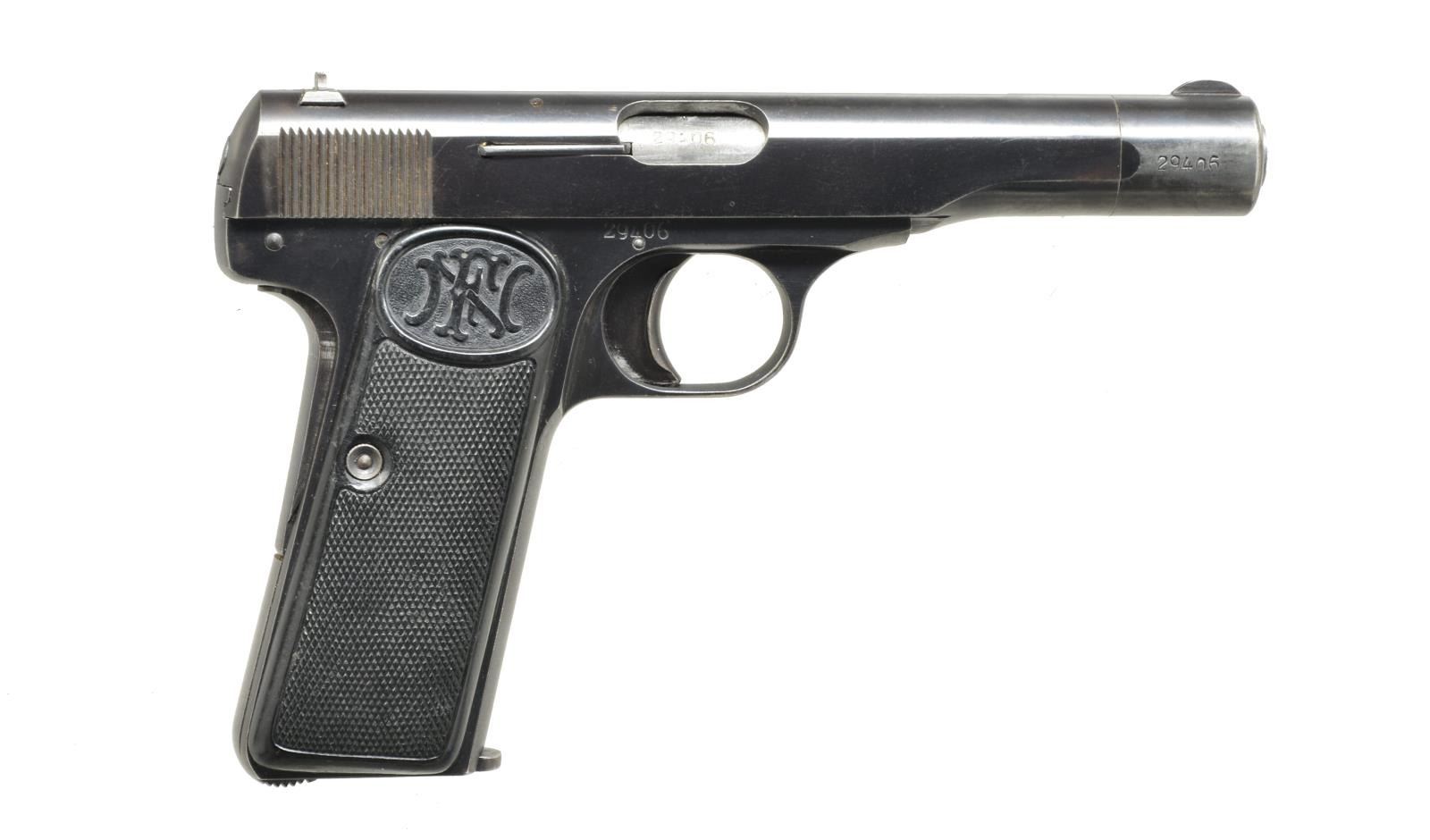Cal. 7.65mm (32 ACP). S# 29406. Bbl. 4 1/2". Mfg. 1940-1944 during German occupation w/ uncommon WaA103 proofs along w/ eagle party symbol proofs. Checkered FN logo black hard rubber grips w/ relief on left for lanyard loop yet none present. Matching numbered bbl., slide & nose cap. Grip & thumb safeties. MAGS: 3 FN marked 9 rd.: 1 fair matte finished; 2 good standard blued finish. CONDITION: good plus appearance w/ high point holster like wear, function wear & scattered peppery oxidation (mostly in grip area). Light grip hand wear. Very good to excellent bore. (20-3305/NW). CURIO. $500-800.