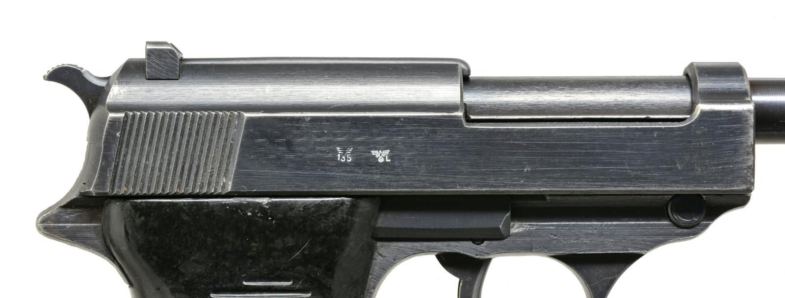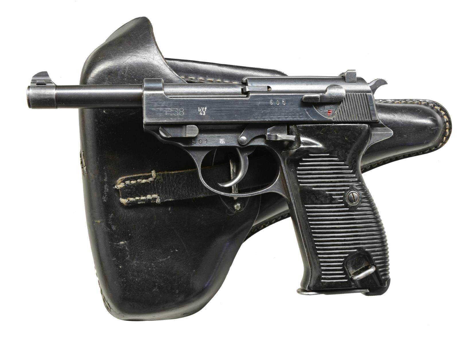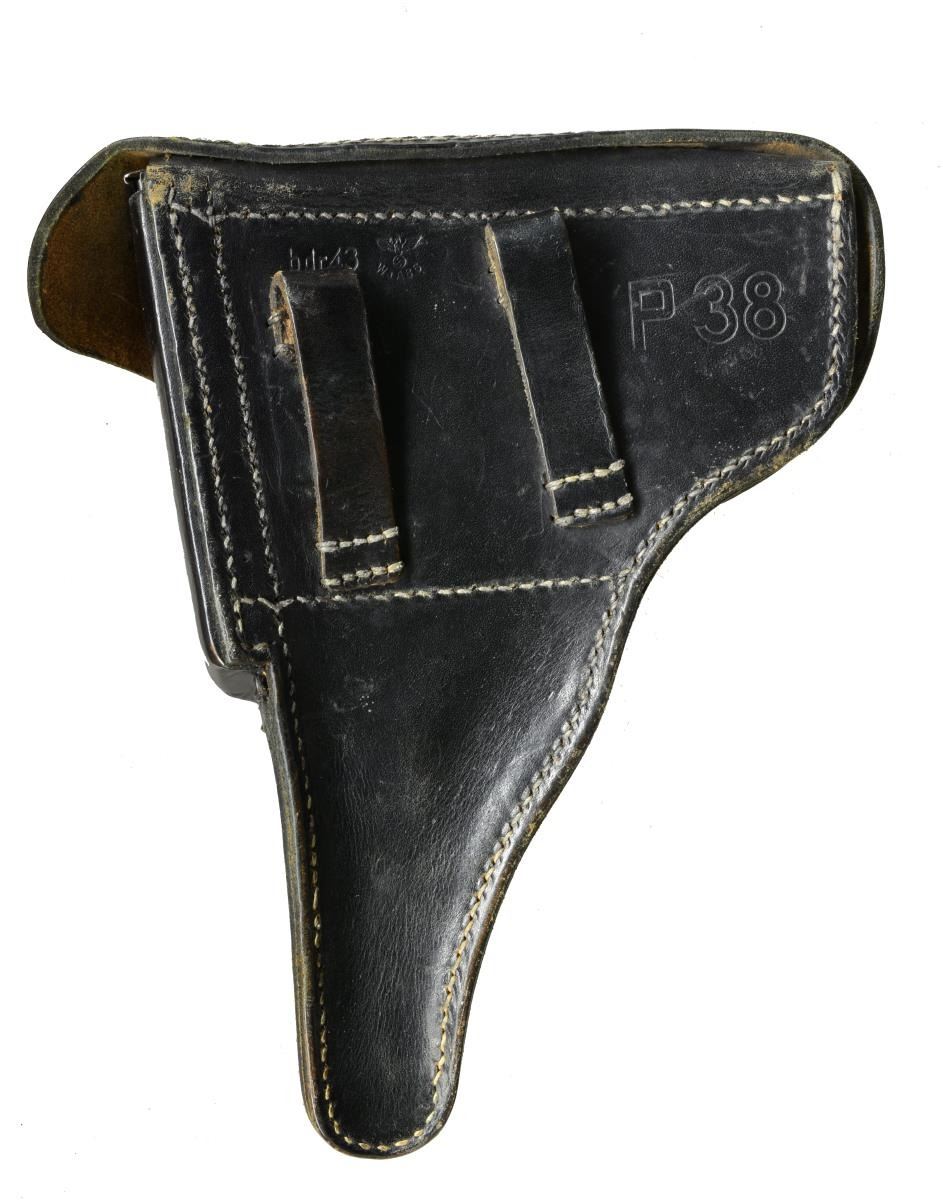 (POLICE MARKED) P.38 SEMI-AUTO PISTOL. Cal. 9mm Luger. S# 501. Bbl. 5". Mfg. Dec. 1942 out of 1st byf models using 1943 dated slides w/ eagle 135 plus matching numbers on frame, slide, bbl. & locking block. Slide has eagle party symbol w/ "L" indicating police use. Black bakelite grips. MAGS: 2 good blued 8 rd. TOTAL; w/ lower left of bodies marked "P.38" (base almost void of finish) plus eagle 135 & "P.38v" having eagle 359 on spine. UNATTACHED ACCESSORIES: very good black flap holster w/ staple & strap retention. Dbl. belt loops on back along w/ "P38", eagle party symbol over "WaA 86" & "bdr 43" (Richard Ehrhardt). CONDITION: very good appearance w/ light high point wear to include scratch on slide from safety operation. Very good grips. Slight thinning on front strap & sight cover on slide. Good to very good bore w/ some areas of faint cleaned pitting. Very scarce 1st series especially so w/ police marking. (20-3251/NW). CURIO. $4,000-6,000.