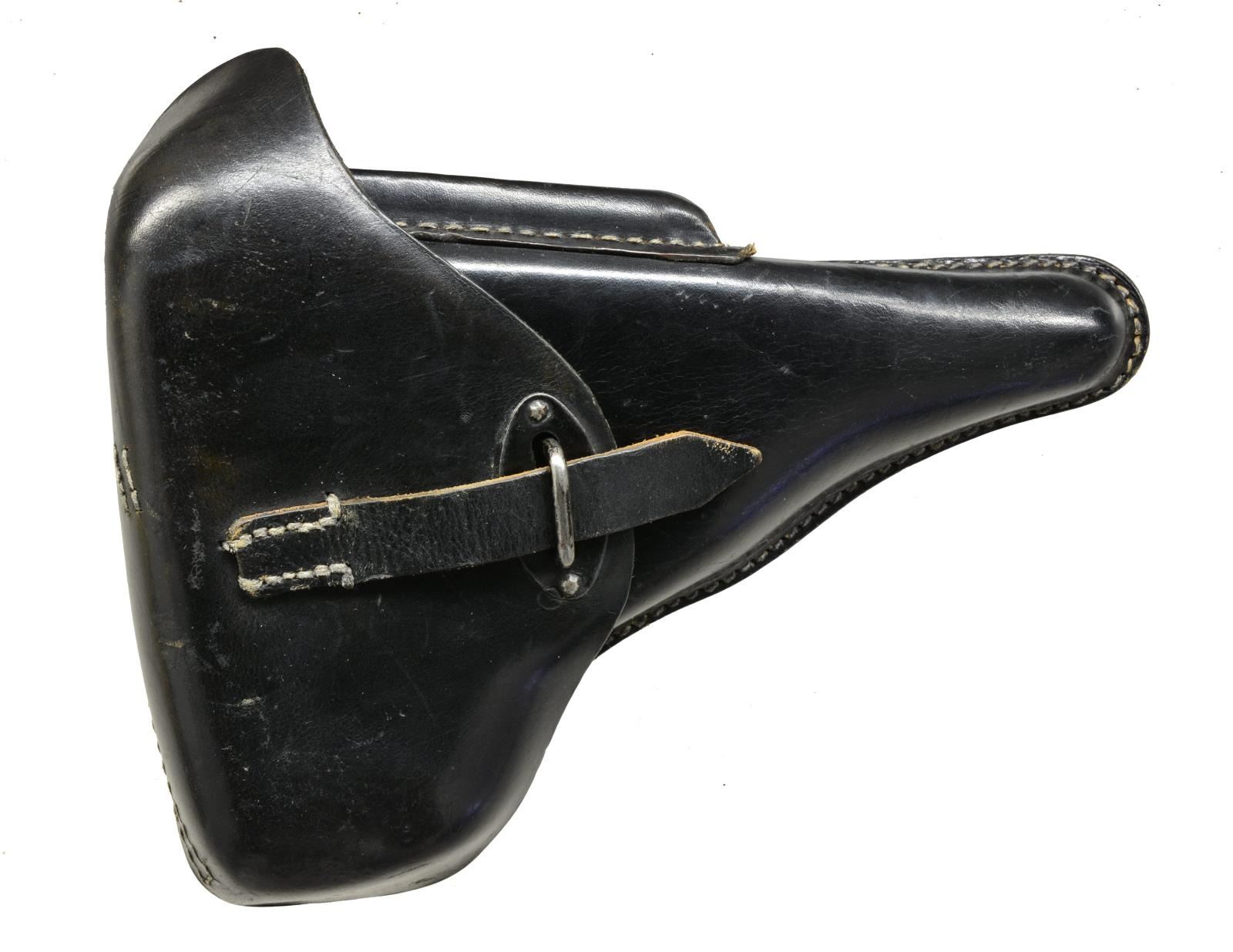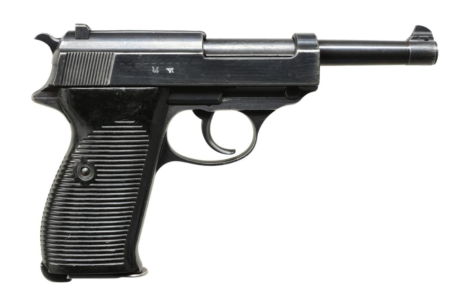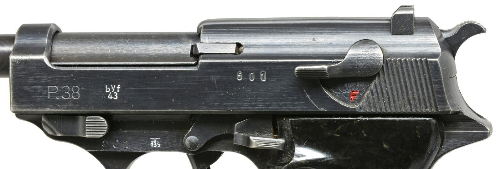 (POLICE MARKED) P.38 SEMI-AUTO PISTOL. Cal. 9mm Luger. S# 501. Bbl. 5". Mfg. Dec. 1942 out of 1st byf models using 1943 dated slides w/ eagle 135 plus matching numbers on frame, slide, bbl. & locking block. Slide has eagle party symbol w/ "L" indicating police use. Black bakelite grips. MAGS: 2 good blued 8 rd. TOTAL; w/ lower left of bodies marked "P.38" (base almost void of finish) plus eagle 135 & "P.38v" having eagle 359 on spine. UNATTACHED ACCESSORIES: very good black flap holster w/ staple & strap retention. Dbl. belt loops on back along w/ "P38", eagle party symbol over "WaA 86" & "bdr 43" (Richard Ehrhardt). CONDITION: very good appearance w/ light high point wear to include scratch on slide from safety operation. Very good grips. Slight thinning on front strap & sight cover on slide. Good to very good bore w/ some areas of faint cleaned pitting. Very scarce 1st series especially so w/ police marking. (20-3251/NW). CURIO. $4,000-6,000.