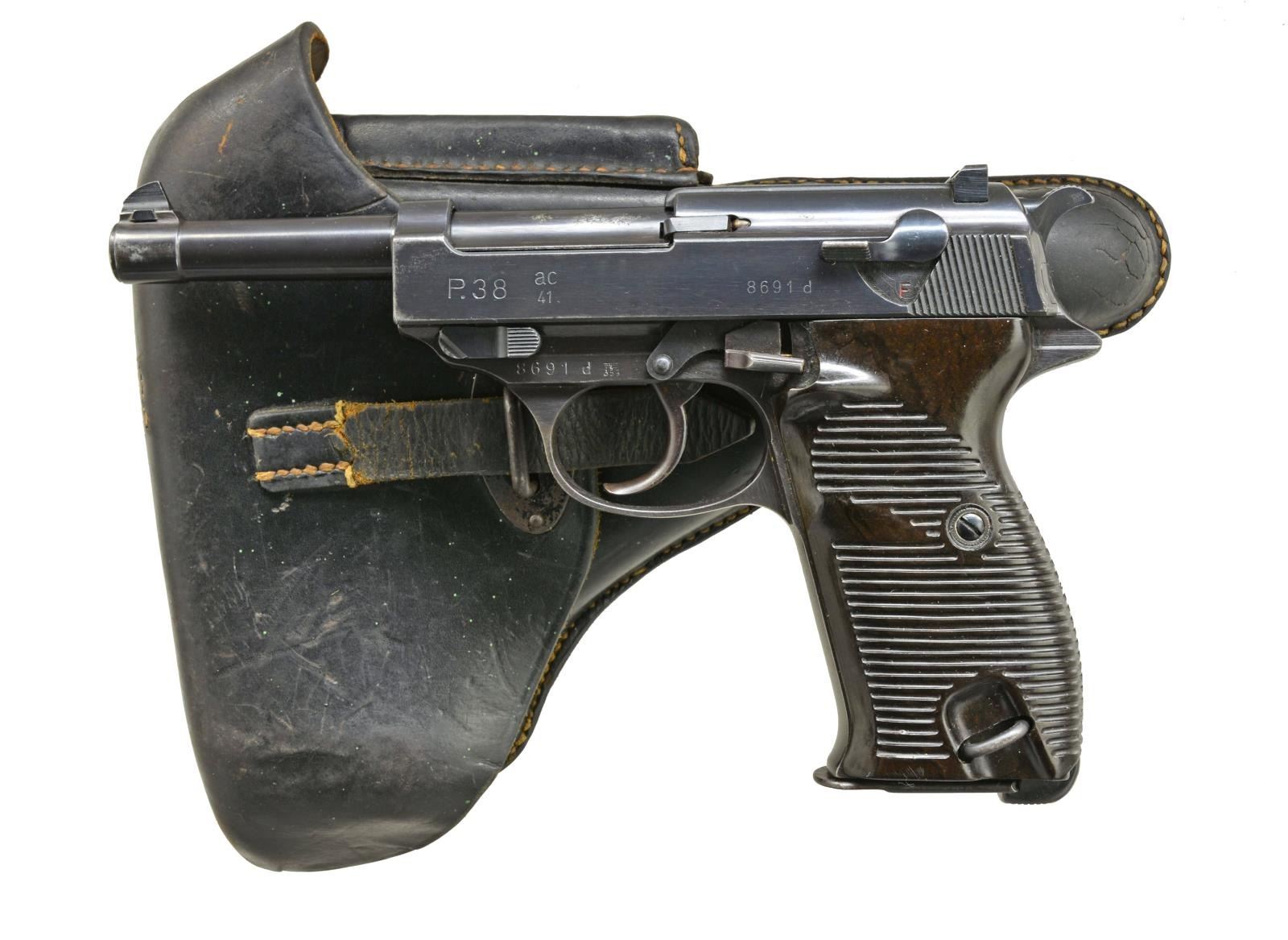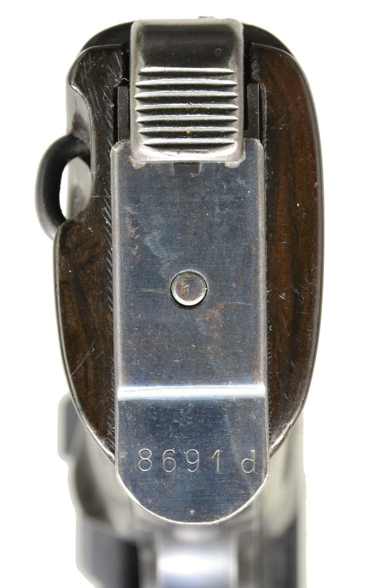 Cal. 9mm Luger. S# 8691d. Bbl. 5". Mfg. 1941. as second variation (S# 4833b to 4527i) w/ eagle 359 plus matching numbers on frame, slide, bbl. & locking block; also scarce matching mag. Eagle 359 proof on all sm. parts. Slide has eagle party symbol. Dark brown bakelite grips. MAGS: 2 good to very good blued 8 rd. TOTAL; lower left of bodies marked "P.38" plus eagle 359 on spines; 1 base numbered 8691d. UNATTACHED ACCESSORIES: good oiled black flap holster w/ staple & strap retention; detached lift strap. Double belt loops on back along w/ "P38", eagle party symbol over "WaA 195" & "dla / 42" (Karl Barth). CONDITION: very good appearance w/ light high point wear. Very good to excellent grips. Slight peppery oxidation on front strap. 3 Sm. areas of cleaned light pitting near left top of bbl. at chamber area. Good to very good bore w/ some areas of faint cleaned pitting. (20-3360/NW). CURIO. $1,500-2,200.