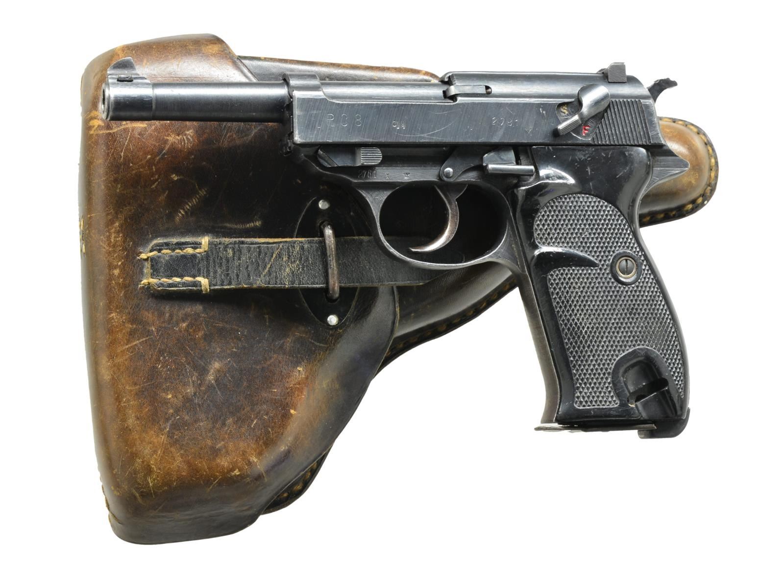 Cal. 9mm Luger. S# 2781x. Bbl. 5". Blued finish. Post war black plastic grips. UNATTACHED ACCESSORIES: brown leather gxy 1942 WaA706 P38 holster. CONDITION: overall good w/ scratches & handling marks. Very good bore w/ nice rifling. Good holster shows some wear & scuffs. Strong markings. (20-3661/ZAL). CURIO. $450-650.
