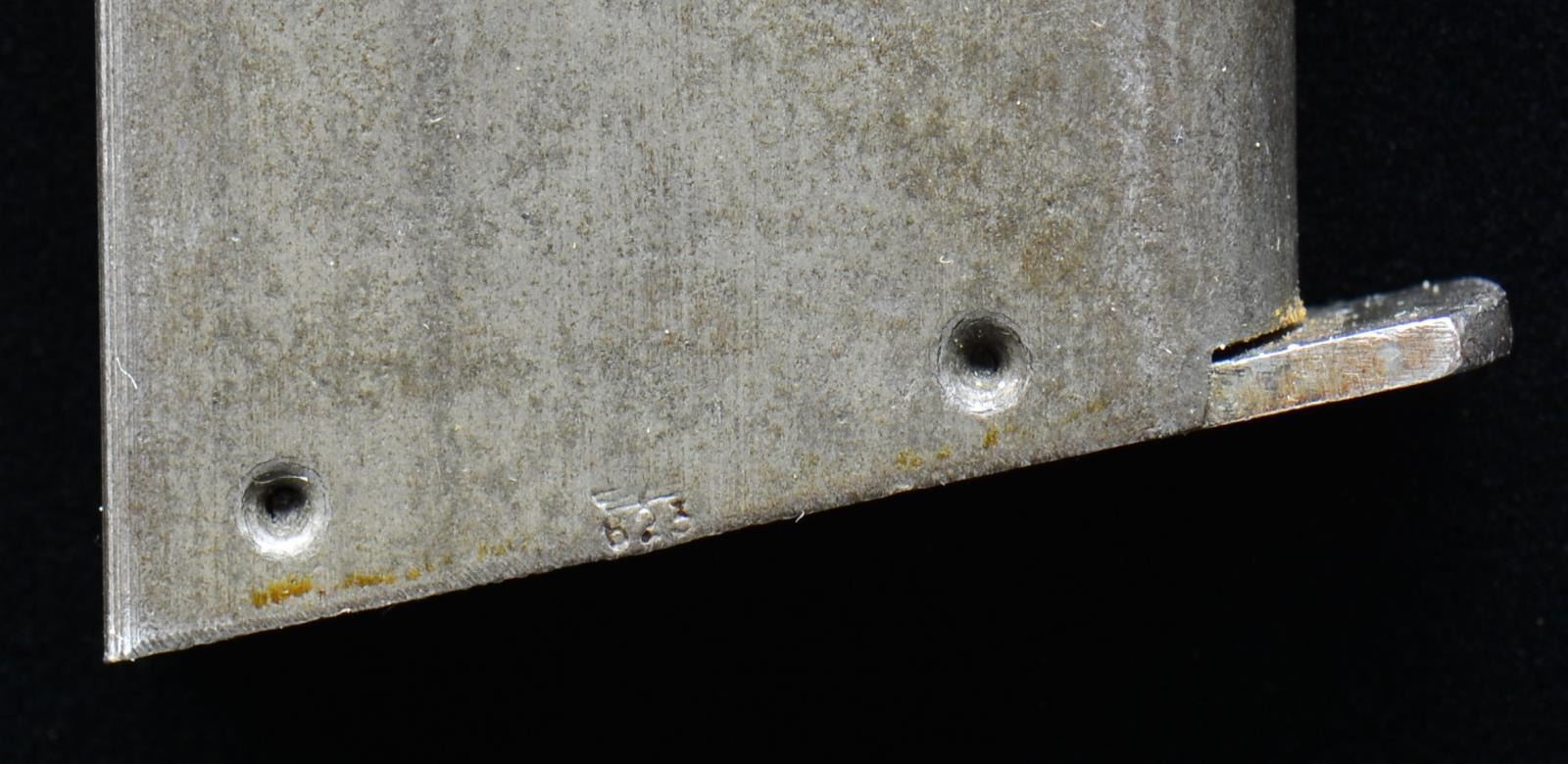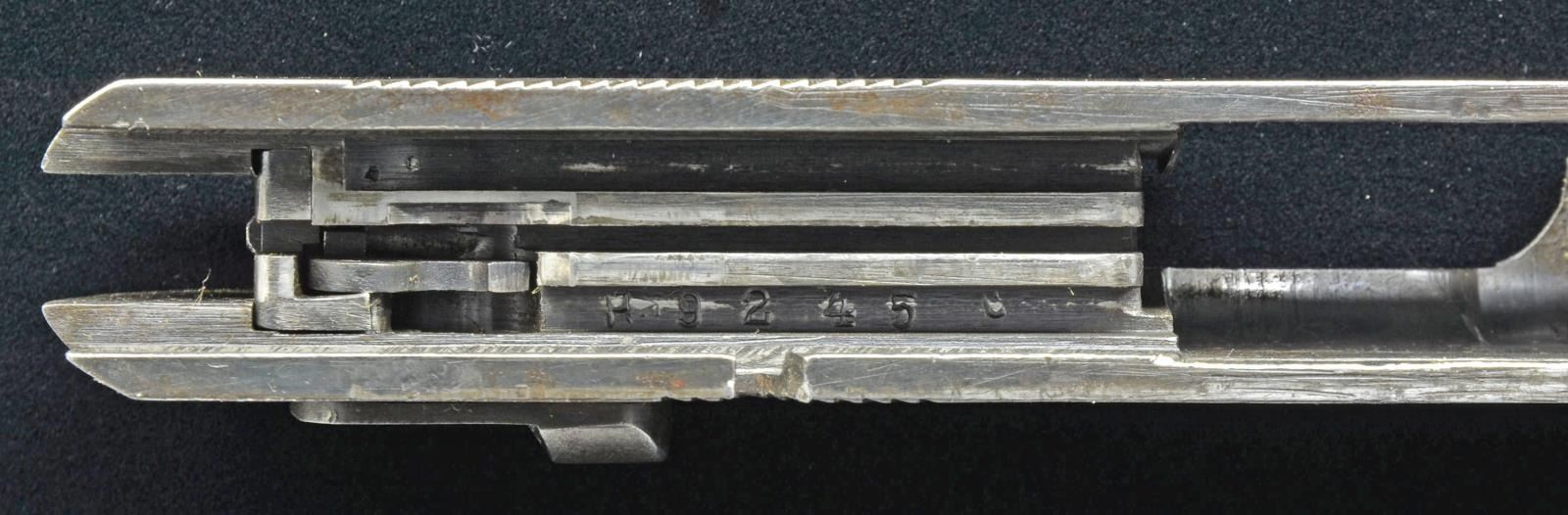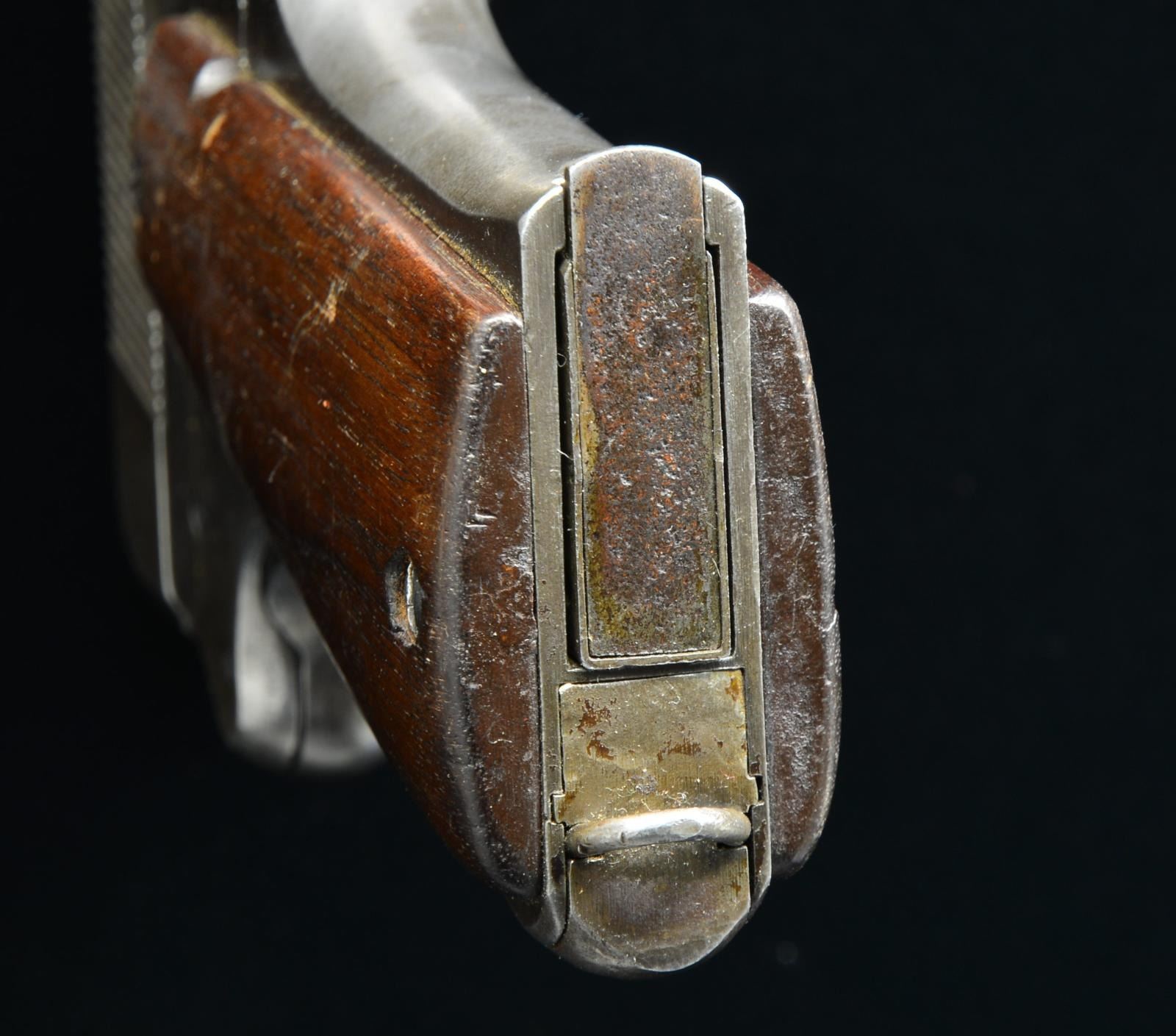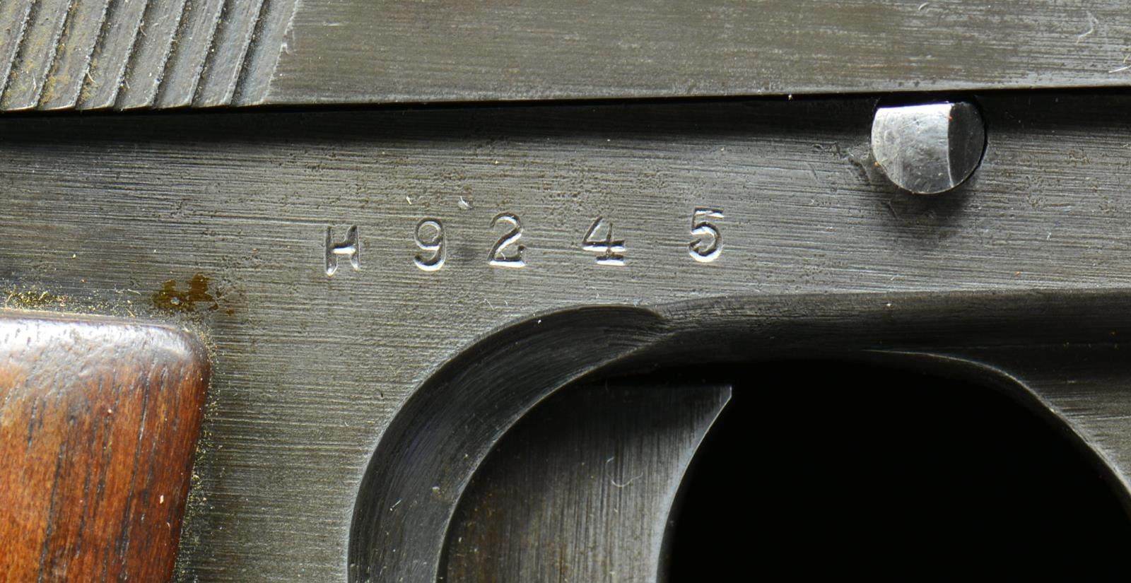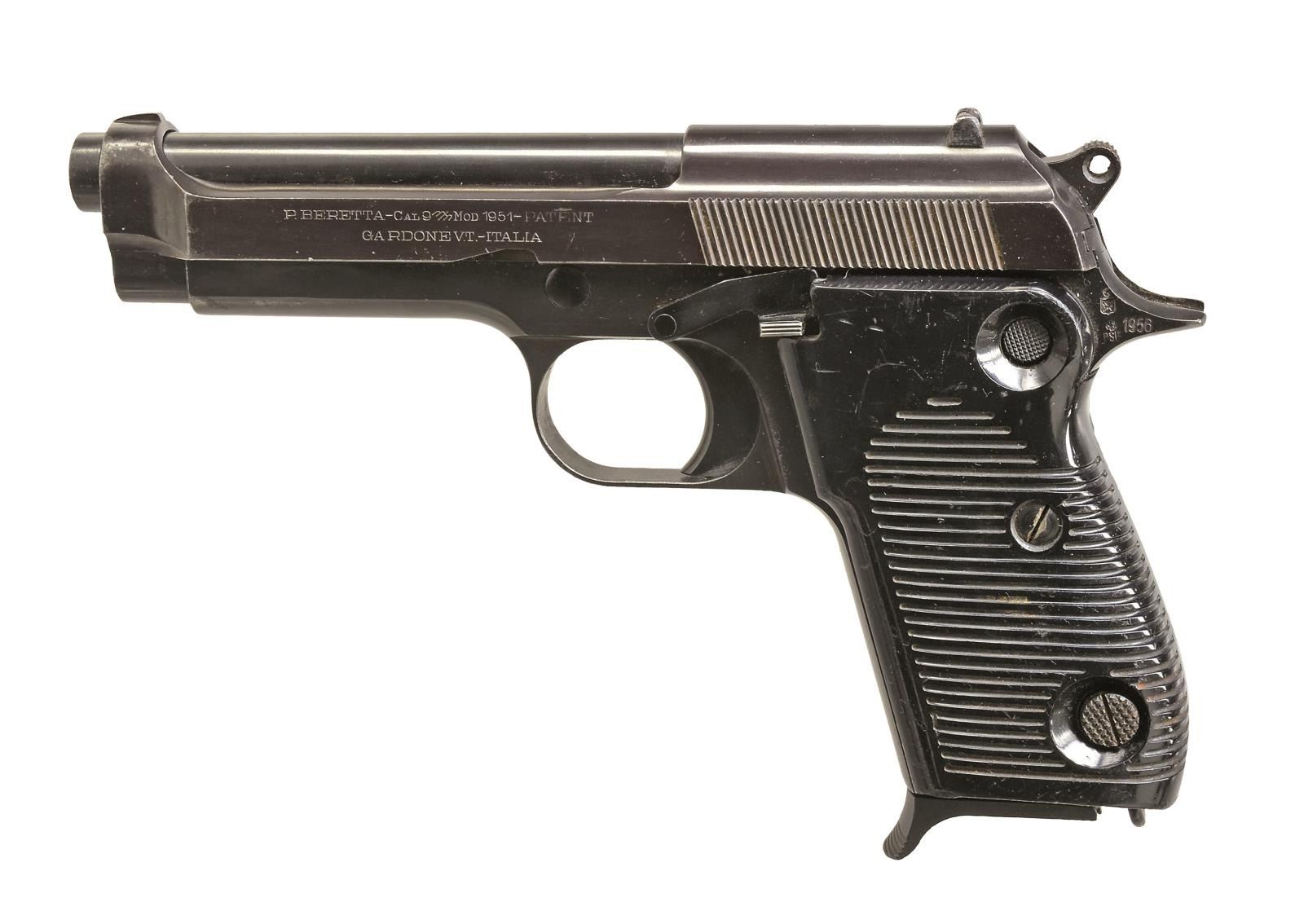 1951. BOTH: cal. 9mm Luger. 1) RADOM MODEL 35. S# H9245. Bbl. 4 3/4". Mfg.1935-1945 w/ matching numbered bbl. & slide. Type 2 w/ 3 levers & no stock slot having German WaA77 proofs. Replacement smooth hardwood grips. MAGS: 1 good 8 rd. w/ eagle "625" proof at bottom of right side. UNATTACHED ACCESSORIES: post war style tan double flap holster w/ stud strap retention, single wide belt loop & spare mag. pouch; very good w/ no markings. CONDITION: good general appearance w/ considerable hand & holster wear. Appearance of cleaned light oxidation. Well made grips w/ wear, light marks & sm. chip. Fair bore; worn w/ even light to moderate pitting. (20-2521/NW). 2) BERETTA MODEL 1951. S# C3074. Bbl. 4 1/2". Mfg. 1956 as Italian service pistol replaced by popular Model 92. Commonly referred to as 951 Brigadier yet slide marked "Mod 1951". Grooved brown plastic grips w/ recesses for hammer block safety & bottom rear mag. release. Ring hammer & lanyard loop. Matching numbered bbl. & "MADE IN ITALY" marked slide. Right front of frame w/ import mark. MAGS: 1 very good 8 rd. w/ finger extension. CONDITION: very good general appearance w/ light high point wear & occasional peppery oxidation. Solid grips w/ light marks throughout. Good to very good bore w/ very slight wear & hint of frosting. (20-2530/NW). BOTH CURIO. $800-1,200.