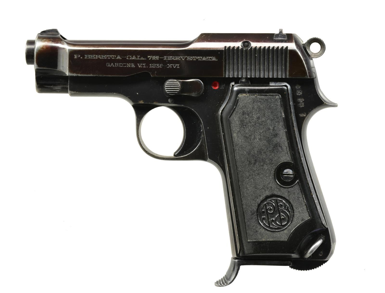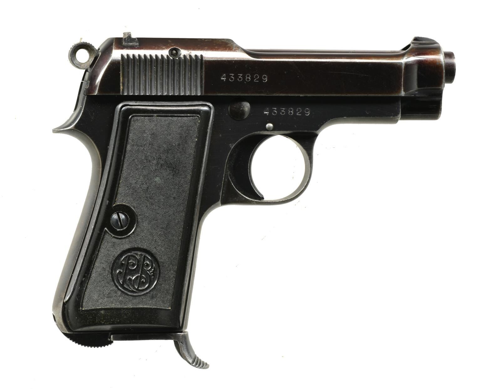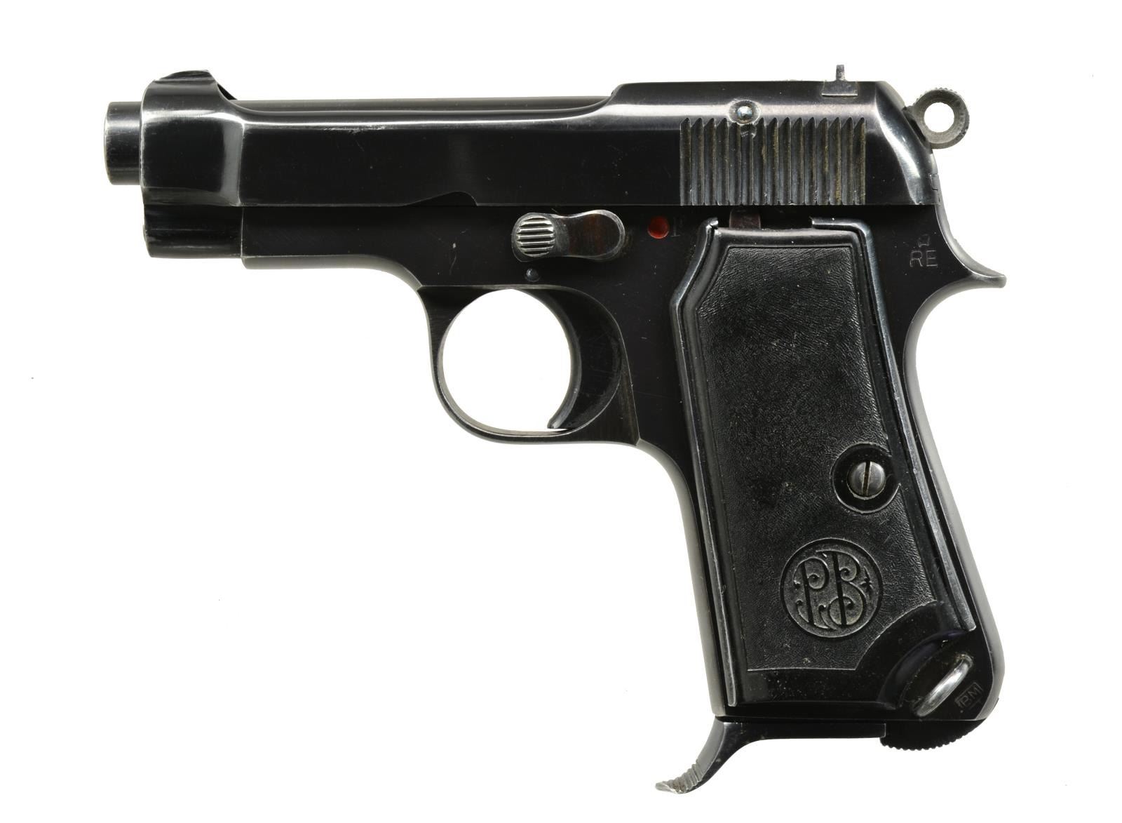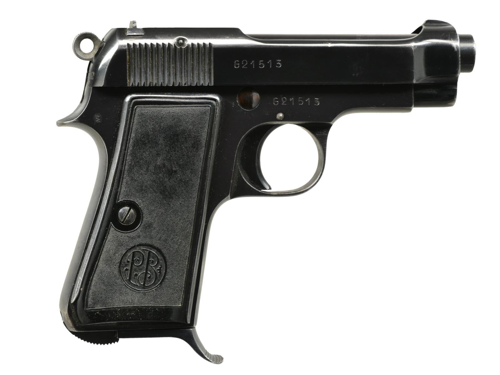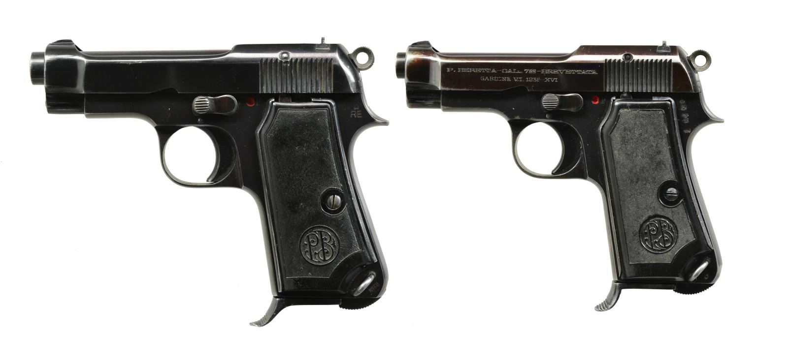 BOTH: gloss blued finish w/ very good “PB” logo metal backed grips. 1) MODEL 1934. Cal. 380 ACP. S# G21513. Bbl. 3 3/8". Matching numbered slide. Postwar production indicated by letter prefix in S#; 1934-1980. Top left rear of frame has “RE” Army mark, lower left rear of frame by lanyard loop w/ boxed “BM” & right front of trigger guard w/ boxed “NS”. Top right rear of frame w/ “IVU” in oval. MAGS: 1 good factory 7 rd. w/ metal finger extension base. CONDITION: very good overall appearance w/ slight finish loss at high edges plus thinning on frontstrap. Very good to excellent bore. (20-1462/NW). 2) MODEL 1935. Cal. 7.65mm (32 ACP). S# 433829. Bbl. 3 1/2". Mfg. 1939 (1935-1967) w/ matching numbered slide. Top left rear of frame w/ numerous proofs & date. Unreadable proof by lanyard loop. MAGS: 1 good factory 8 rd. CONDITION: good general appearance w/ noticeable high point & use wear throughout. Good plus bore w/ faint even frosting. (20-1463/NW). BOTH CURIO. $700-1,000.