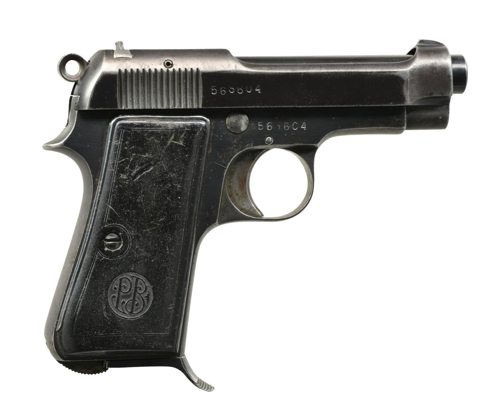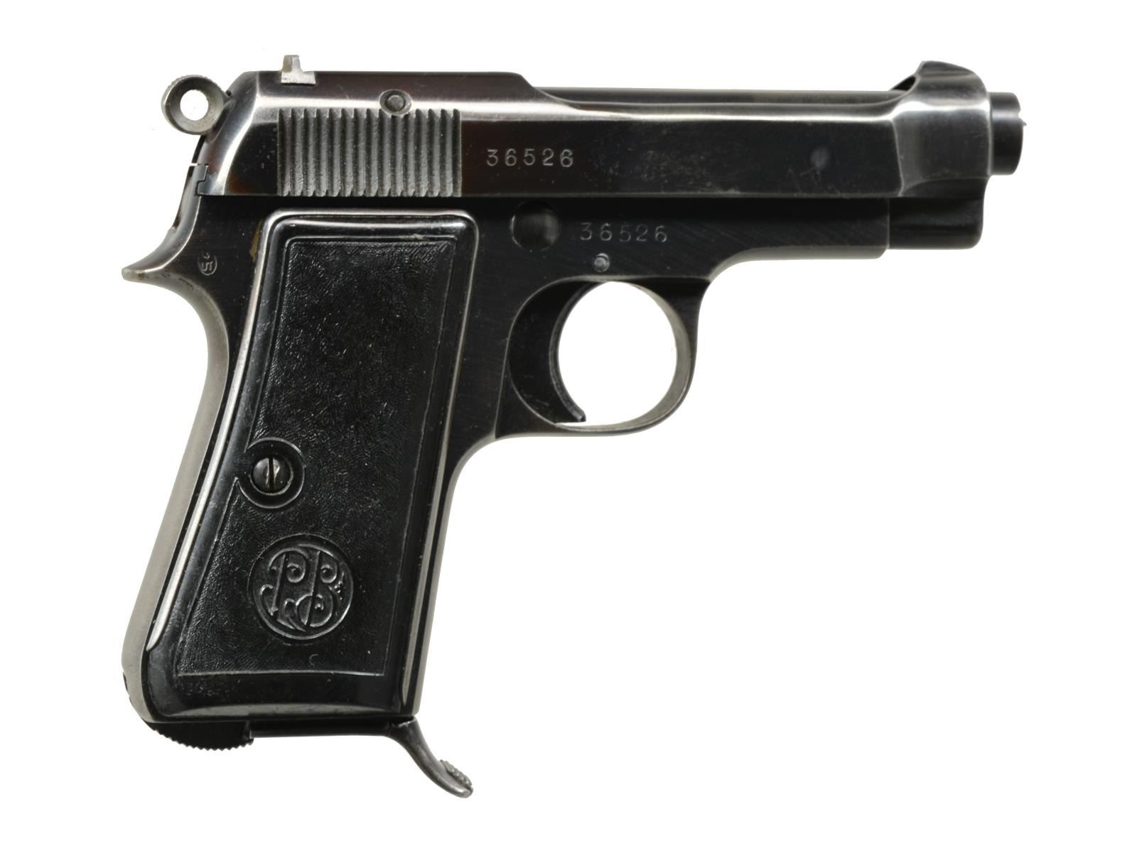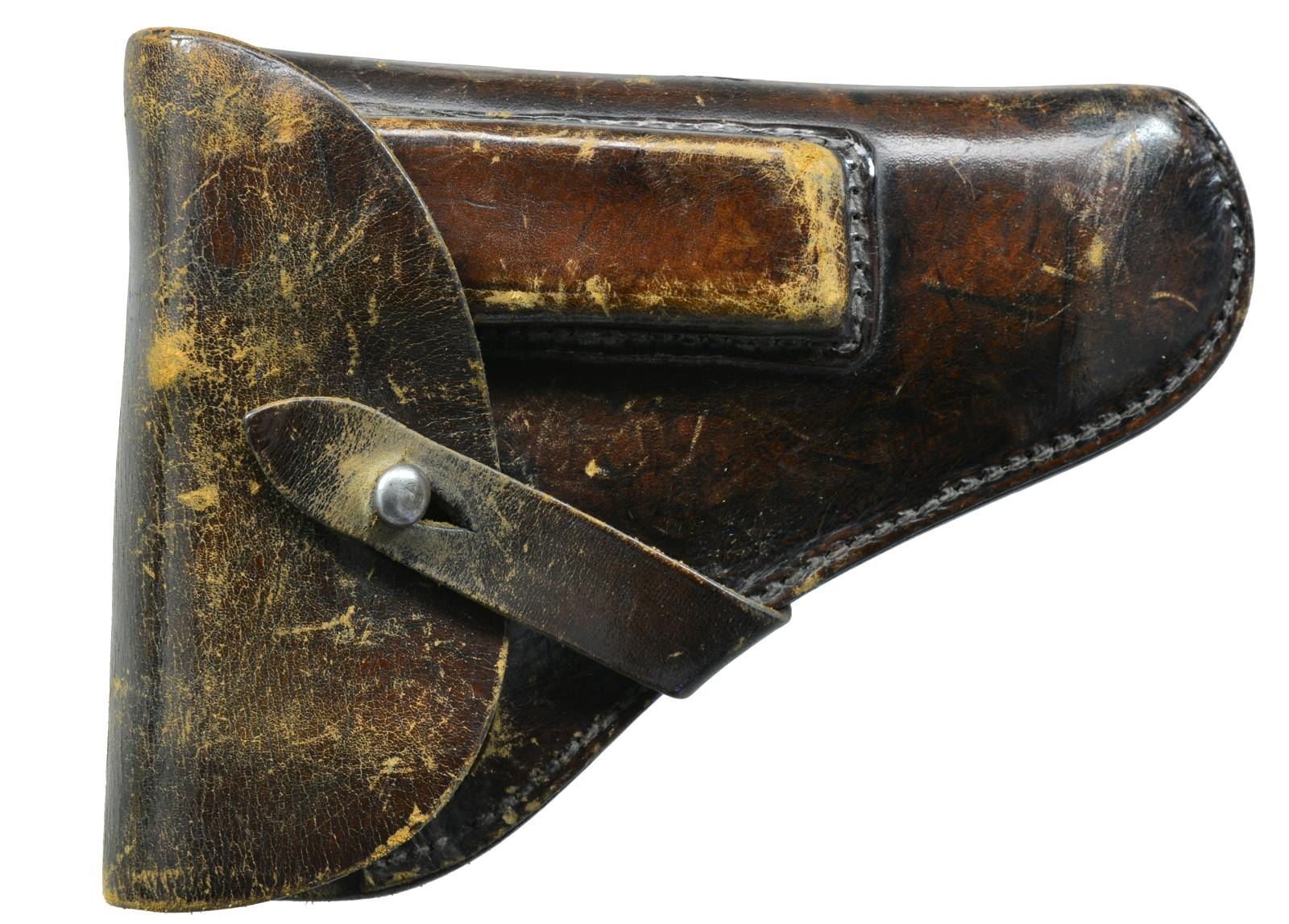 Bbls. 3 3/8". Steel construction w/ blued finish plus “PB” logo metal backed hard rubber grips. Lanyard loops at bottom left rear of frame. Matching numbered slides. Mag. release at bottom of butt. 1) Cal. 9mm Corto (380 ACP). S# 563604. Mfg. 1937 w/ top left rear of frame marked “RE” indicating army use. MAGS: 1 good refinished factory 7 rd. w/ metal finger extension. CONDITION: generally good appearance as refinished having some scattered spots of prior pitting & patina appearance in grip area. Very hand worn grips w/ matte surfaces & borders almost gone plus additional light marks on right grip. Good bore w/ hint of frosting. (20-1460/NW). 2) Cal. 9mm Scurt (380 ACP). S# 36526. Mfg. 1941 for Romania as slide is marked “9 SCURT”. MAGS: 2 good factory 8 rd. w/ finger extensions. Right top rear of frame marked in oval w/ “UT”. UNATTACHED ACCESSORIES: good brown military style flap holster w/ single wide belt loop on back plus stud & strap retention. Spare mag. pouch on front. Numerous scuffs & marks throughout; no markings or structural damage. CONDITION: good to very good overall appearance w/ thinning in grip area & slight high point wear most noticeable on slide. Very good grips & bore. (20-1461/NW). BOTH CURIO. $700-1,000