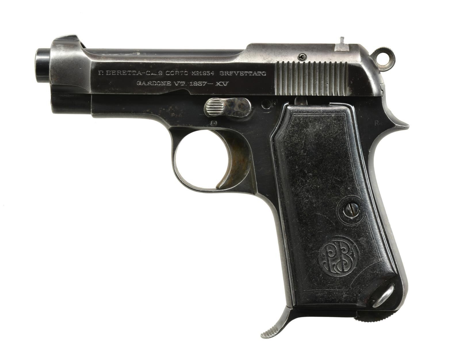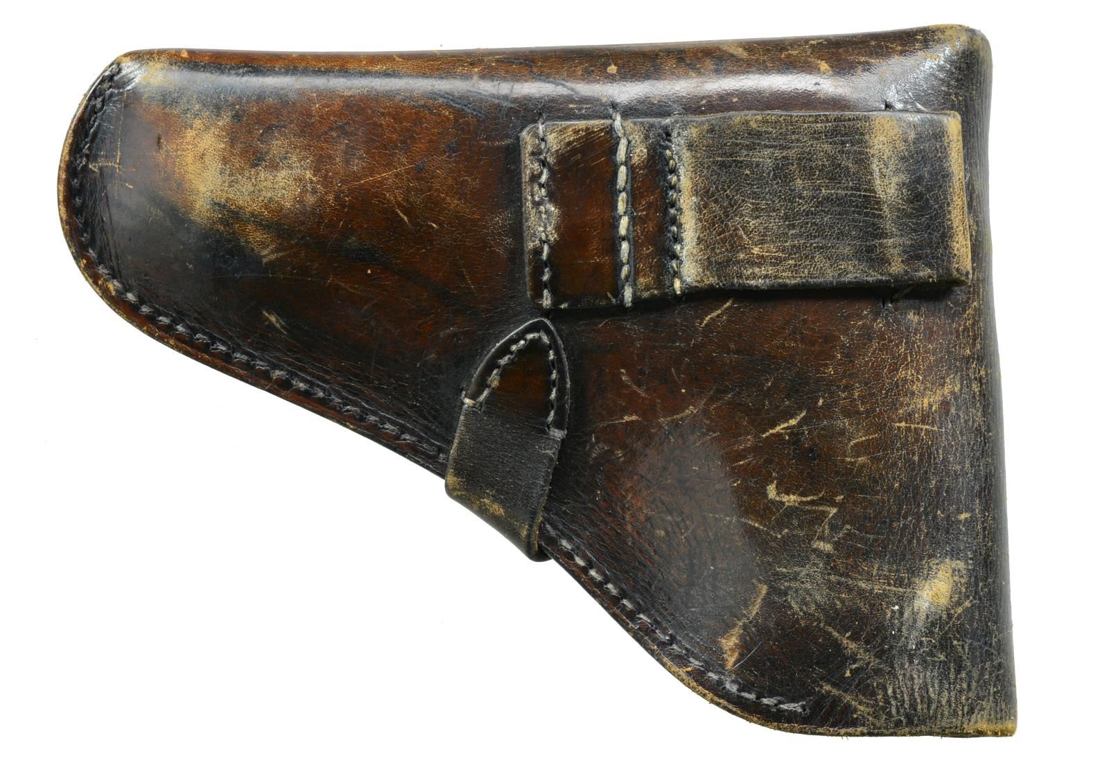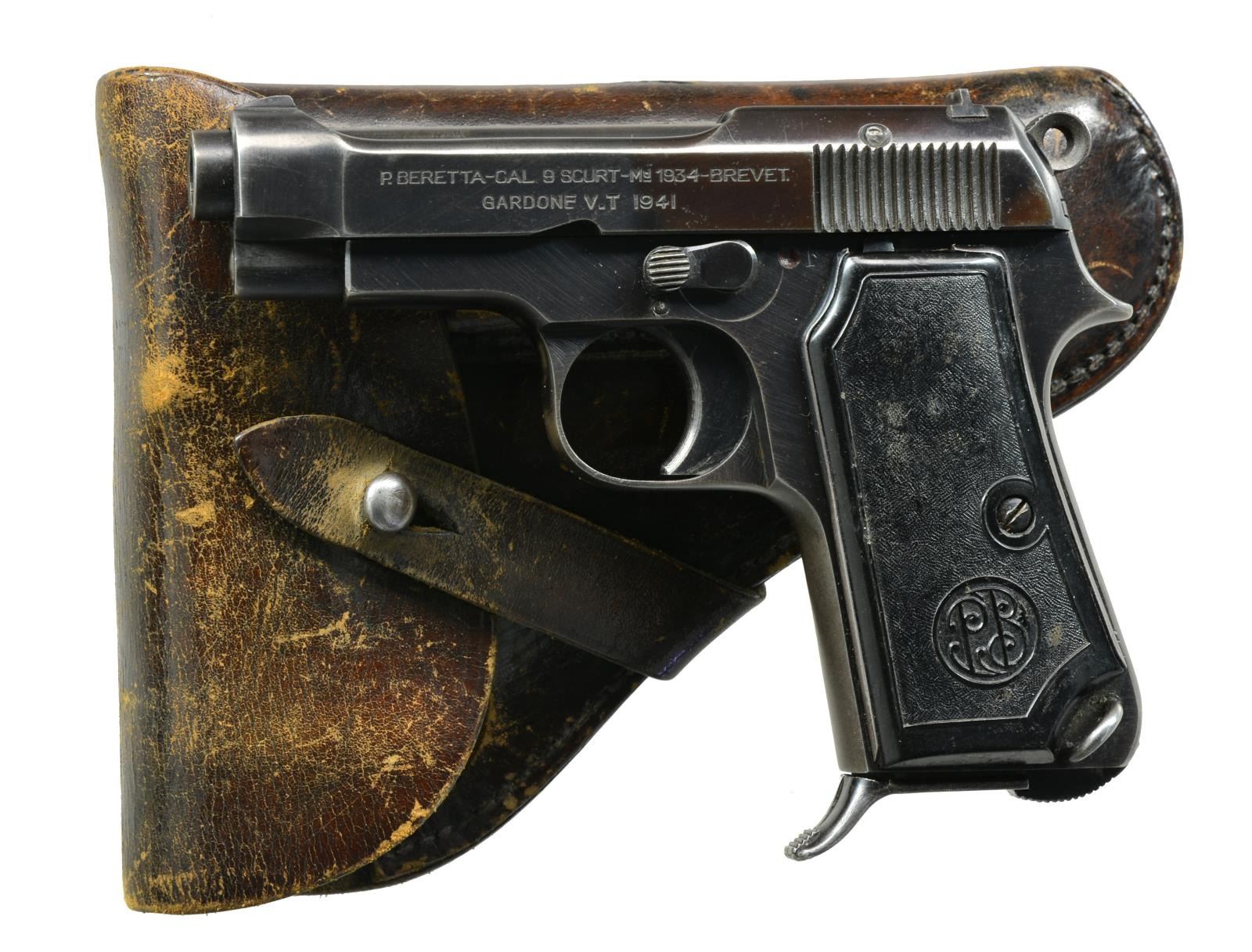 Bbls. 3 3/8". Steel construction w/ blued finish plus “PB” logo metal backed hard rubber grips. Lanyard loops at bottom left rear of frame. Matching numbered slides. Mag. release at bottom of butt. 1) Cal. 9mm Corto (380 ACP). S# 563604. Mfg. 1937 w/ top left rear of frame marked “RE” indicating army use. MAGS: 1 good refinished factory 7 rd. w/ metal finger extension. CONDITION: generally good appearance as refinished having some scattered spots of prior pitting & patina appearance in grip area. Very hand worn grips w/ matte surfaces & borders almost gone plus additional light marks on right grip. Good bore w/ hint of frosting. (20-1460/NW). 2) Cal. 9mm Scurt (380 ACP). S# 36526. Mfg. 1941 for Romania as slide is marked “9 SCURT”. MAGS: 2 good factory 8 rd. w/ finger extensions. Right top rear of frame marked in oval w/ “UT”. UNATTACHED ACCESSORIES: good brown military style flap holster w/ single wide belt loop on back plus stud & strap retention. Spare mag. pouch on front. Numerous scuffs & marks throughout; no markings or structural damage. CONDITION: good to very good overall appearance w/ thinning in grip area & slight high point wear most noticeable on slide. Very good grips & bore. (20-1461/NW). BOTH CURIO. $700-1,000