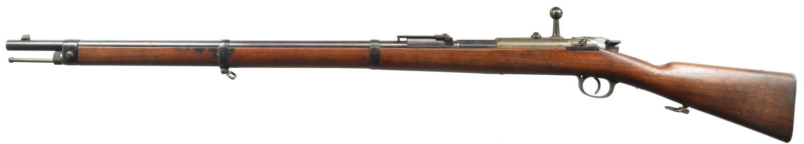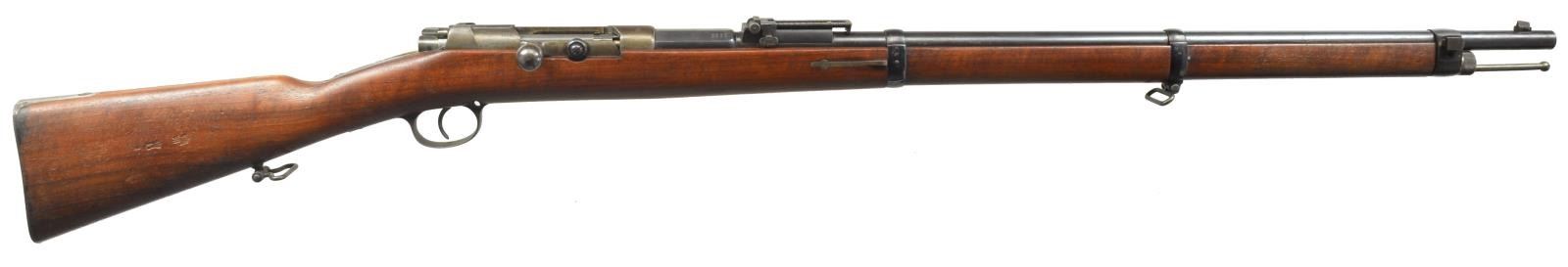 Cal. 11x60Rmm. S# 1987. Bbl. 31 1/2" w/ right side bayonet lug on front band. Blade front sight w/ 1400m tangent rear sight. Bolt action w/ extractor having 8 rd. tubular mag. in forearm. Receiver is dated 1888. Bbl., receiver & bolt have matching numbers. 3 Band fastened walnut stock w/ iron fittings. Peak of buttplate marked "GRS / 1 45". Right side of butt has shared proof marks. CONDITION: bbl. & fitting retain 80% blue showing scattered spots of corrosion. In the white action finish is acquiring a light tarnish. Stock has lightly worn original finish showing scattered sm. marks. Bore retains sound rifling showing pitting in grooves. (01-18440/DS). ANTIQUE. $700-1,100.