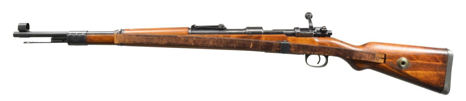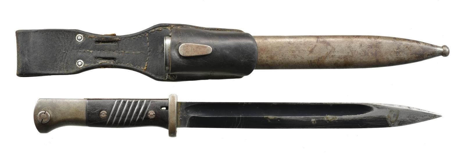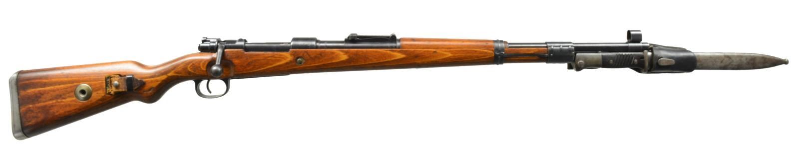 Cal. 8mm Mauser. S# 16395. Bbl. 23 5/8". Very nice appearing late war M98K. Receiver marked “Mod 98” on left rail. Receiver ring marked on top “byf 44”. Left side of receiver ring has German eagle proof. Right side of receiver ring has 2 eagle “135” markings. S# matches on all parts except bolt assembly. Tangent rear sight graduated to 2000m. Inverted V front sight w/ protective hood. Cleaning rod & bayonet lug are present. Stamped furniture includes solid upper band. Trigger guard w/ detachable floorplate. Cup type buttplate. Laminated stock set made w/ steel takedown hole. Correct, well worn, military sling. UNATTACHED ACCESSORIES: 9 7/8" fullered blade bayonet w/ grooved Bakelite grips. Bayonet marked on left ricasso “cqh”. Matching steel scabbard & unmarked leather frog. CONDITION: stock set has had professional type light refinish, rendering markings obscure. Metal has 85% original wartime finish w/ light wear & handling marks. Markings on receiver have been enhanced in white. Near excellent, shiny bore. Bayonet has unsharpened blade w/ 60% original blue finish. Balance of metal turning gray & patina. Scabbard is gray & patina w/ pitting & light wear. Frog has wear, flexing & staining. (20-1812/RW). CURIO. $600-900.