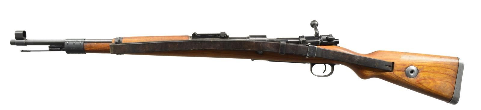 Cal. 8mm Mauser. S# 41273e. Bbl. 23 5/8". Model 98K rifle. Receiver marked on left rail w/ “Mod 98”. Receiver ring marked on top w/ “byf 44”. Receiver ring marked on right side w/ eagle “135”. S# matches on receiver, bolt assembly & floorplate. Left side of receiver & bbl. have German eagle proofs. Tangent rear sight graduated to 2000m. Inverted V front sight w/ protective hood. Cleaning rod & bayonet lug are present. All stamped furniture including solid upper band & trigger guard w/ removable floorplate. Correct WW2 sling marked “L&F”. Unmarked laminated stock set w/ steel takedown hole & cup type buttplate. CONDITION: stock set has arsenal rework type finish w/ light wear, staining & handling marks. Metal has 85% arsenal rework finish w/ light wear & scattered handling marks. Very good, shiny bore. (20-1815/RW). CURIO. $600-900.