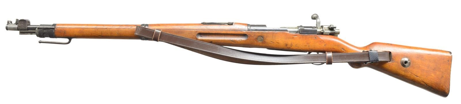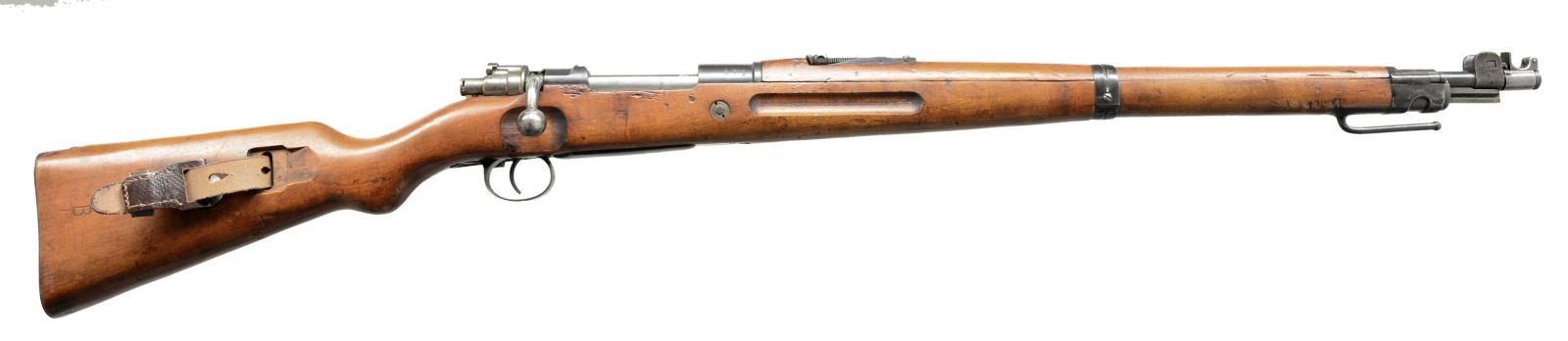 Cal. 8mm Mauser. S# 1804ii. Bbl. 23 5/8". All visible numbers match except detachable muzzle cap. Very nice example of scarce WWI carbine w/ crisp markings. Receiver marked on left side in script "Kar 98". Receiver ring marked on top w/ crown "ERFURT 1917". Receiver ring marked on right w/ Imperial proofs. Tangent rear sight graduated to 2000m. Inverted V front sight. Turn down bold handle w/ flattened checkered knob. Has bayonet bar & stacking rod. Has newly mfg. replacement side sling. Hardwood stock set w/ grasping grooves. Steel takedown hole. Right side of butt has crown acceptance marks & "C" & "B". UNATTACHED ACCESSORIES: steel muzzle cover w/ hinged cap. Cap is numbered "1802". CONDITION: original finish stock set has wear & handling marks expected on a rifle that has seen some service but has a very good appearance. Metal has 60% original blue w/ thinning wear & scattered spots of light oxidation. Very good shiny bore. (20-3027/RW). CURIO. $600-900.