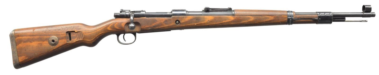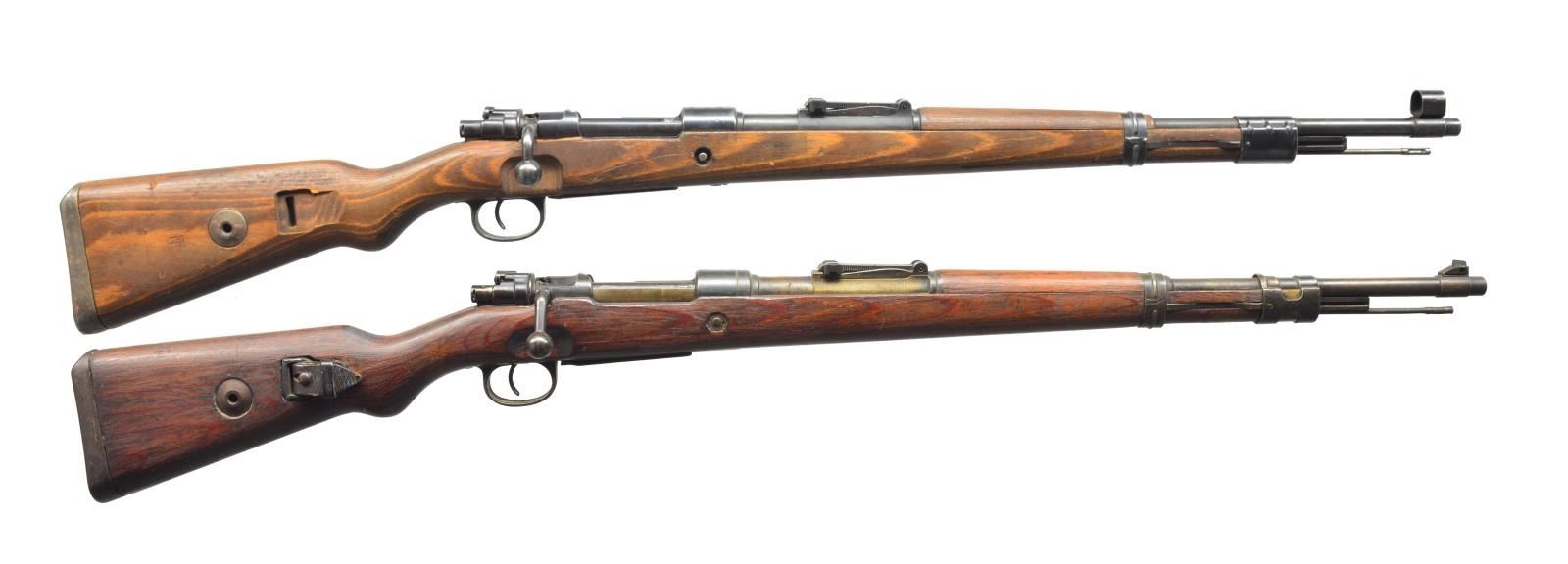 All: Cal. 8mm Mauser. Bbl. 23 5/8". 1) S# 4315h. S# matches on receiver, rear sight base & upper band. Receiver is marked on left rail Mod. 98; marked on top w/ lower case "ce" & "44" & Waffen amt ?7 & receiver ring marked on right side "WaA 280" & "WaA 37". Tangent rear sight graduated 2,000 meters; inverted V front sight w/ protective hood. Turn down bolt handle w/ checkered knob. Bolt handle marked underneath w/ imperial eagle & crown acceptance marks. Cleaning rod & bayonet lug present; stamped solid upper band & stamped lower band; stamped trigger guard w/ milled floorplate. Cupped tight buttplate; laminated stock set w/ steel takedown hold. Buttstock marked on right side w/ eagle "H". CONDITION: stock set has worn, stained original finish w/ scattered handling marks, notable gouge in right side of forend; right recoil bolt retaining nut is not present; metal has arsenal rework type finish w/ light wear & thinning. Very good shiny bore. (20-2946/RW). 2) S# 1168L. Mfg. Waffen Werke Brunn (dot). Non matching #s throughout. Left receiver marked on left rail Mod. 98; receiver ring marked on top dot 1943 & indistinct Waffen amt. Tangent rear sight graduated to 2,000 meters; inverted V front sight; turn down bolt handle; cleaning rod & bayonet lug are present; H type upper band w/ raised lip at rear for rifle w/ long hand guard. Stamped lower band; stamped trigger guard in floorplate; cupped type buttplate. Laminated stock set w/ steel takedown hold. Vintage smooth leather sling. CONDITION: stock set has original finish w/ staining, light wear & handling marks. Metal has traces of blue turning gray & patina w/ light wear & light oxidation. Very good shiny bore. (20-2976/RW). CURIO. $400-700.