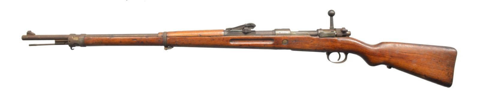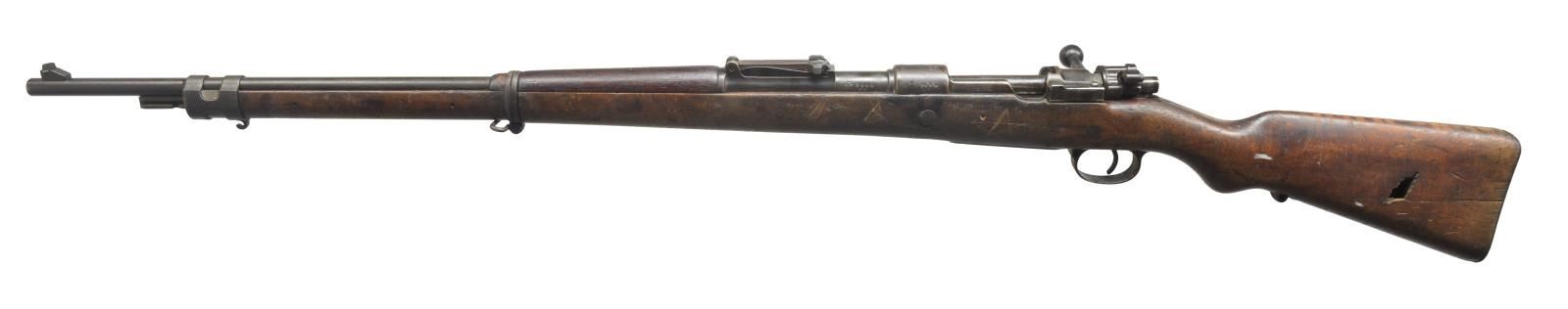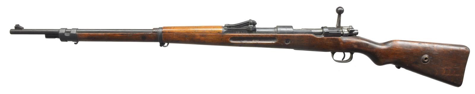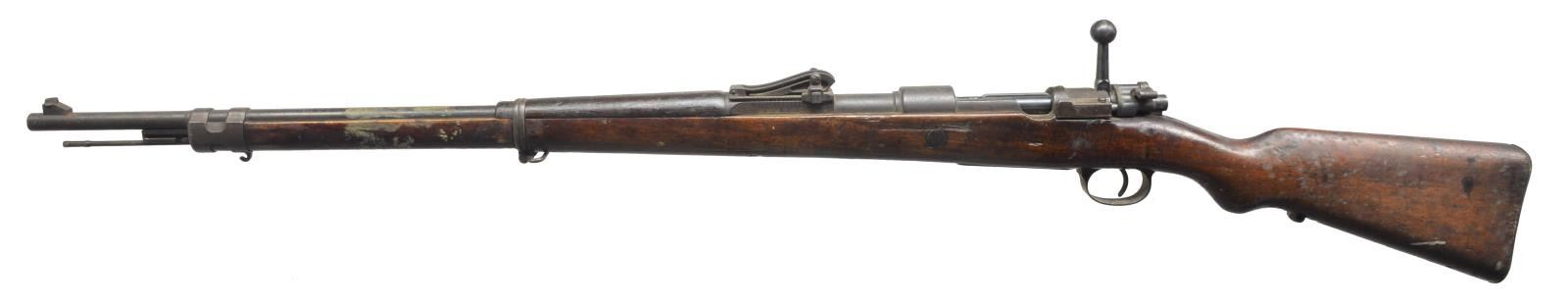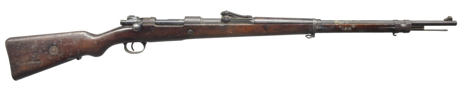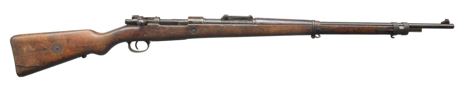 ALL: cal. 8mm Mauser. Bbls. 29 1/4". 1) S# 2879R. Left receiver rail marked “GEW.98”. Receiver ring marked on top “V.CHR. SCHILLING SUHL 1917”. Marked on right side w/ Imperial proofs. All visual #s match except bolt assembly. Straight bolt handle. Lange graduated to 2,000m; inverted V front sight; cleaning rod not present; hardwood stock set w/ walnut hand guard; buttstock marked on right side w/ Imperial crown acceptance marks & “B”. CONDITION: stock set has added flaking finish over wear, dents, staining & scratches; buttstock has 2 lg. cracks on left side. Metal has lg. percentage of arsenal rework, black finish w/ wear, oxidation & scattered light pitting. Lock screws are not present in trigger guard. Very good bore. (20-2957/RW). CURIO. 2) S# 8444BB. S# matches on bbl., receiver, rear sight & trigger guard assembly. Receiver rail marked on left side “GEW 98”; receiver ring marked on top w/ Imperial crown Danzig; additionally marked “1920”; marked on right side w/ Imperial proofs. Bbl. marked over chamber w/ "droop wing" eagle, Weimar proof. Rifle is a transitional model used by the Reichswehr. They were given a modernized tangent rear sight to replace the Lange sight. Rear sight is marked underneath leaf w/ "SS" indicating rifle is correct to use w/ "heavy ball" ammunition. Rear sight graduated to 2000m. Inverted V front sight. Straight bolt handle. Cleaning rod is not present. Upper band retains parade hook. Narrow lower band. Non-matching walnut stock set. Imperial acceptance marks on right side of butt. Stock disk markings are very faint. CONDITION: buttstock is heavily worn w/ staining, dents & scratches throughout. Buttstock has notable damage on left side from a metal fragment which is still imbedded deep within the stock. Stock has extensive cracking on both sides due to impact of fragment. Stock has crack on left side around recoil bolt. Metal turning overall gray & patina w/ wear, light oxidation & scattered fine pitting throughout. Rear guard lock screw is not present. Rear sight has notably more finish than balance of rifle. Fair worn bore. (20-2958/RW). CURIO. 3) S# 2109A . All visible numbers match except bolt assembly. Receiver marked on left rail "GEW.98" & is marked on top receiver ring w/ Imperial crown & "ERFURT 1905". Bbl. marked on top of chamber "S". Lange rear sight, inverted V front sight. Straight bolt handle. Cleaning rod is present. Upper band retains parade hook. Walnut stock set. Buttstock marked on right side w/ worn Imperial proofs. Disk marked "67.R.E. 3227." CONDITION: stock set has extensive wear, dents, staining & scratches throughout w/ added finish. Stock has notable gouge on left side over recoil bolt & on right side of buttstock at toe. Sm. area of white paint by butt swivel. Forend & bbl. have area of white stain between upper & lower bands. Forend has duffel cut by lower band. Metal has turned over all patina w/ oxidation & fine pitting throughout. Replacement bolt has retains 50% original blue. Poor worn oxidized bore. (20-2959/RW). CURIO. 4) S# 621AA. All visible numbers match except bolt assembly. Receiver marked on left rail "GEW.98". Receiver ring marked on top w/ Imperial crown, "DANZIG" & 1916. Bbl. marked over chamber "S". Lange rear sight graduated to 2000m. Inverted V front sight. Straight bolt handle. Cleaning rod is present. Upper band has parade hook. Walnut stock set. Acceptance marks on right side of butt have been obscured. Disk appears unmarked. CONDITION: stock set has arsenal rework type finish w/ added finish. Has wear, dents, scratches & staining throughout. Sm. gouge on top at heel. Crack at right top of grip. Metal has turned overall gray & patina w/ oxidation & fine pitting throughout. Rear sight has had metal removed on left side of slide. Replacement bolt does not seat fully home. Bore has solid full-length plug. (20-2960/RW). CURIO. $800-1,200.