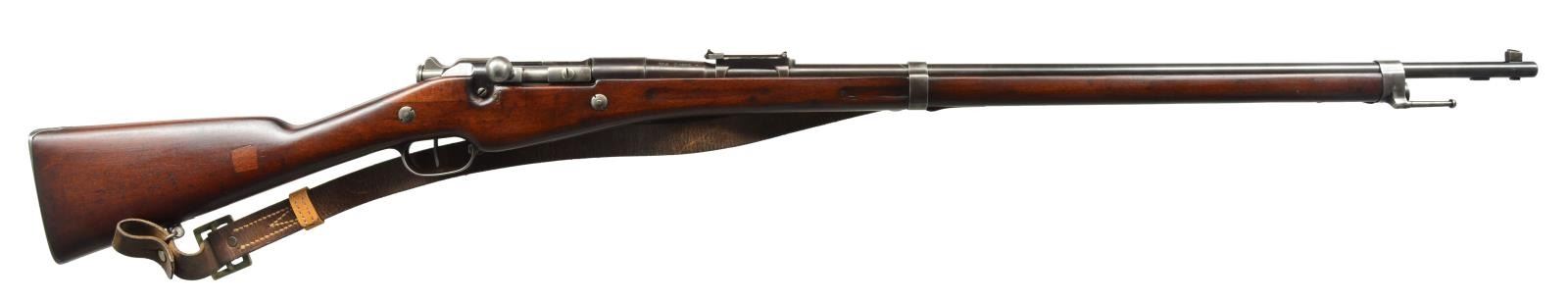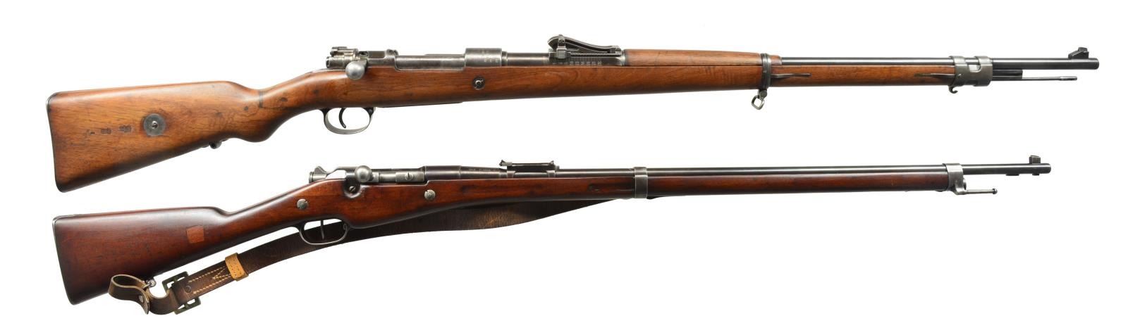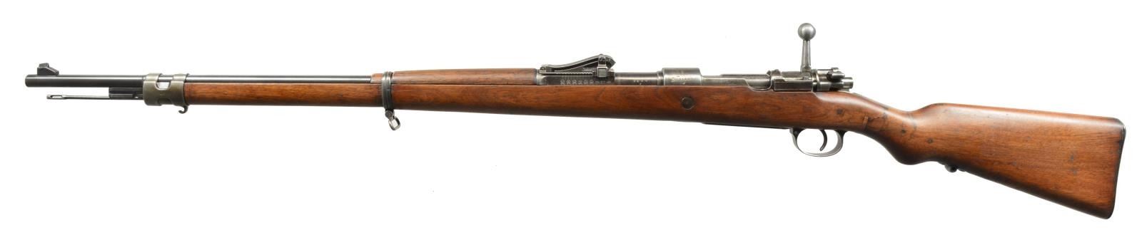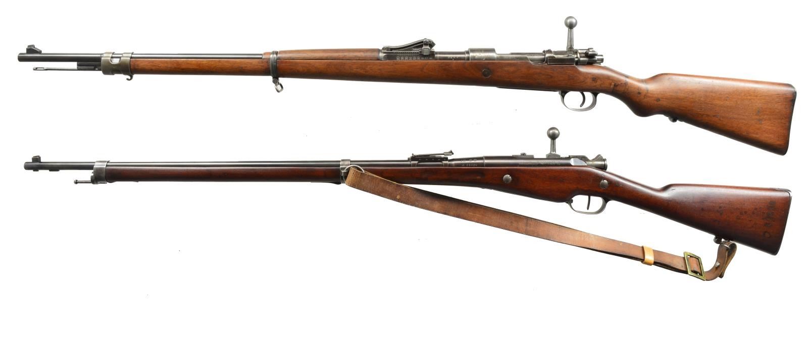 1) GEW 98 MAUSER. Cal. 8MM Mauser. S# 5143. Bbl. 29". All visible numbers matching. Receiver is marked on left rail in gothic “GEW 98”. Receiver ring marked on top “DEUTSCHE WAFFEN-UND MUNITIONSFABRIKEN BERLIN 1915”. Marked over chamber w/ “S”. Lange rear sight graduated to 2000m. Inverted V front sight. Cleaning rod is present. H type upper band retains parade hook. Bottom swivels. detachable butt swivel is not present. Matching walnut stock set w/ unmarked steel identity disk on right side & German crown acceptance marks. CONDITION: stock has professional type refinish w/ light wear & handling marks. Buttstock has been broken off at the wrist & been repaired w/ glued joints & inletted wood filler pieces. Metal has been cleaned, retaining traces of original blue turning gray. Receiver, which was in the white, turning overall gray & patina. Fair, worn bore turning dark in grooves. (20-1990/RW). 2) BERTHIER MODEL 1907/15. Cal. 8mm Lebel. S# 65039. Bbl. 31 1/2". Numbers match on bbl., bolt & trigger guard. Receiver is marked on left side w/ script “Chatellerault”. Bbl. is marked over chamber w/ “JH”. Marked on right side “NA C 1915”. Straight bolt handle. Ladder rear sight graduated to 2400m. Blade front sight. Stacking rod is present. Walnut stock. Vintage, unmarked leather military sling w/ replaced keeper. CONDITION: stock has professional restoration, including inletted repairs on right side of butt, right side of action above trigger guard & left side of forend below grasping groove. Numbers are partially obscured w/ wood filler at butt. Metal has been cleaned w/ traces of blue turning gray w/ light wear overall. Good shiny bore w/ sharp lands. (20-1992/RW). BOTH CURIO. $1,100-1,500.
