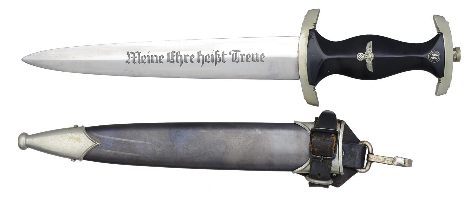 Overall length: 14 7/8". Blade is etched “Meine Ehre Heisst Treue”. The reverse of the blade is marked, “SS 121/34 RZM”. This maker is as yet unidentified but was working in 1934. Nickel silver mounts. Black wooden grips w/ inset eagle & black enameled SS button. Acid blued black colored scabbard w/ nickel silver mounts. Original 1933 pattern hanger attached. CONDITION: blade shows original factory polish w/ some scabbard wear. Mounts & grip show light wear. Scabbard also shows light wear. Hanger has very minor flexing & flaking to the securing strap. All in all, this is an exceptionally fine example of a seldom seen M1933 SS dagger. (02-14612/BF). $2,000-3,000.