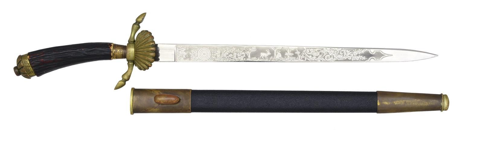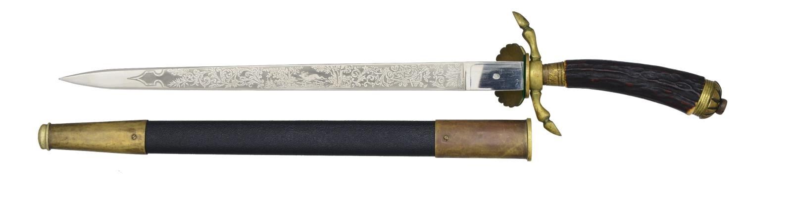 Overall length: 19". Blade is etched over 4/5 of its length w/ hunting & shooting scenes highlighted by foliate decoration. There is a tiny mark on the ricasso that is double stamped but appears to be an early Horster mark. Gilded brass mounts w/ stag horn grip. Gilded brass mounted, leather covered scabbard. CONDITION: blade shows original factory polish. Hilt retains traces of gilded finish in protected areas. Scabbard mounts also show traces of gilding in protected areas. Scabbard body also shows light wear. (02-14623/BF). $800-1,200.