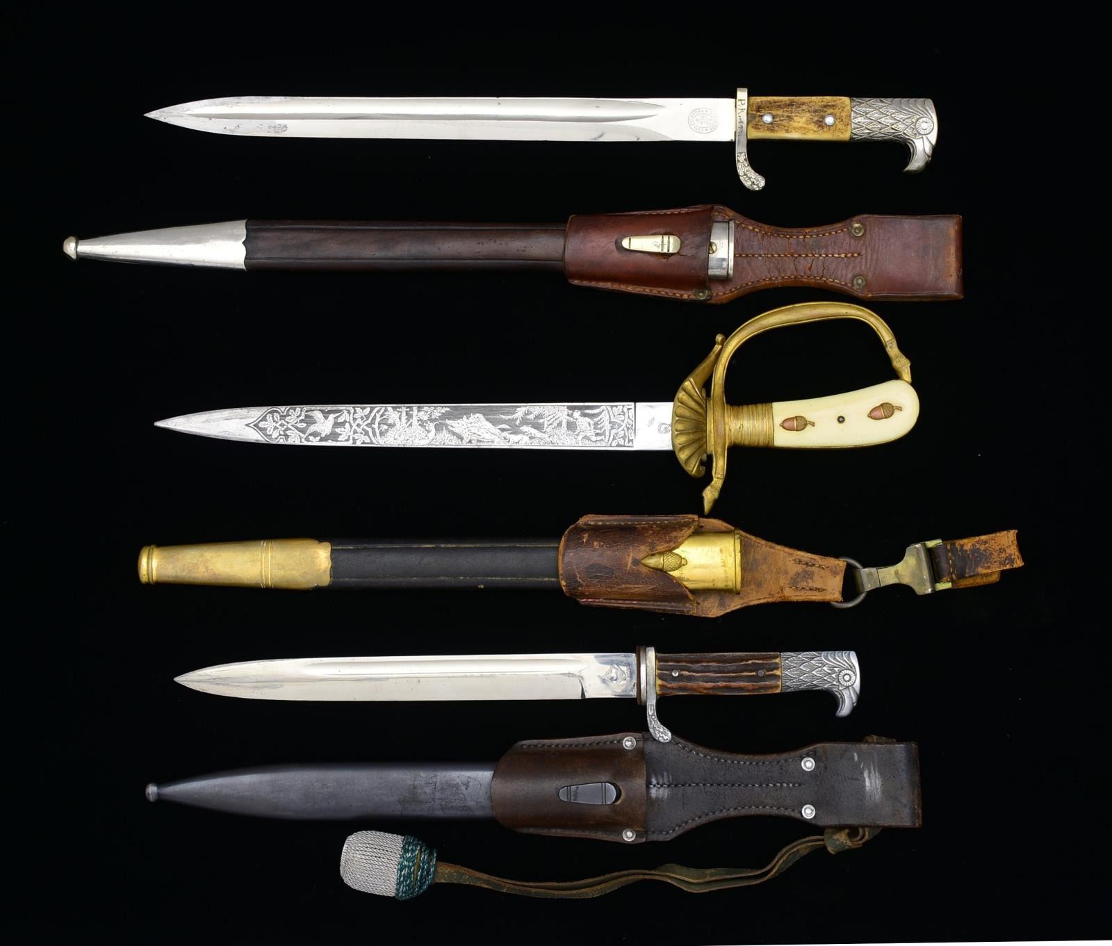 1) POLICE BAYONET. Overall length: 19”. Single fullered blade marked, “CARL EICKHORN (squirrel) C.E. * SOLINGEN *”. Plated crossguard & eagle head pommel. Crossguard is stamped, “P.K.177.”. 2 Piece stag horn grips w/ 2 rivets on each side. Aluminum police eagle on front grip. Leather scabbard w/ plated mounts. Brown leather frog dated 1937. CONDITION: blade shows substantial original factory polish w/ minor discoloration toward the tip. Hilt is exceptionally well executed. There are 3 sm. filled holes in the grip. Scabbard shows light wear overall. 2) POLICE BAYONET. Overall length: 15”. Single fullered blade marked at the ricasso, “(puma head) PUMA SOLINGEN”. Aluminum crossguard & eagle head pommel. 2 Piece stag horn grips w/ 2 rivets on each side. Aluminum police eagle on front grip. Blued steel scabbard. Brown leather frog dated 1938. There is a police knot attached to the scabbard. CONDITION: blade has substantial original factory polish w/ some scabbard wear. Hilt shows light wear. Police eagle shows moderate wear. Scabbard, frog & knot show light wear overall. 3) FORESTRY DAGGER. Overall length: 17 3/4". Blade is etched over 4/5 of its length w/ various hunting & forest scenes. Blade is marked “(knights head) W K C”. Gilded brass hilt w/ hoof quillon. 2 Piece white composite grip. Grip has 2 acorns on 1 side & a single acorn on the other. Gilded brass mounted black leather scabbard w/ felt backed brown frog. Hanger attached. CONDITION: blade has original factory polish w/ some minor scabbard wear. Hilt generally shows light wear. There are 3 grip acorns missing. Scabbard shows light wear. Frog & hanger show moderate to heavy wear. (02-14634(3)/BF). $1,000-1,400.