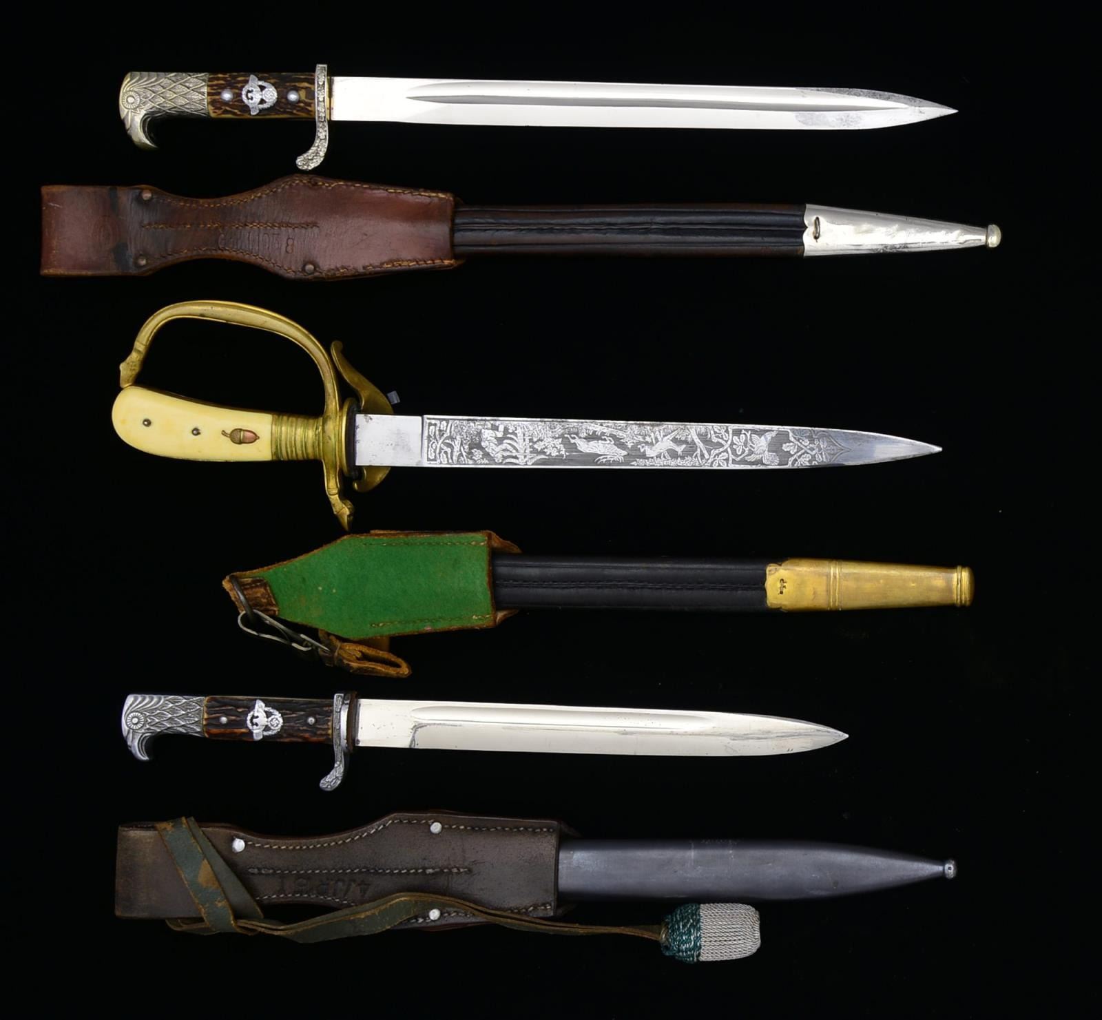 Lot 1217 2 WWII GERMAN POLICE BAYONETS & A FORESTRY DAGGER.