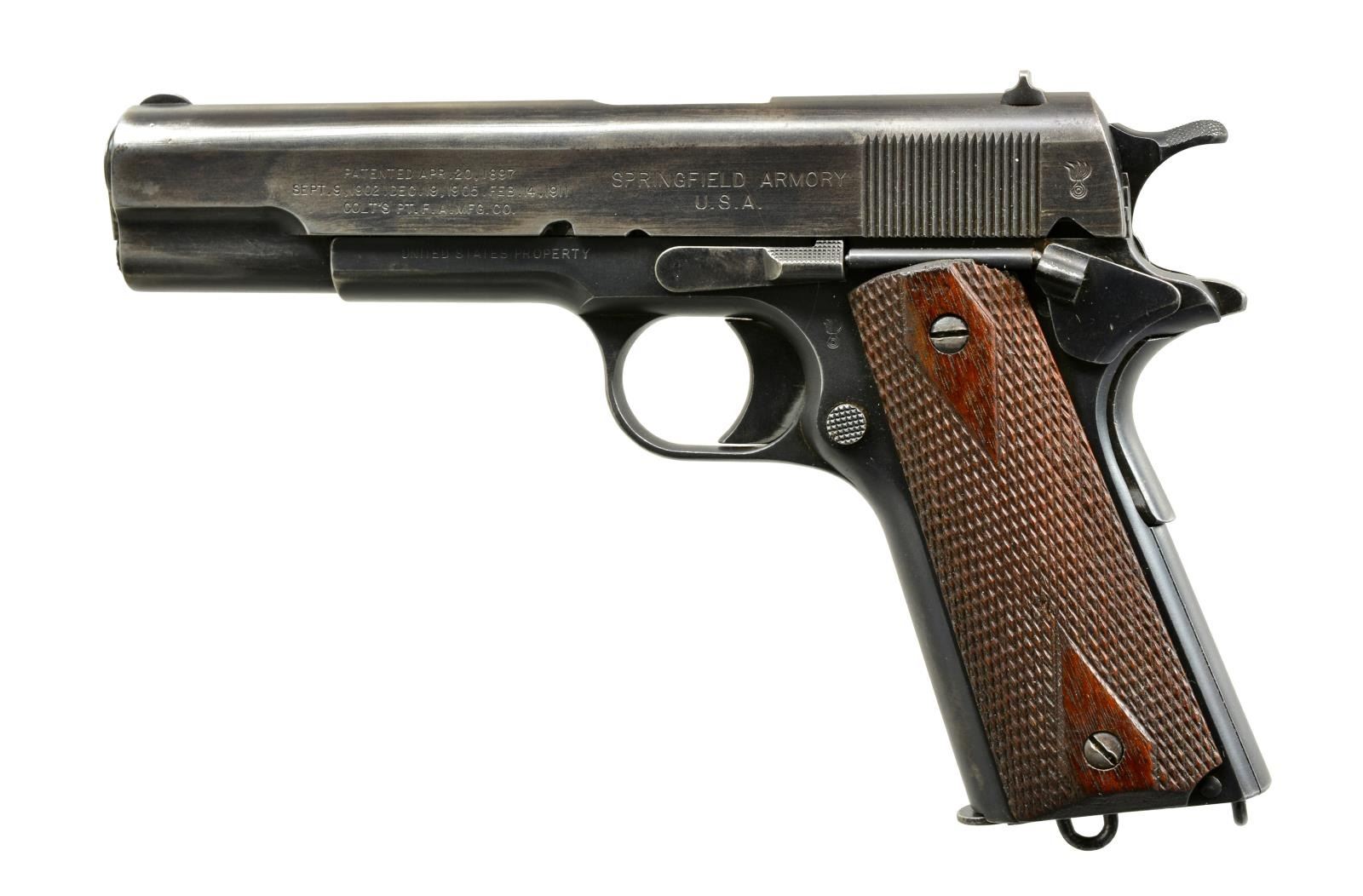 Cal. 45 ACP. S# 115695. Bbl. 5" marked "P" on left side of leg & "S" on right side of leg. Springfield Armory marked slide having Ordnance bomb w/ bullseye inside cannonball behind serrations. Left side of frame marked "UNITED STATES PROPERTY" & Ordnance bomb w/ bullseye inside cannonball above mag. release. Firing pin stop is properly rounded on the upper rear edge. Bbl. bushing, firing pin stop & extractor marked "S". Hammer is unmarked. Grip safety marked "G". Diamond checkered walnut grips. Proper blue/black rust blued finish. MAGS: 1 two tone 7 rd. w/ sides of body wrapped under base having lanyard ring. UNATTACHED ACCESSORIES: repro. Model 1911 storage box w/ wax paper. CONDITION: over 80% original blue showing fading on slide & edges. Grips show moderate wear. Bore is bright w/ strong rifling. (20-1936/DS). CURIO. $3,500-5,000.