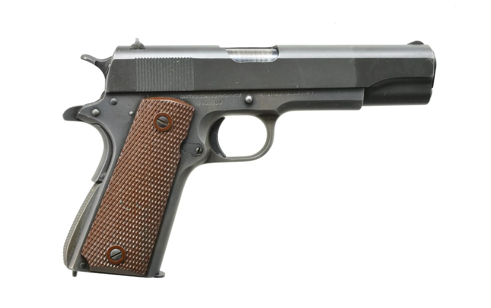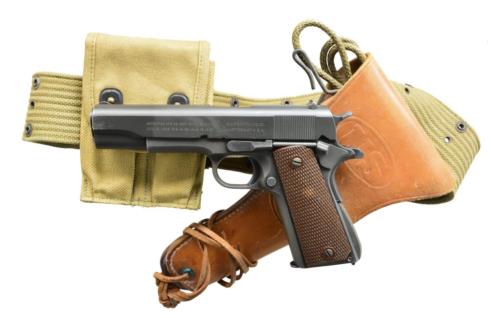 Cal. 45 ACP. S# 909908. Bbl. 5" blued, marked "COLT 45 AUTO" on left side w/ "P" on left leg. Parkerized finish. Checkered plastic grips w/ lg. reinforcement rings. Left side of frame has "GHD" inspector initials w/ "P" firing proof. Right side has lightly visible crossed cannons acceptance mark. 1943 Mfg. MAGS: 1 detachable 7 rd. w/ spot welded floorplate & solid back. UNATTACHED ACCESSORIES: US marked leather flap holster mfg. by Boyt w/ 1944 date. Holster is on drab green web belt w/ dbl. mag. pouch. Also included leather trimmed lanyard cord. CONDITION: gun retains over 90% parkerized finish showing edge wear & sm. scratches. Very good grips. Bore retains sound rifling w/ darkened appearance in grooves. (20-3337/DS). CURIO. $2,000-3,000.