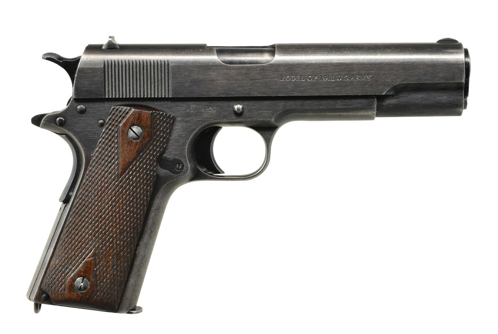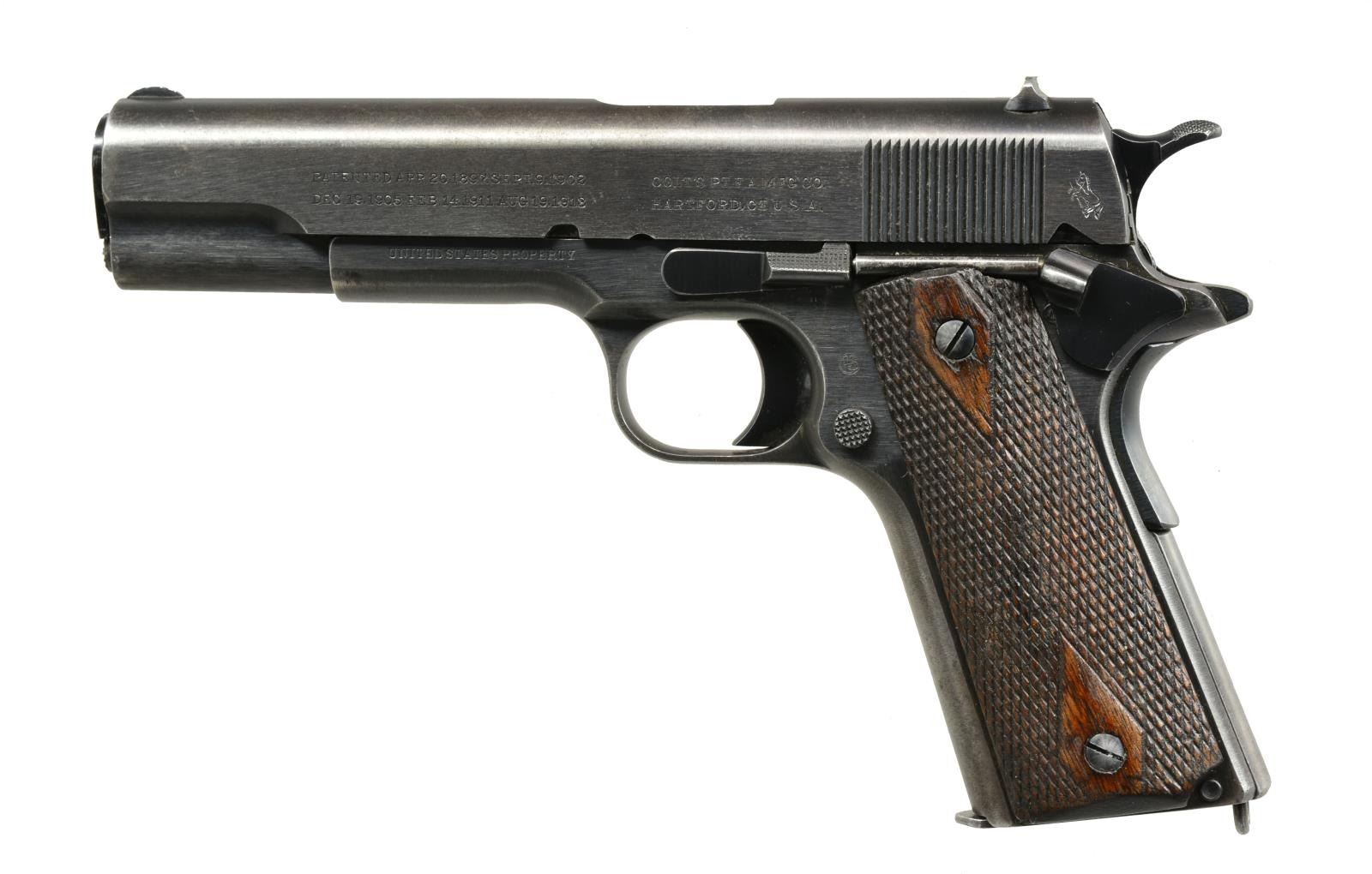 Cal. 45 ACP. S# 174620. Bbl. 5" w/ proper “P / H” markings on top. All sm. parts are correct. Left side of frame marked “UNITED STATES PROPERTY” & “GHS” inspector’s initials. Brushed blue finish. Checkered walnut grips w/ dbl. diamonds. 1917 Mfg. MAGS: 1 two tone 7 rd. w/ pinned base. UNATTACHED ACCESSORIES: consignor supplied typed note pertaining to the gun’s history stating that it belong to Army General C.O. Boetz from Appleton, Wisconsin. CONDITION: 80% lightly worn brushed blue finish showing carry & edge wear w/ scattered spots of freckling. Grips show wear & handling marks. Bore shows good rifling w/ sm. spots of pitting. (20-1951/DS). CURIO. $1,200-1,800.