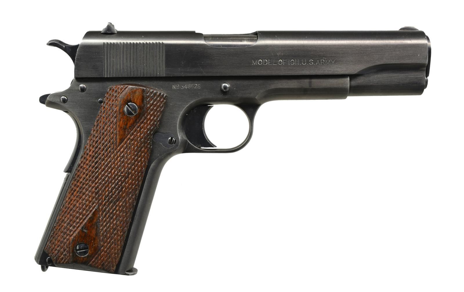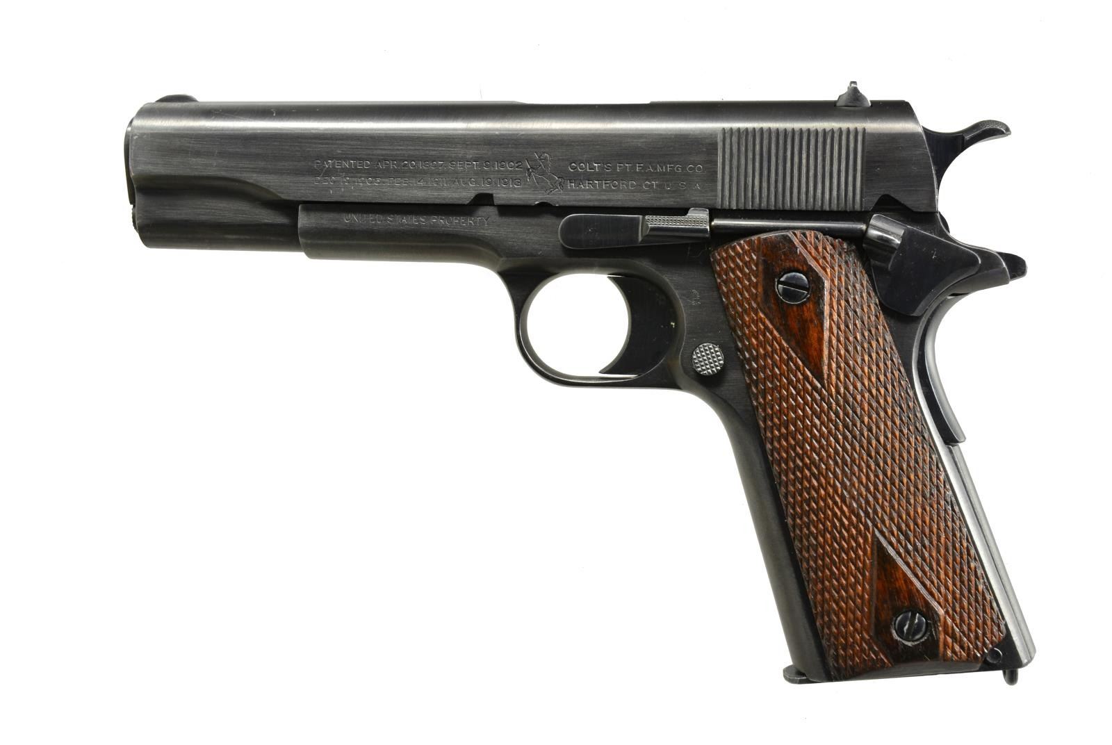 Cal. 45 ACP. S# 348628. Bbl. 5". Flat top U notch rear sight. Correct sm. parts. Left side of frame is marked "UNITED STATES PROPERTY" & eagle head / "S14" inspection mark. Checkered walnut diamonds grips. MAGS: 1 two tone 7 rd. w/ pinned base. UNATTACHED ACCESSORIES: repro. Model 1911 storage box w/ wax paper. CONDITION: over 95% brushed blue style refinished metal showing handling marks. Grips are refinished w/ freshened checkering. Bore has lightly worn rifling.(20-1949/DS). CURIO. $900-1,200.