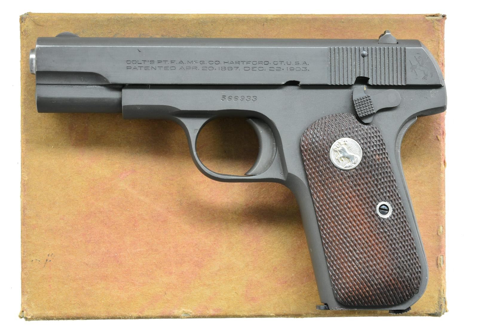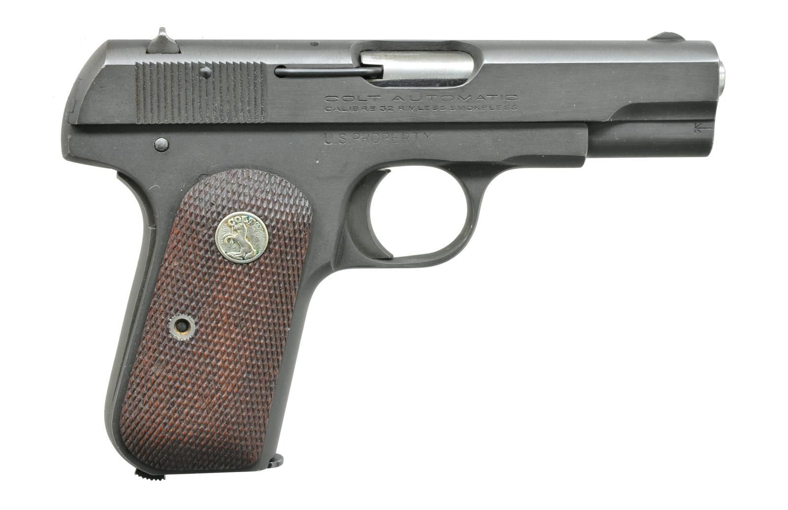 PISTOL. Cal. 32 ACP. S# 566933. Bbl. 3 3/4". Ramp front sight w/ square notch rear sight. Parkerized finish. Right side of frame is marked "U.S. PROPERTY". 2 Piece checkered walnut grips w/ Rampant Colt medallions. MAGS: 1 detachable 8 rd. UNATTACHED ACCESSORIES: Colt Mfg. Co. Inc. letter stating the following information "S# 566933 / Caliber: .32/c / Barrel Length: ---- / Finish: Parkerized / Type of Stocks: not listed / Sold to: United States Government / Shipped to Transportation Officer Springfield Armory Springfield, MA / Date of Shipment: December 30, 1944 / Number of Same Type Guns in Shipment: 1,583. / Records indicate this pistol was processed on Colt Factory Order Number 4711.". 2 Piece box w/ hand written S# containing instructions, magazine articles, cleaning rod & brush. CONDITION: 98% parkerizing showing light edge wear. Very good grips. Near excellent bore. (20-3293/DS). CURIO. $2,000-3,000.