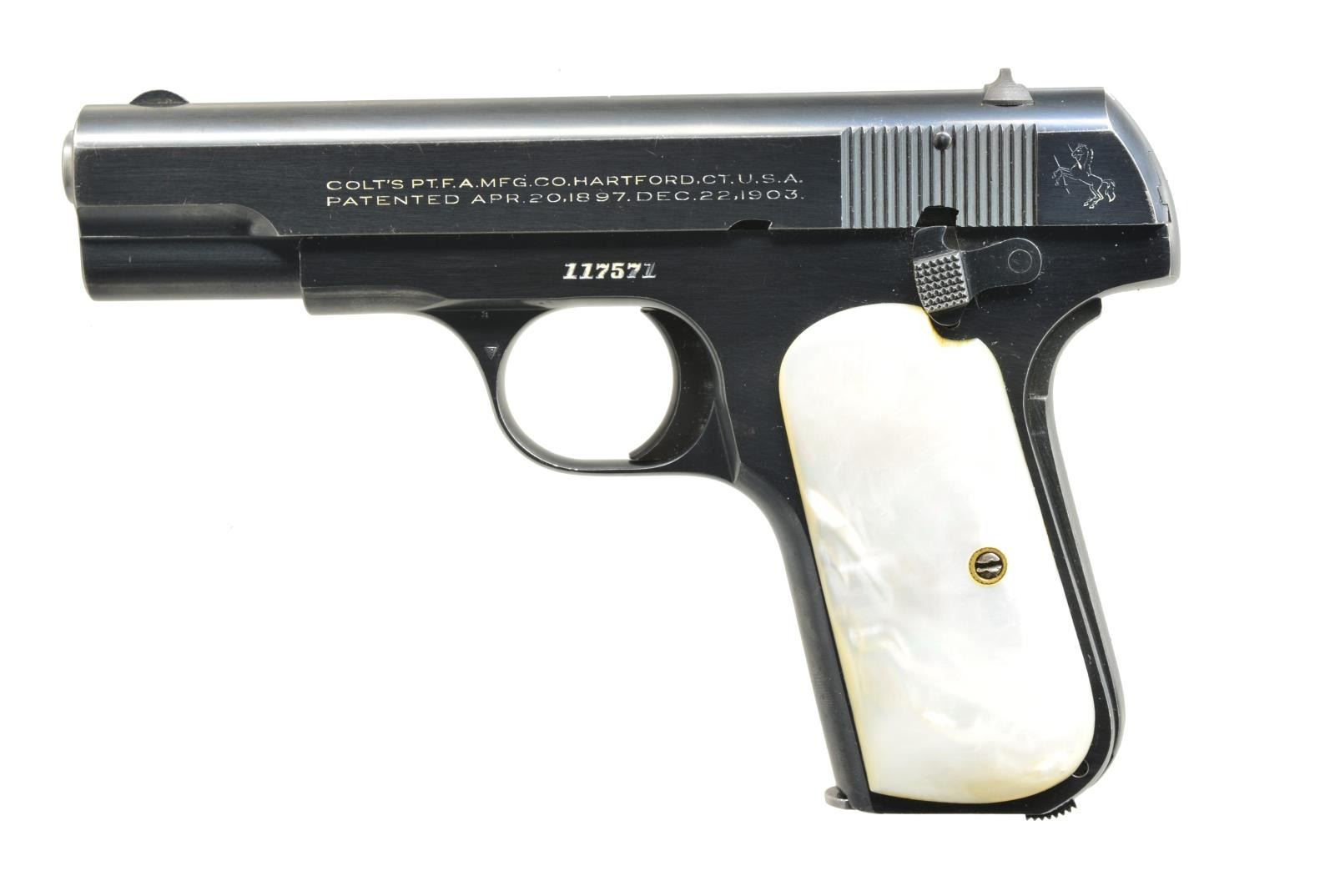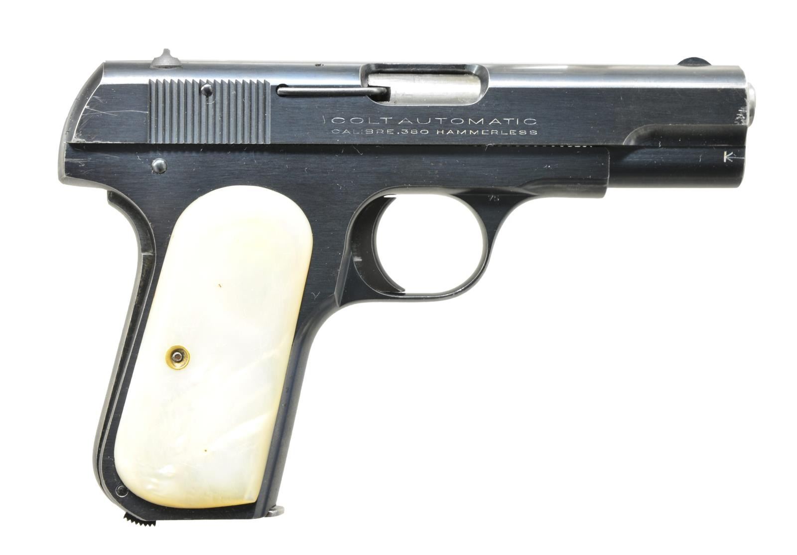 Cal. 380 ACP. S# 117571. Bbl. 3 3/4". Semi circular front sight & fixed square notch rear sight. Blue finish. 2 Piece pearl grips. 1935 Mfg. MAGS: 1 detachable 7 rd. CONDITION: 85% original blue showing edge & carry wear. Very good grips. Bright bore w/ strong rifling. (20-3213/DS). CURIO. $700-1,000.