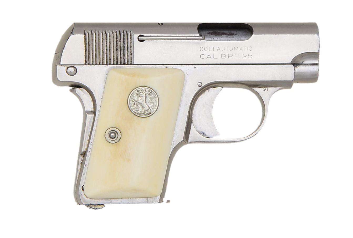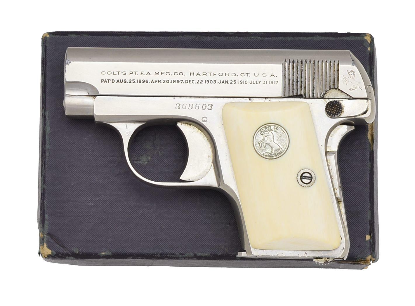 Cal. 25 ACP. S# 369603. Bbl. 2". Full nickel finish. 2 Piece ivory grips w/ silver Rampant Colt medallions. 1928 Mfg. MAGS: 1 detachable 6 rd. UNATTACHED ACCESSORIES: 1 piece box w/ proper label having a partially visible number on bottom. Box contains instructions, original cal. marked hang tag, & brush. CONDITION: over 95% nickel finish showing spots of flaking & sm. handling marks. Very good grips. Bore retains sound rifling. PROVENANCE: Collection of Alan Bradley Shepherd. (20-4048/DS). CURIO. $650-1,000.