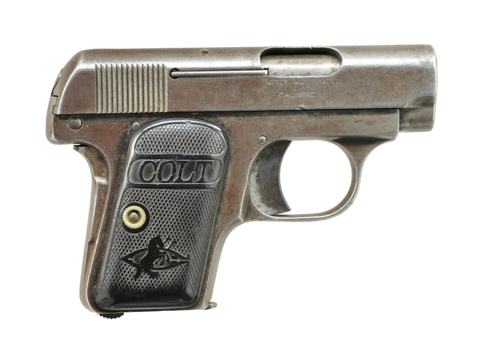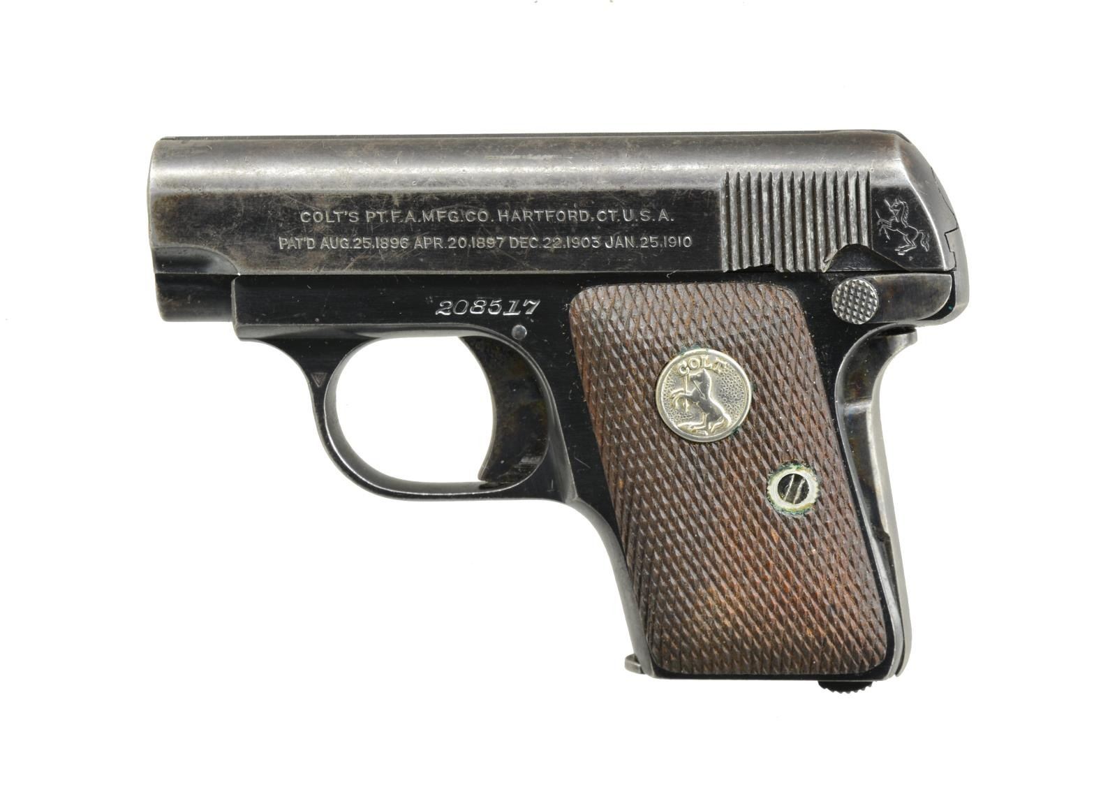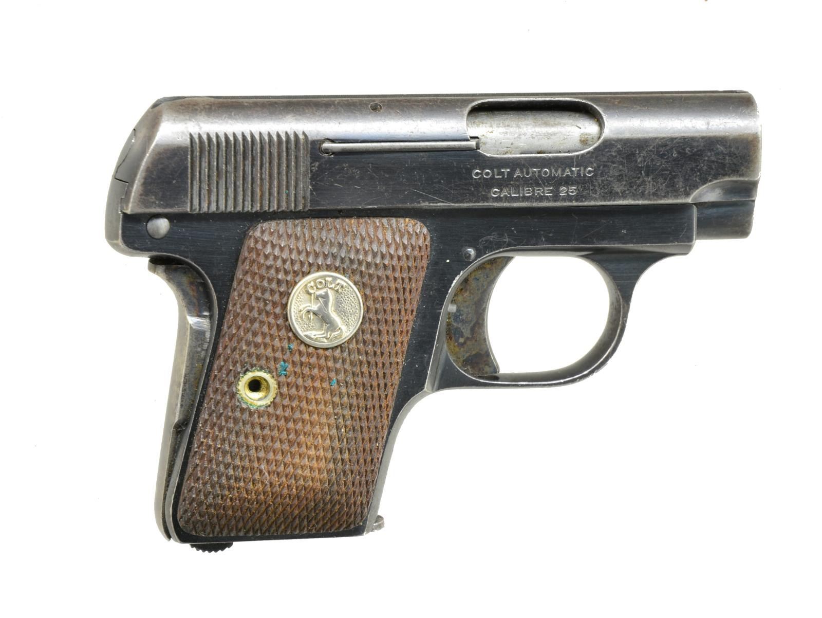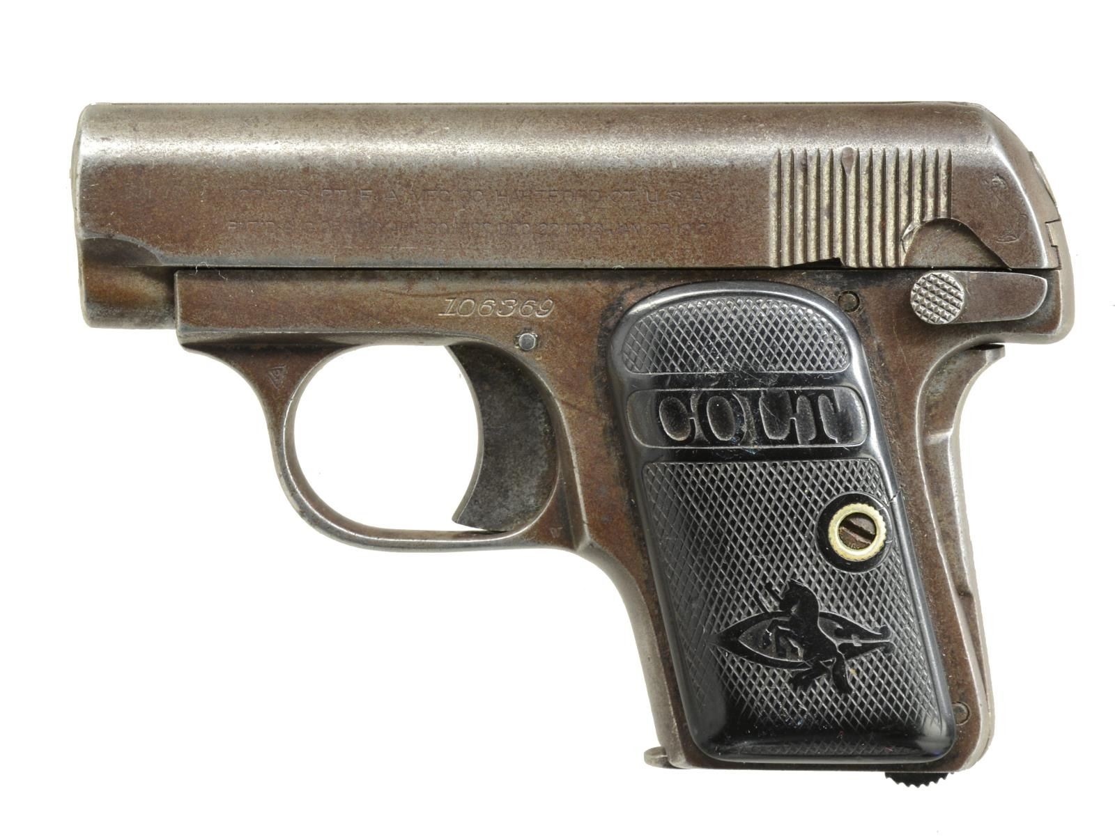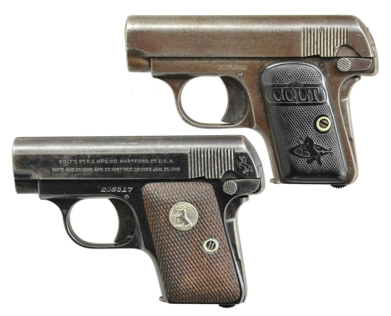 ALL: cal. 25 ACP. Bbls. 2". Blue finish w/ case colored triggers & safeties. MAGS: 1 detachable 6 rd. for each. 1) S# 106369. 2 Piece checkered hard rubber Rampant Colt grips. 1914 Mfg. CONDITION: metal finish has faded to mottled brown patina showing spots of light pitting & surface corrosion. Grips show heavy wear. Bore retains intact rifling. (20-4045/DS). 2) S# 208517. 2 Piece checkered walnut grips w/ Rampant Colt medallions. 1919 Mfg. CONDITION: 70% lightly faded metal finish showing spots of corrosion. Grips show light wear. Bore retains intact rifling. PROVENANCE: Collection of Alan Bradley Shepherd. (20-4046/DS). ALL CURIO. $700-1,000.