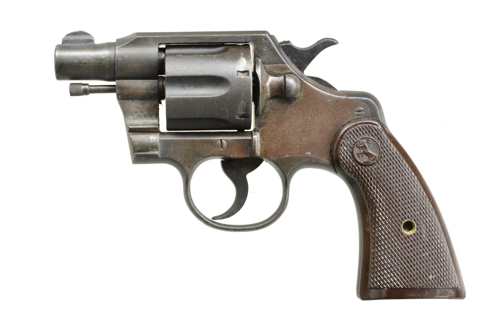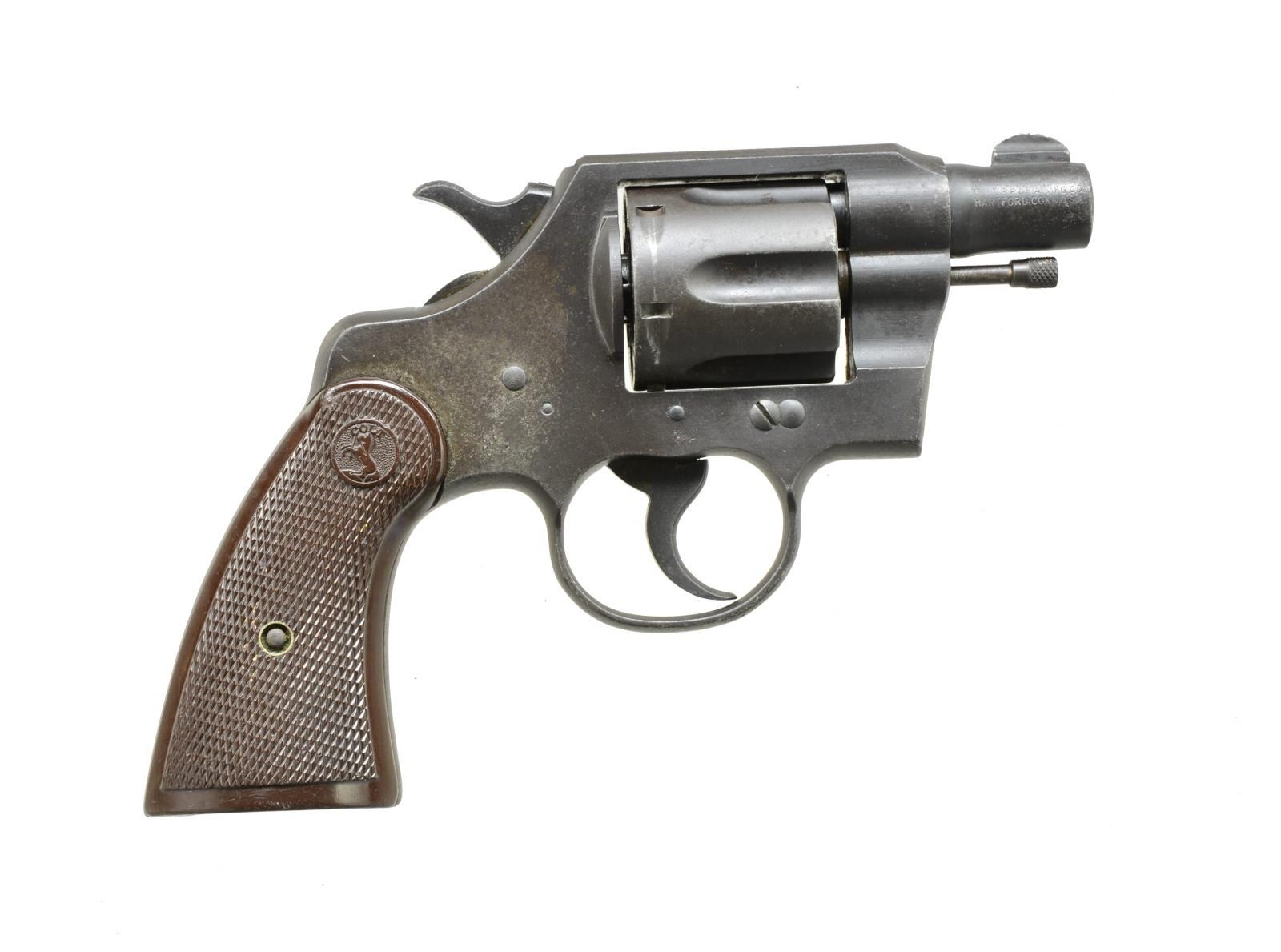 Cal. 38 Spl. S# 8814. Bbl. 2" w/ semi circular front sight. 6 Shot fluted cyl. Parkerized finish. Left side of frame has flaming bomb acceptance mark. 2 Piece checkered Coltwood grips. 1942 Mfg. CONDITION: 60% dull parkerizing fading to patina showing spots of light pitting. Grips show light wear & handling marks. Action binds in DA mode & will not cycle in SA mode. Bore retains strong rifling. (20-3347/DS). CURIO. $1,000-1,500.