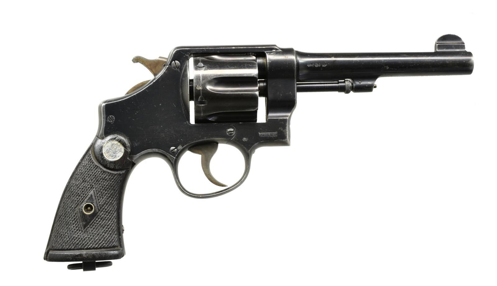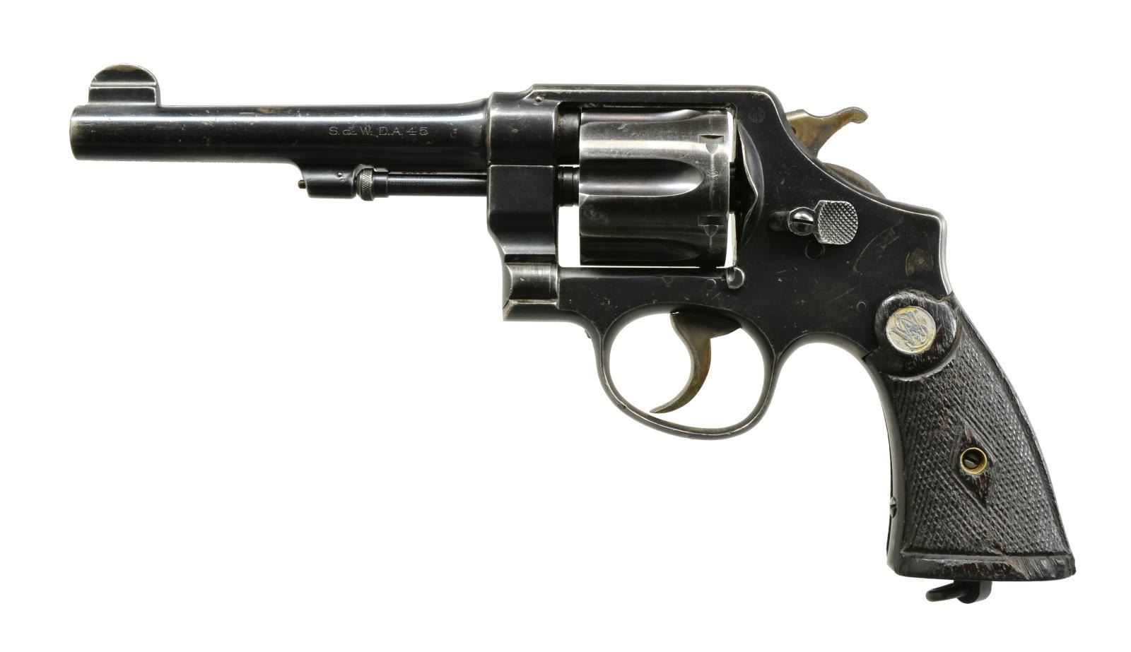 Cal. 45 ACP. S# 8302. Bbl. 5 1/2" w/ integral semi circular sight. 6 Shot fluted cyl. Blue finished 5 screw action w/ pinned bbl. Case colored hammer & trigger. Bbl. & frame has British proof marks. Right side of frame stamped "NOT ENGLISH MADE". 2 Piece checkered walnut diamond grips w/ silver S&W medallions. Butt has US Army markings & lanyard ring. CONDITION: 75% dull lightly faded blue showing edge wear w/ numerous scratches & sm. marks. Hammer & trigger retain a sm. amount of lightly visible case colors. Grips have age darkened appearance showing heavy wear, dents & handling marks. Good mechanics. Bore is generally bright retaining lightly worn rifling. (20-1490/DS). CURIO. $400-550.
