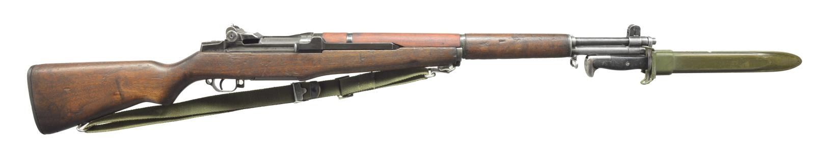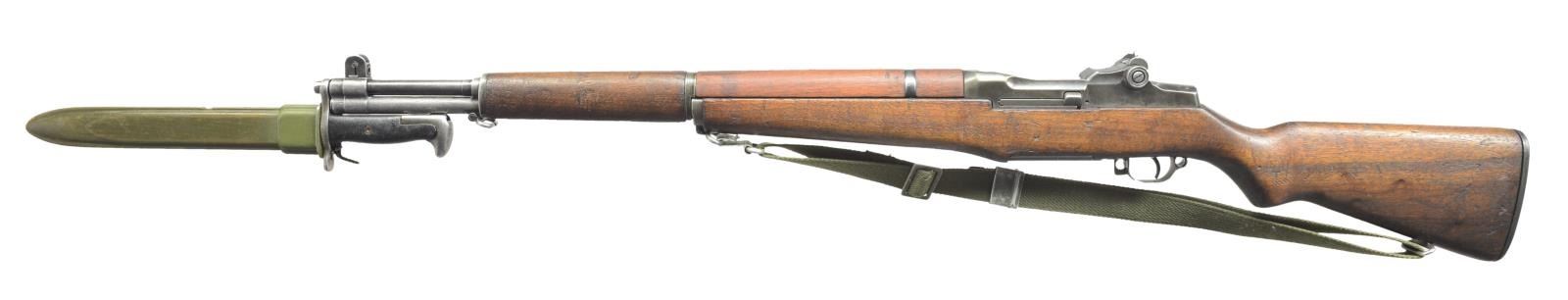 Cal. 30-06. S# 4787487. Bbl. 24" marked “S-A-3-47”. Throat gauges 2.0. Muzzle gauges 3.5. Bolt marking appears to be “SA”. Operating rod is unmarked. Flush nut rear sight. Blade front sight w/ protective ears. Cross slot gas cyl. lock screw. Trigger housing marked “WRA”. Hammer marked “SA”. Milled trigger guard. Walnut stock set. Tagged mounted inside bbl. channel in Danish, dated “3-2-71”. Stock has boxed “SA ?” on left side of pistol grip. Encircled “P” underneath grip. Number 2959607 at belly of stock. Rear handguard is later replacement. UNATTACHED ACCESSORIES: 1 9.75" forward blade bayonet marked on left ricasso w/ crown “FKF 1955”. Has grooved, plastic grips. Green plastic scabbard is unmarked. CONDITION: stock set has extensive wear, dents, staining & scratches throughout. Metal has turned mostly gray, retaining traces of original parkerized finish. Bayonet has wear, scratches & staining. Blade has been sharpened. Worn lands. Bore retains degree of shine. (20-1855/RW). CURIO. $600-800.