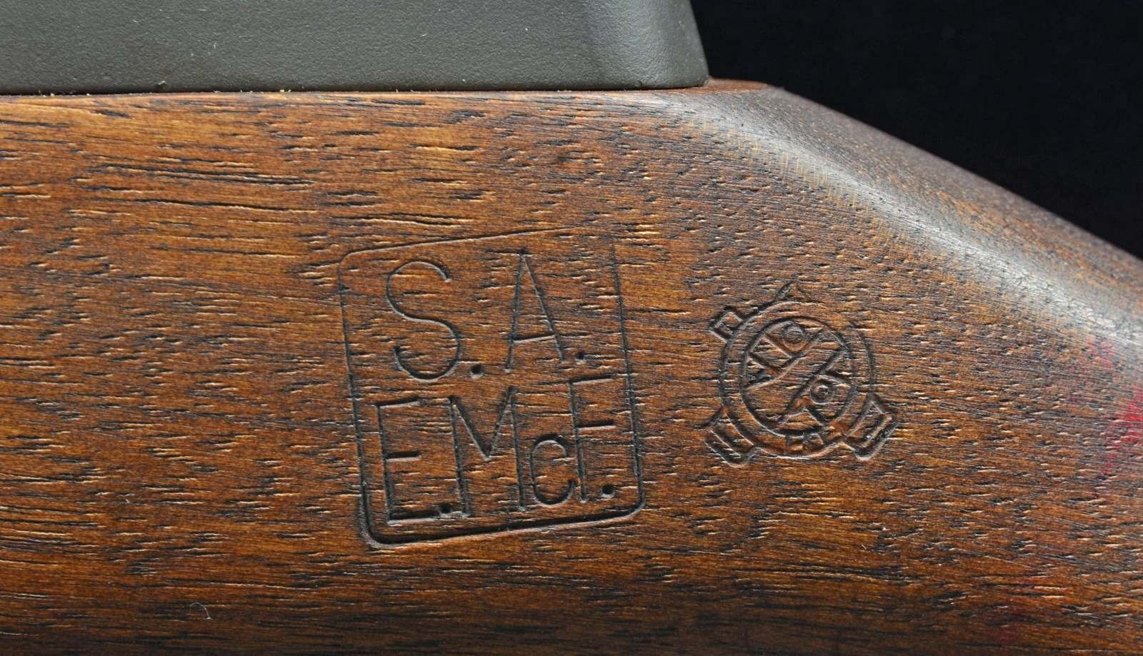 Cal. 30-06. S# 1675703. Bbl. 24". Import marked on left side of bbl. Nicely restored M1 Garand rifle. Bbl. marked “SA 10-51”. Throat gauges 1.0. Muzzle gauges 1.5. Bbl., bolt, Op Rod & hammer are marked “SA”. Trigger housing marked “WRA”. Windage knob marked “BME”. Flush nut aperture rear sight. Blade front sight w/ protective ears. Cross slot gas cyl. lock screw. Replacement walnut stock set marked w/ boxed “SA EMCF” & crossed cannons. CONDITION: stock set has very light wear & handling marks. Reparkerized metal has very light high point wear. Very good , shiny bore. (20-1804/RW). CURIO. $550-900.