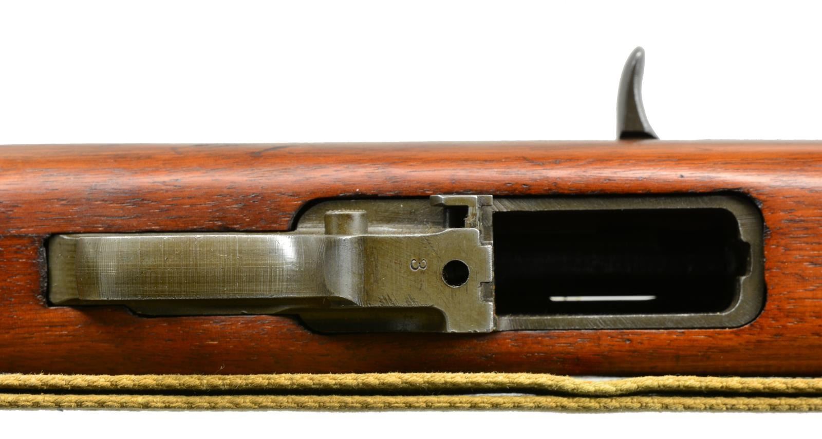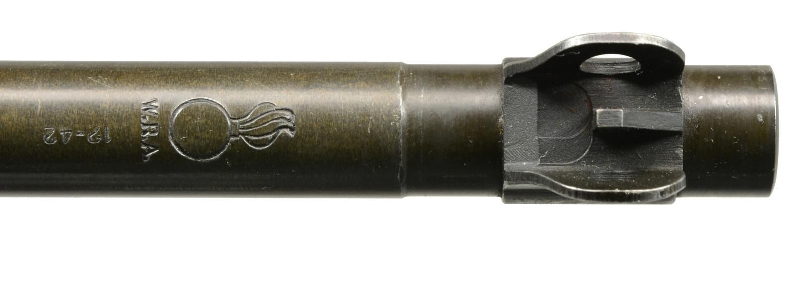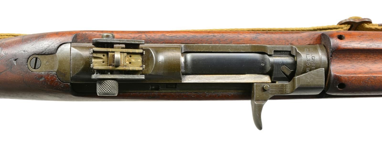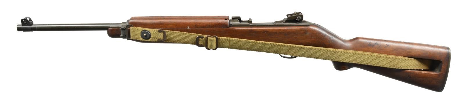 Cal. 30 Carb. S# 1016136. Bbl. 18". Rare early Winchester made carbine w/ very nice, attractive, original finish & crisp markings. Bbl. marked w/ flaming bomb, “W.R.A.”, & “12-42”. Also marked w/ Winchester proof. Adj. rear sight marked “I.R. Co” not staked in place. Blade front sight w/ protective ears. Bbl. band has wide swivel aperture. Early unmarked straight cut slide. Separate main spring housing. Milled trigger housing, marked “3” in front of trigger guard. Push button safety. Unmarked mag. release. Straight cut hammer is marked w/ encircled “B/R”. Flat cut bolt is unmarked. Matching walnut stock set. Buttstock has high wood w/ “I” cut sling slot. Encircled “P” proof under pistol grip. Right side of buttstock has crisp boxed “W.R.A.”, “GHD” & crossed cannons. Recoil plate is marked “W”. Unmarked bullnose handguard w/ 2 rivets. Early green web sling. CONDITION: stock set has very nice finish w/ moderate, scattered scratches & handling marks. Metal retains 80% original thinning parkerized finish w/ very light wear. Very good, shiny bore. (20-1930/RW). CURIO. $1,100-1,500.