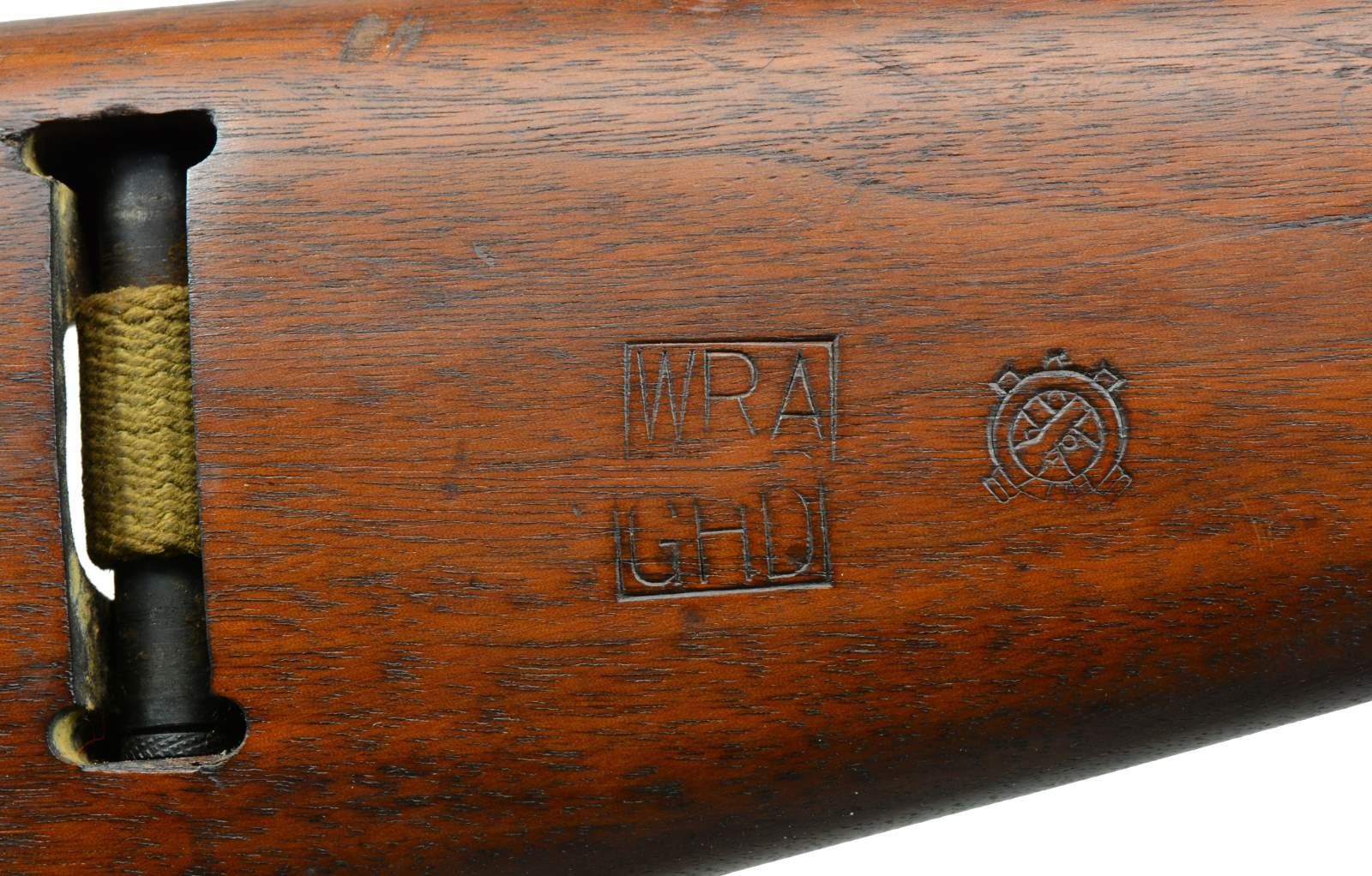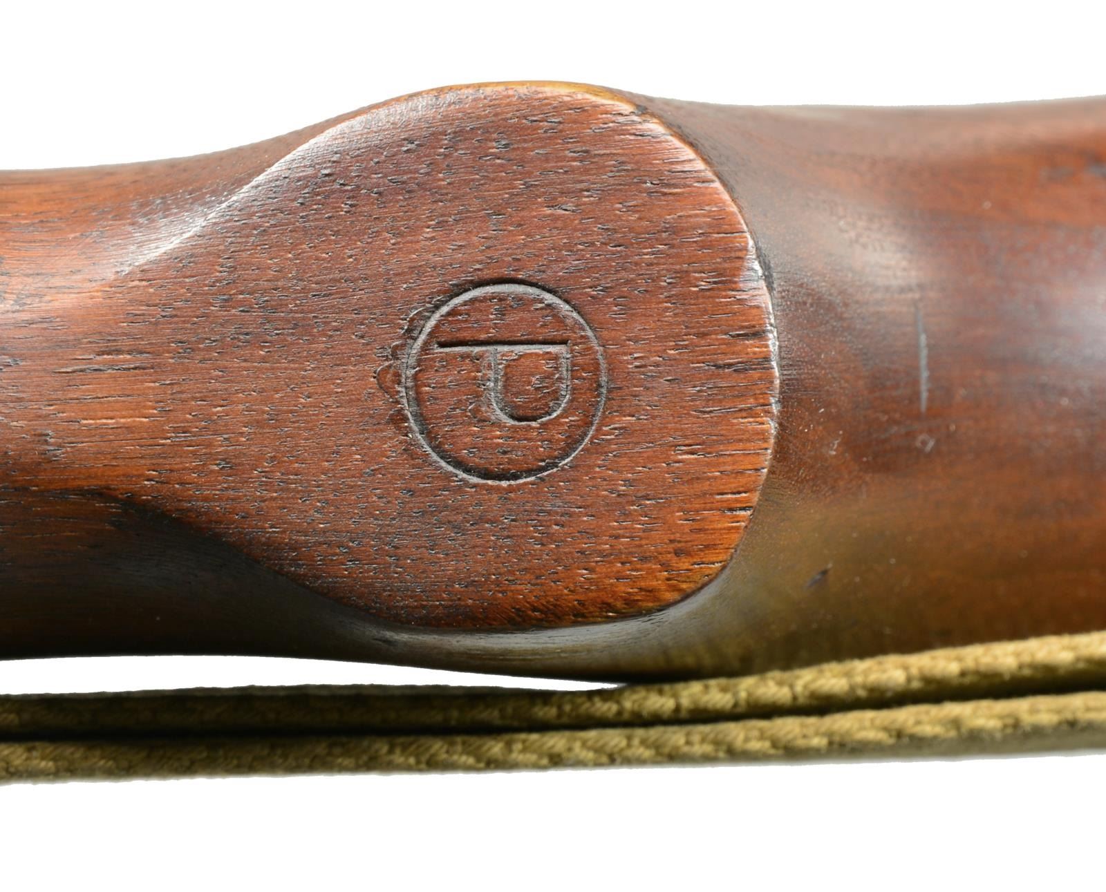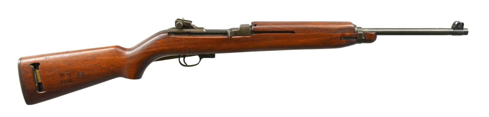 Cal. 30 Carb. S# 1016136. Bbl. 18". Rare early Winchester made carbine w/ very nice, attractive, original finish & crisp markings. Bbl. marked w/ flaming bomb, “W.R.A.”, & “12-42”. Also marked w/ Winchester proof. Adj. rear sight marked “I.R. Co” not staked in place. Blade front sight w/ protective ears. Bbl. band has wide swivel aperture. Early unmarked straight cut slide. Separate main spring housing. Milled trigger housing, marked “3” in front of trigger guard. Push button safety. Unmarked mag. release. Straight cut hammer is marked w/ encircled “B/R”. Flat cut bolt is unmarked. Matching walnut stock set. Buttstock has high wood w/ “I” cut sling slot. Encircled “P” proof under pistol grip. Right side of buttstock has crisp boxed “W.R.A.”, “GHD” & crossed cannons. Recoil plate is marked “W”. Unmarked bullnose handguard w/ 2 rivets. Early green web sling. CONDITION: stock set has very nice finish w/ moderate, scattered scratches & handling marks. Metal retains 80% original thinning parkerized finish w/ very light wear. Very good, shiny bore. (20-1930/RW). CURIO. $1,100-1,500.