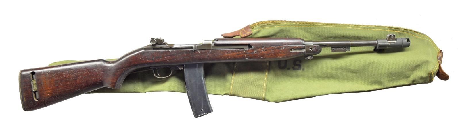 Cal. 30 Carb. S# 988474. Bbl. 18". marked behind front sight ”INLAND MFG. DIV GENDERAL MOTORS 9-43”. Milled adj. rear sight. Blade front sight w/ protective ears, marked “RIA”. Bbl. band marked “MMQ” w/ bayonet lug. Straight cut slide marked “SG”. Unmarked rnd. bolt. Milled trigger housing marked “INLAND”. Push button safety marked “EPB”. Straight cut hammer marked “HI”. Low wood oval cut walnut stock marked w/ faint crossed cannons on right side of butt. 2 Rivet handguard marked “LWB”. Green web sling. Detachable reproduction recoil check. MAGS: 1 unmarked 30 rd. UNATTACHED ACCESSORIES: green canvas carrying case, marked “M. D. MFG. CO. 1944”. 1-6 5/8" blade bayonet. Cross guard marked “K-M4”. Plastic & canvas scabbard marked “US M8A1”. Bayonet & scabbard in lightly worn condition. CONDITION: stock has well worn original finish w/ dents, staining & scratches throughout. Metal retains 70% original parkerized finish w/ thinning, wear & scratches. Very good, shiny bore. (20-1876/RW). CURIO. $600-800.