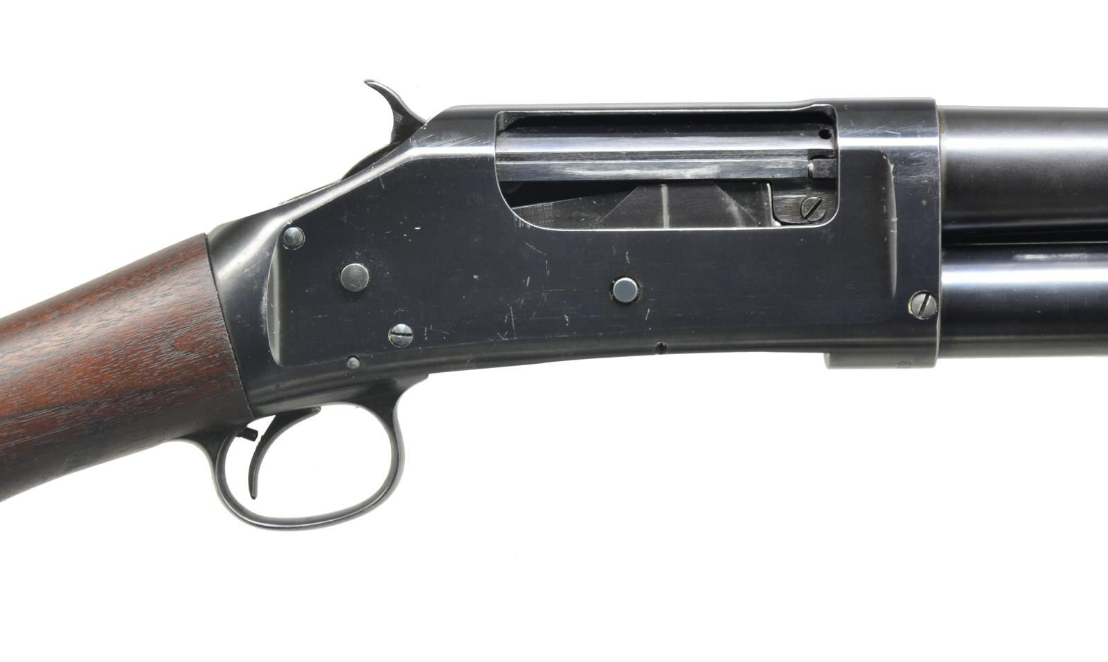 Cal. 12 Ga., 2 3/4". S# 687856. Bbl. 20" cyl. bore. Solid frame action. Commercial model w/out military marks. 6 Row handguard & bayonet lug. Grooved walnut pump handle. Pistol grip walnut stock w/ sling swivel & original buttplate having a brass ID tag marked "62" in toeline. UNATTACHED ACCESSORIES: Winchester marked 1917 bayonet w/ scabbard. Bayonet retains 30% fading parkerized finish w/ rust at hilt. Wood grips have age darkened appearance. CONDITION: over 90% original blue showing scattered scratches, marks & spots of corrosion. Wood has good finish showing light marks. Stock has sm. cracks extending from action w/ chip at bottom of grip. Very good bright bore. (20-3373/DS). CURIO. $2,000-2,750.