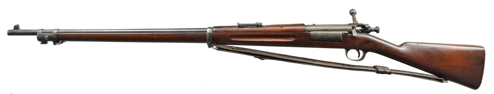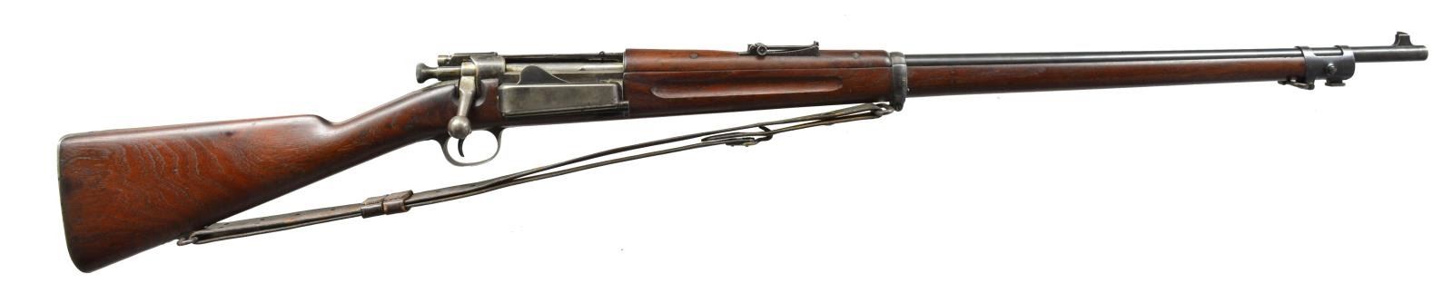 Cal. 30-40 Krag. S# 5475. Bbl. 30". Receiver made w/ extended bolt seat. Fitted w/ Model 1896 rear sight, graduated to 1800yds. Blade front sight. Walnut stock & handguard. Stock is unmarked except for faint, encircled script “P” underneath grip. Smooth trap buttplate w/ curved toe. Stock has flared bolt handle recess. Cleaning rod cut filled w/ walnut. Model 1898 unmarked Krag sling w/ 1 brass hook & dbl. ended stud. CONDITION: stock set has been lightly cleaned w/ very light wear & handling marks. Handguard has sm. crack behind front, left rivet. Metal has 50% thinning blue & turning mottled gray on action parts. Very good, shiny bore w/ sharp lands. (01-17944/RW). ANTIQUE. $800-1,200.