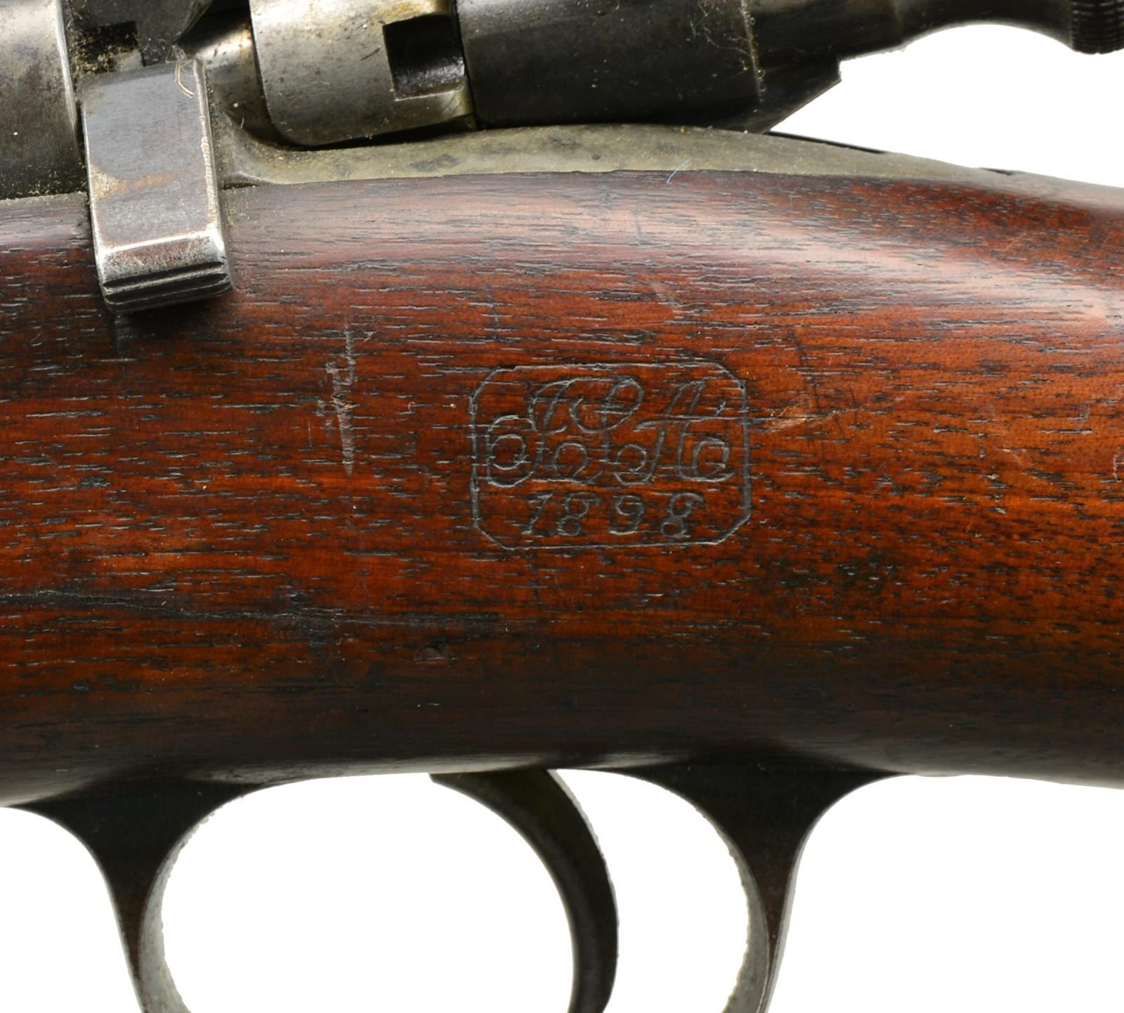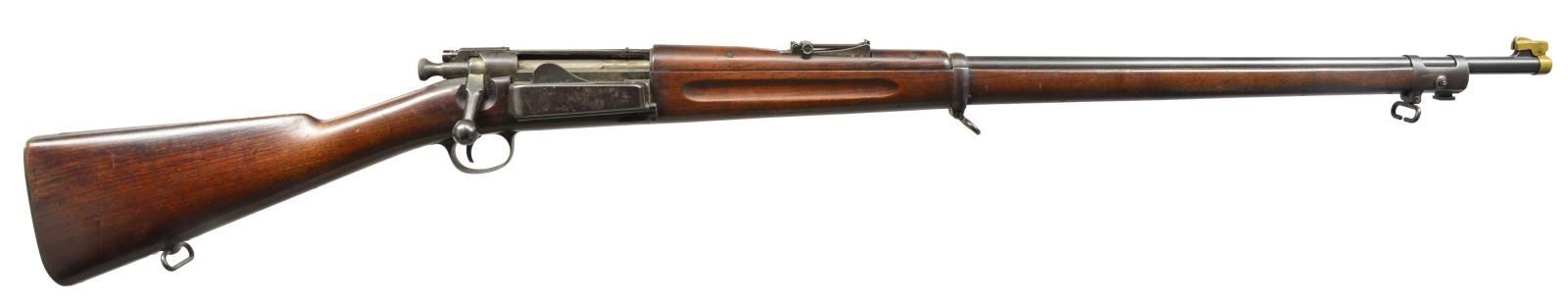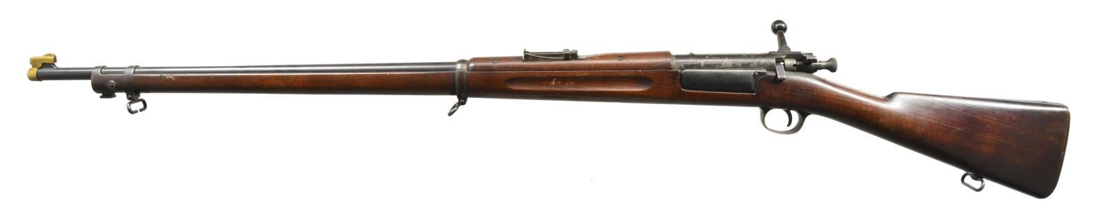 Cal. 30-40 Krag. S# 96604. Bbl. 30". Nice, correct example of 1896 Model Krag. Model 1896 ladder rear sight graduated to 1800yds. Blade front sight. Walnut stock set w/ smooth trap buttplate. Stock marked on left side w/ boxed “JSA 1898” & marked under grip w/ circle script “P”. UNATTACHED ACCESSORIES: 1 Model 1900 bronze sight cover. CONDITION: stock retains very lg. percentage of original finish w/ light wear, scattered scratches & handling marks. Metal has 75% original blue finish. Bands turning patina. Action parts have mottled appearance. Very good, shiny bore. (01-17941/RW). ANTIQUE. $700-1,000
