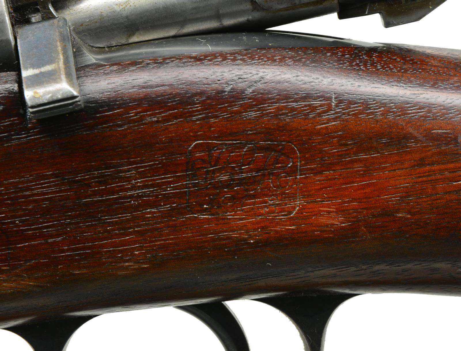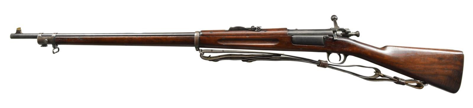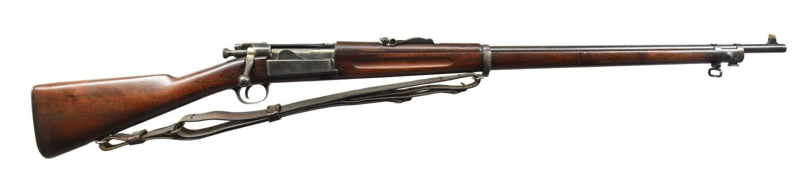 Cal. 30-40 Krag. S# 474376. Bbl. 30". Model 1902 rear sight w/ sliding peep. Right & left side notches have been removed. Tangent sight has been graduated to 2000yds. Blade front sight. Blade & rear of sight have been enhanced w/ brass colored plating. Walnut stock set w/ smooth trap buttplate. Stock marked on left side w/ crisp boxed “JSA”, “1903” & marked underneath pistol grip w/ script circle “P” proof. Well worn Model 1907 sling dated 1917. CONDITION: stock set has original finish w/ light wear, scattered scratches & handling marks. Metal retains 75% original blue finish w/ thinning, wear & scattered sm. spots of oxidation. Fair bore is shiny w/ well worn lands. (20-1885/RW). CURIO. $500-800.