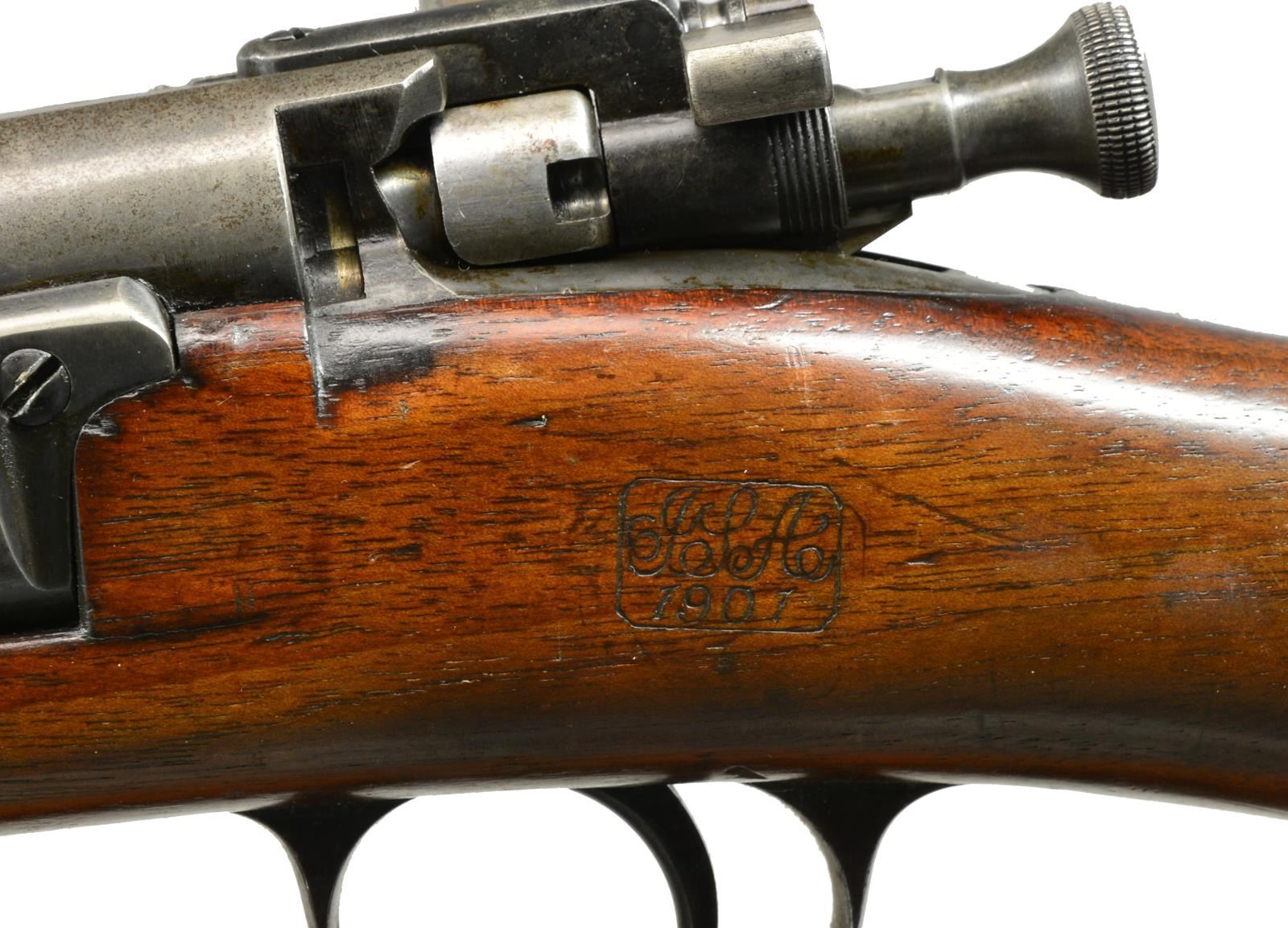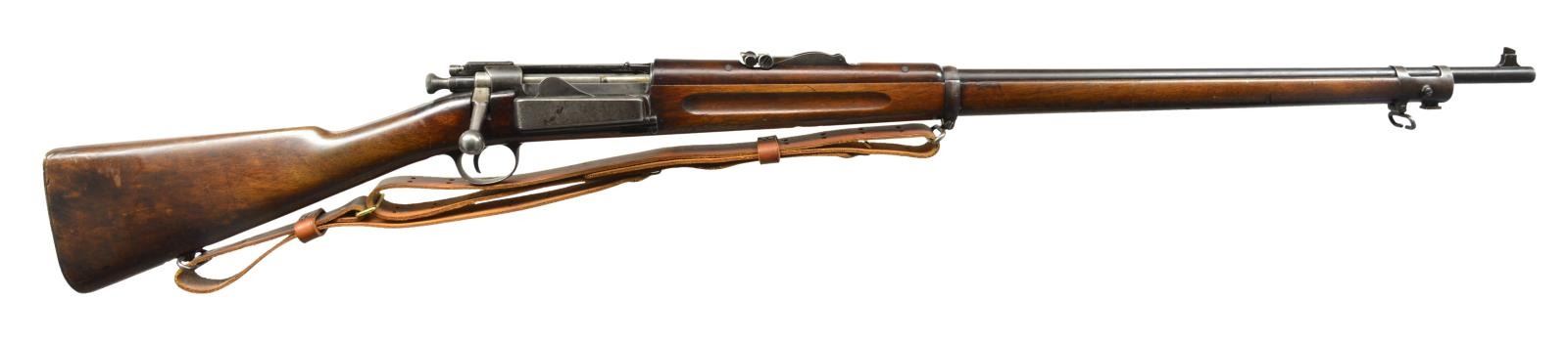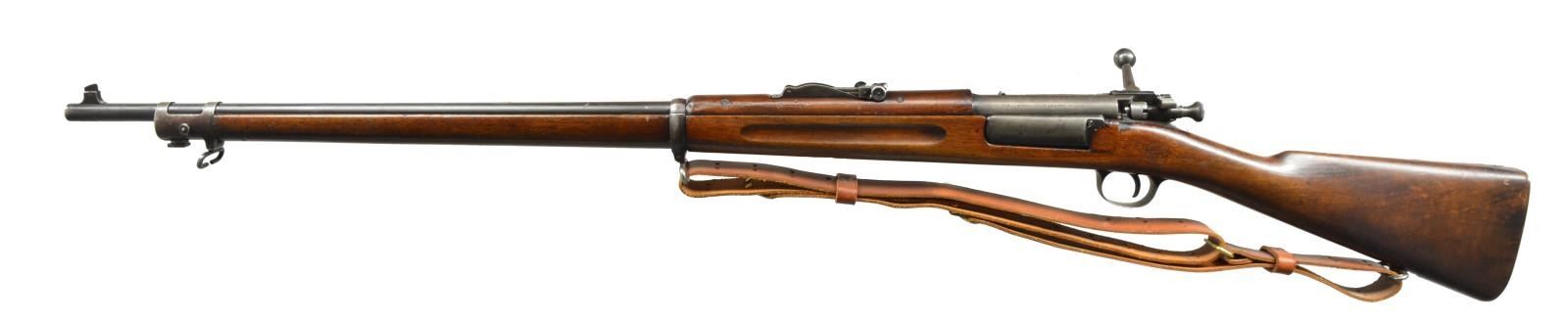 Cal. 30-40 Krag. S# 301144. Bbl. 30". Model 1902 rear sight, sliding peep has been removed & graduated to 2000yds. Blade front sight. Walnut stock set w/ crisp markings including boxed “JSA”, “1901” on left side & encircled scrip “P” underneath grip. Smooth, trap buttplate contains original 3 section cleaning rod. Uncle Mike’s military style sling. CONDITION: stock set has moderate wear & scattered handling marks throughout. Notable sm. crack at heel by buttplate tang. Metal has 50% original finish turning gray w/ scattered sm. spots of oxidation. Notable knick in bbl. approx. 3" ahead of lower band. Fair bore w/ worn lands. (20-1886/RW). CURIO. $500-700.