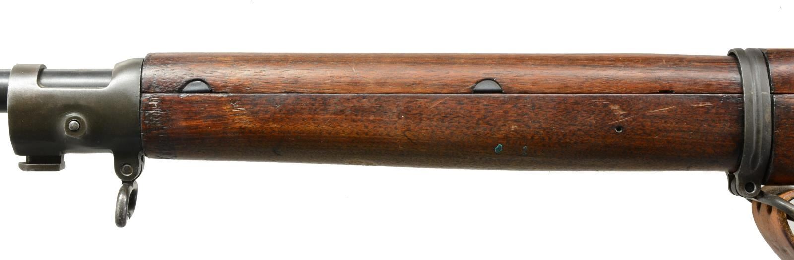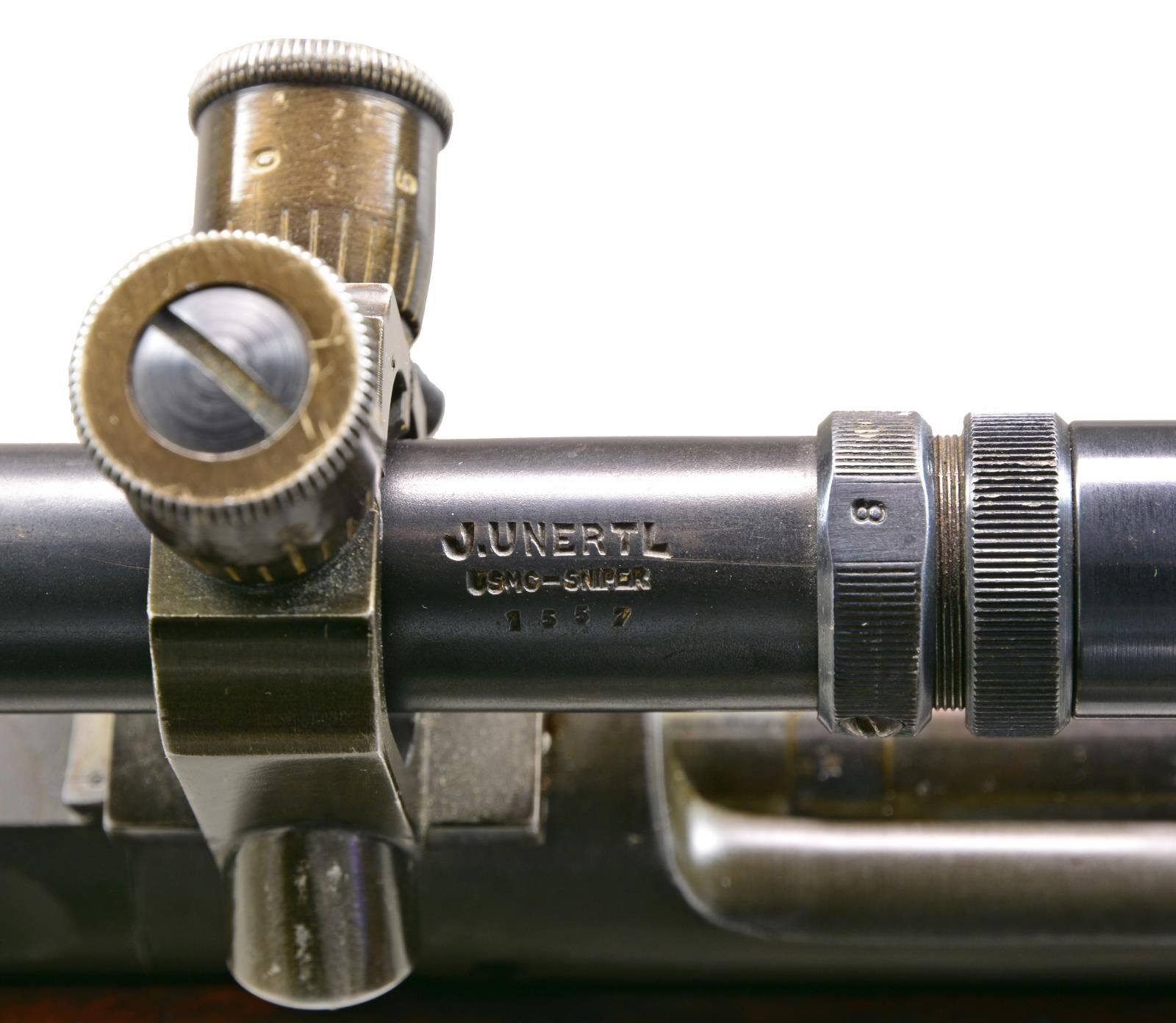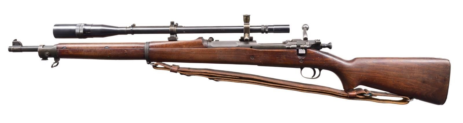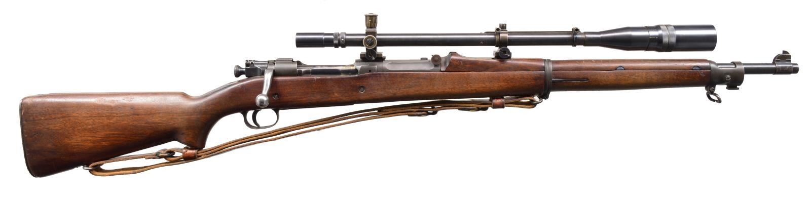 W/ USMC MARKED UNERTL SCOPE. Cal. 30-06. S# 1496946. Bbl. 24". Very rare US Marine Corp sniper rifle with correct Unertl scope. Receiver serial number indicates post 1934 production & would be correct for barrel date. Star gauged barrel marked “SA”, flaming bomb, & “8-38”. Receiver has very shallow punch mark on top of right rail approx. 1.5" behind receiver rank as would be correct for National Match rifles. Receiver has gas escape hole (Hatcher Hole). Rear sight is not present in sight base, but rifle retains flat windage knob. Blade front sight. Rifle is fitted with scope blocks. Cut off is marked “-3” w/ block letters. Blued bolt is marked on top “NS” & marked underneath with punch mark & “Z”. Blued extractor has gas escape hole. National Match type serrated trigger. Rear sight base is marked on right side “C 63934” below stock line. Walnut “C” type stock has 2 recoil bolts marked only with “S” in cut out recess. Stock has added “USMC” & “23” on right side of butt parallel with buttplate. All milled furniture with deep checkered national match type buttplate. Handguard mortise for scope base measures approx. 1 1/16x5/8". Handguard cut appears professionally modified, however scope base mortise has less workmanlike appearance & is of smaller dimensions than those given in reference works. Approximately 1/8" hole drilled behind front scope block surrounded by shallow, circular scratches. Handguard marked on inside with “79” no chalked assembler’s initials. Unmarked 1907 Military type sling. Nickel plated oiler in butt. Unertl 8 power externally adjustable telescopic sight w/ adjustable objective. Blue steel scope tube is marked ahead of adjustable ring “J. UNERTL USMC-SNIPER” & “1557” serial number. Adjustable ring marked w/ “8”, which indicates the power of the telescope. Scopes were not fitted with recoil springs as it was felt that the possibility of sand from beaches would cause undue wear. Scope has fine crosshair. Scope mounts are dark, anodized duralumin. CONDITION: stock set has light to moderate wear, staining, & handling marks commensurate with careful service. Stock tip has large missing chip under left side of upper band. Forend tip has been modified with the addition of 2 holes, as if an attempt was made to provide a cleaning rod. Barrel retains 75% lightly worn thinning blue with scattered spots of missing finish. Receiver has 75% worn, thinning original gray Parkerized finish. Rails have been polished. Bolt retains approximately 50% of thinning, worn blue. Balance of metal retains 60% thinning Parkerization with light wear, & scattered scratches. Barrel has wrench marks between "P" proof & rear sight base visible when handguard is removed. Front sight base has notable scratches from detachable sight cover which is not present. Replacement floorplate turning patina. Scope optics are slightly cloudy & horizontal crosshair has slight distortion. Main tube has 75% of original finish with thinning & light wear, scattered scratches with small spots of missing finish. Ocular & objective bells have arsenal type refinished. Very good shiny bore with lightly worn lands. (20-1796/RW). CURIO. $9,000-14,000.