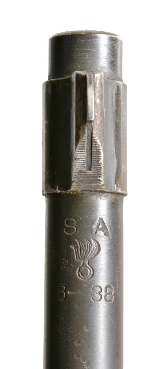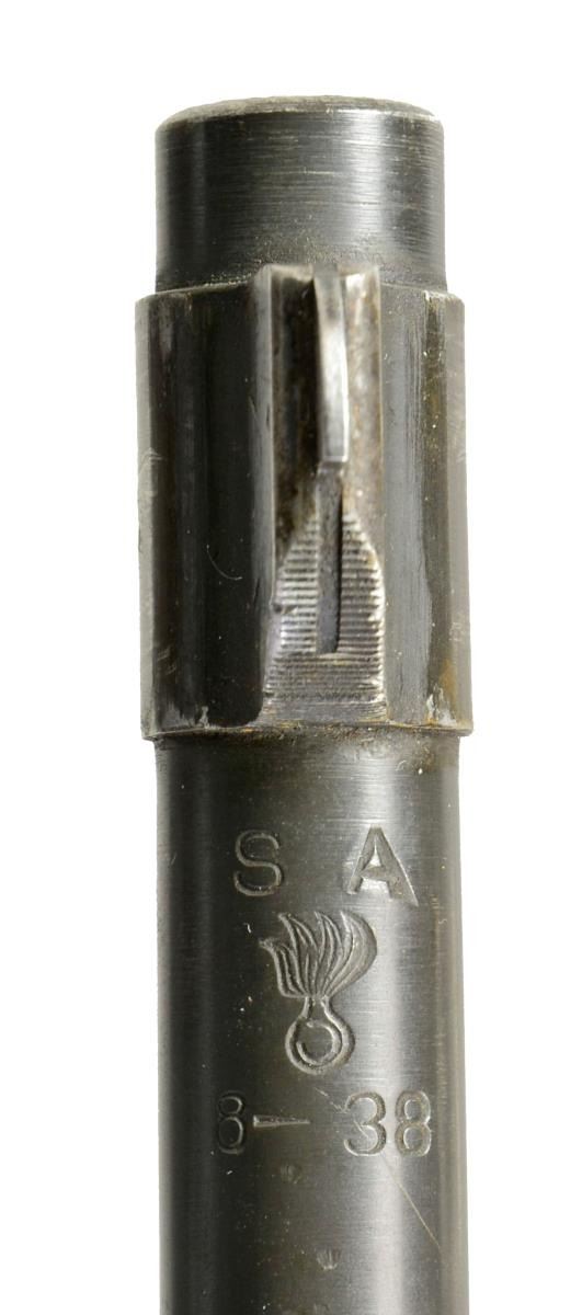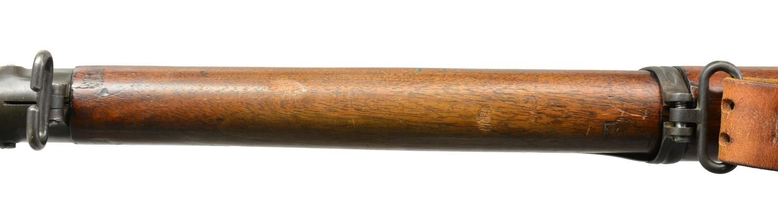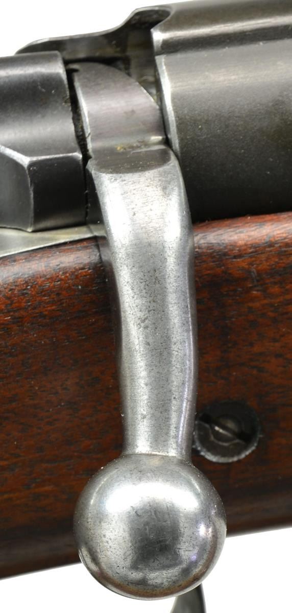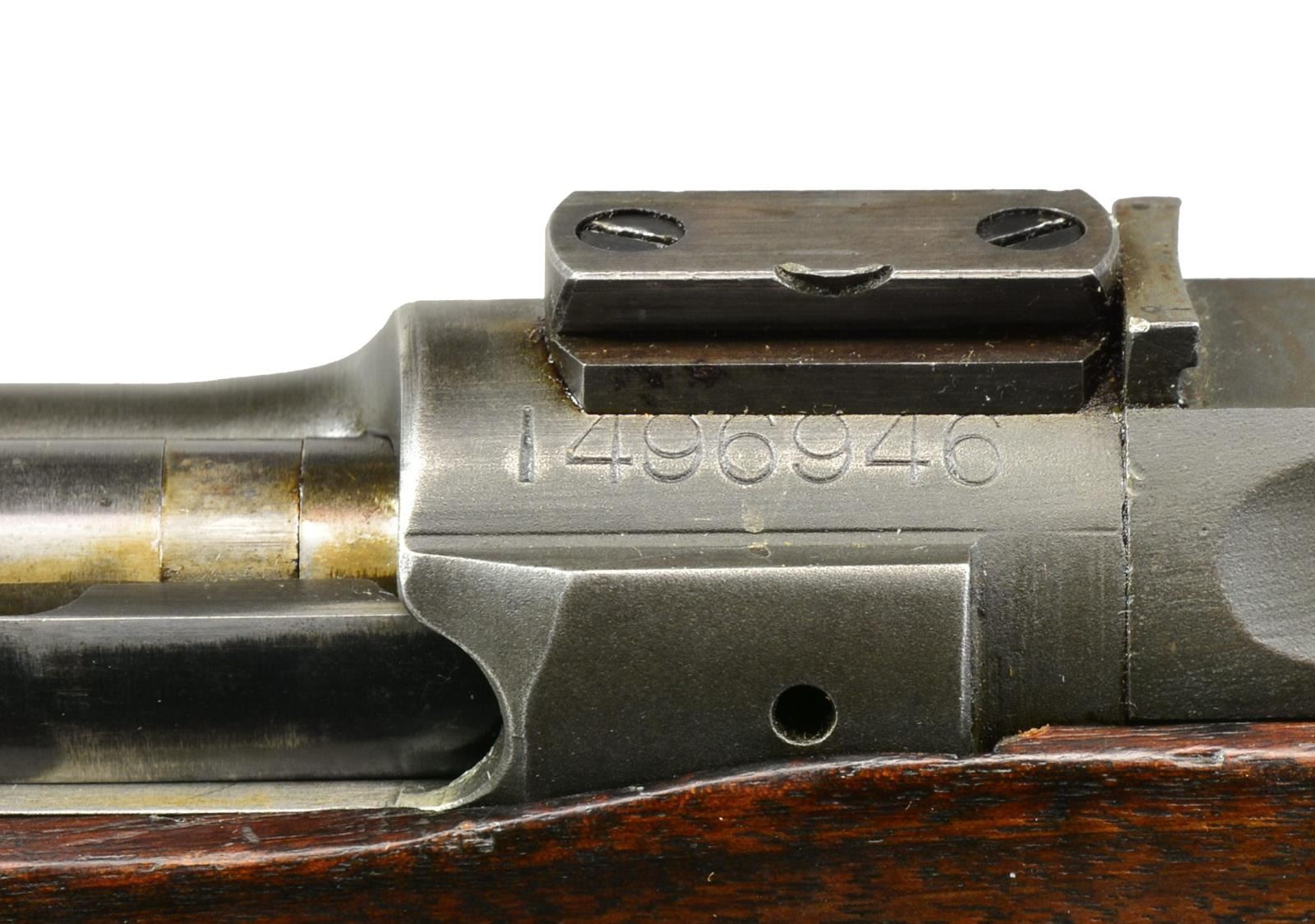 W/ USMC MARKED UNERTL SCOPE. Cal. 30-06. S# 1496946. Bbl. 24". Very rare US Marine Corp sniper rifle with correct Unertl scope. Receiver serial number indicates post 1934 production & would be correct for barrel date. Star gauged barrel marked “SA”, flaming bomb, & “8-38”. Receiver has very shallow punch mark on top of right rail approx. 1.5" behind receiver rank as would be correct for National Match rifles. Receiver has gas escape hole (Hatcher Hole). Rear sight is not present in sight base, but rifle retains flat windage knob. Blade front sight. Rifle is fitted with scope blocks. Cut off is marked “-3” w/ block letters. Blued bolt is marked on top “NS” & marked underneath with punch mark & “Z”. Blued extractor has gas escape hole. National Match type serrated trigger. Rear sight base is marked on right side “C 63934” below stock line. Walnut “C” type stock has 2 recoil bolts marked only with “S” in cut out recess. Stock has added “USMC” & “23” on right side of butt parallel with buttplate. All milled furniture with deep checkered national match type buttplate. Handguard mortise for scope base measures approx. 1 1/16x5/8". Handguard cut appears professionally modified, however scope base mortise has less workmanlike appearance & is of smaller dimensions than those given in reference works. Approximately 1/8" hole drilled behind front scope block surrounded by shallow, circular scratches. Handguard marked on inside with “79” no chalked assembler’s initials. Unmarked 1907 Military type sling. Nickel plated oiler in butt. Unertl 8 power externally adjustable telescopic sight w/ adjustable objective. Blue steel scope tube is marked ahead of adjustable ring “J. UNERTL USMC-SNIPER” & “1557” serial number. Adjustable ring marked w/ “8”, which indicates the power of the telescope. Scopes were not fitted with recoil springs as it was felt that the possibility of sand from beaches would cause undue wear. Scope has fine crosshair. Scope mounts are dark, anodized duralumin. CONDITION: stock set has light to moderate wear, staining, & handling marks commensurate with careful service. Stock tip has large missing chip under left side of upper band. Forend tip has been modified with the addition of 2 holes, as if an attempt was made to provide a cleaning rod. Barrel retains 75% lightly worn thinning blue with scattered spots of missing finish. Receiver has 75% worn, thinning original gray Parkerized finish. Rails have been polished. Bolt retains approximately 50% of thinning, worn blue. Balance of metal retains 60% thinning Parkerization with light wear, & scattered scratches. Barrel has wrench marks between "P" proof & rear sight base visible when handguard is removed. Front sight base has notable scratches from detachable sight cover which is not present. Replacement floorplate turning patina. Scope optics are slightly cloudy & horizontal crosshair has slight distortion. Main tube has 75% of original finish with thinning & light wear, scattered scratches with small spots of missing finish. Ocular & objective bells have arsenal type refinished. Very good shiny bore with lightly worn lands. (20-1796/RW). CURIO. $9,000-14,000.